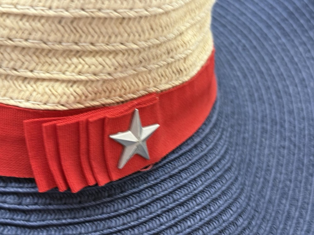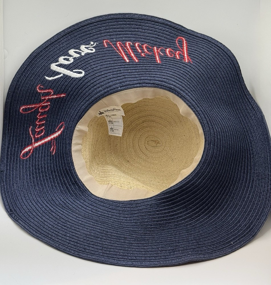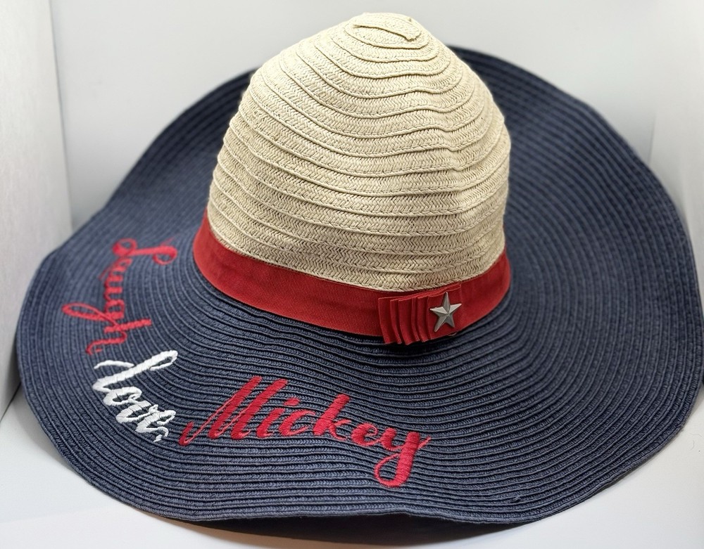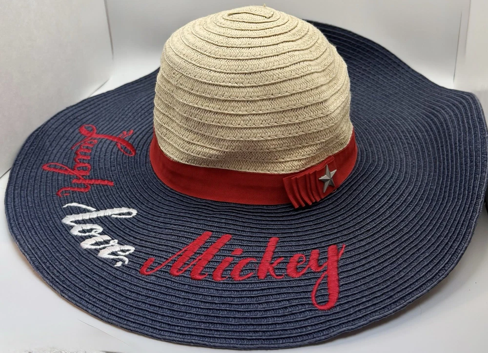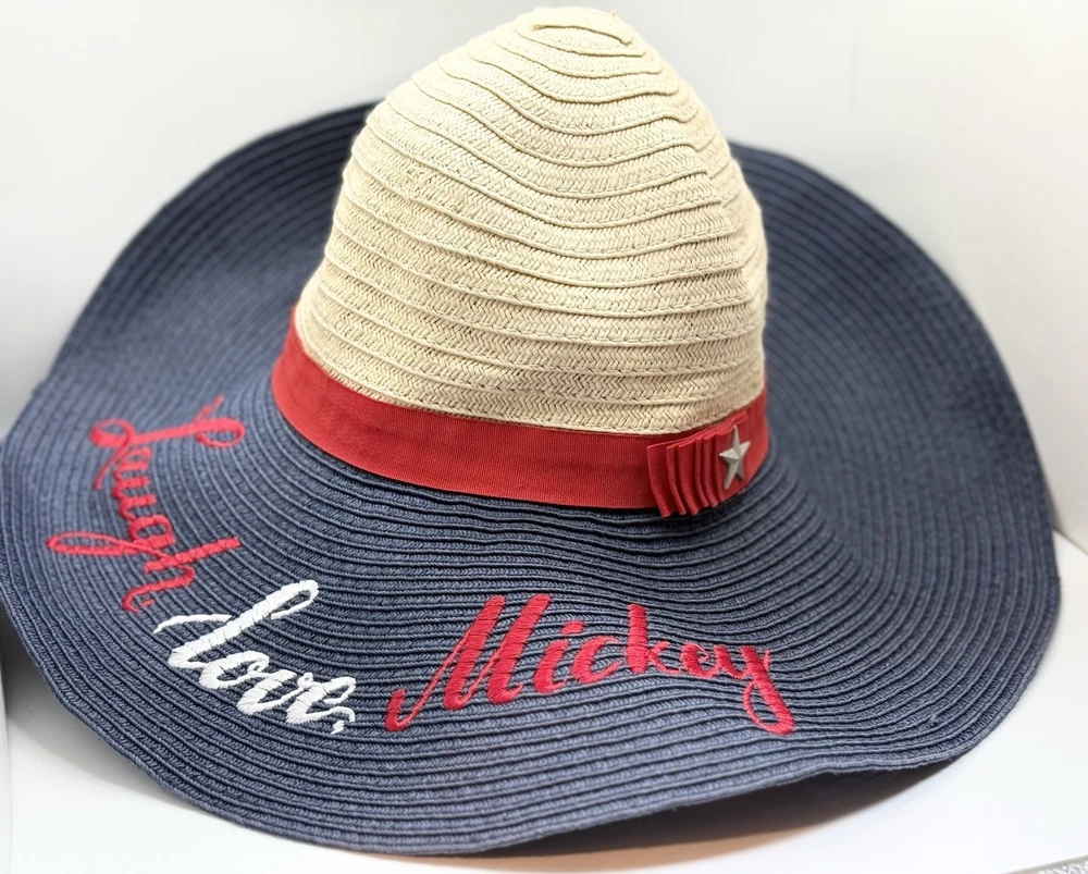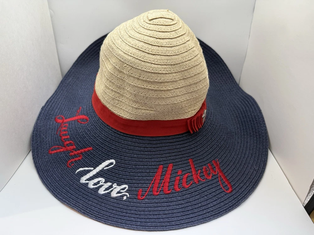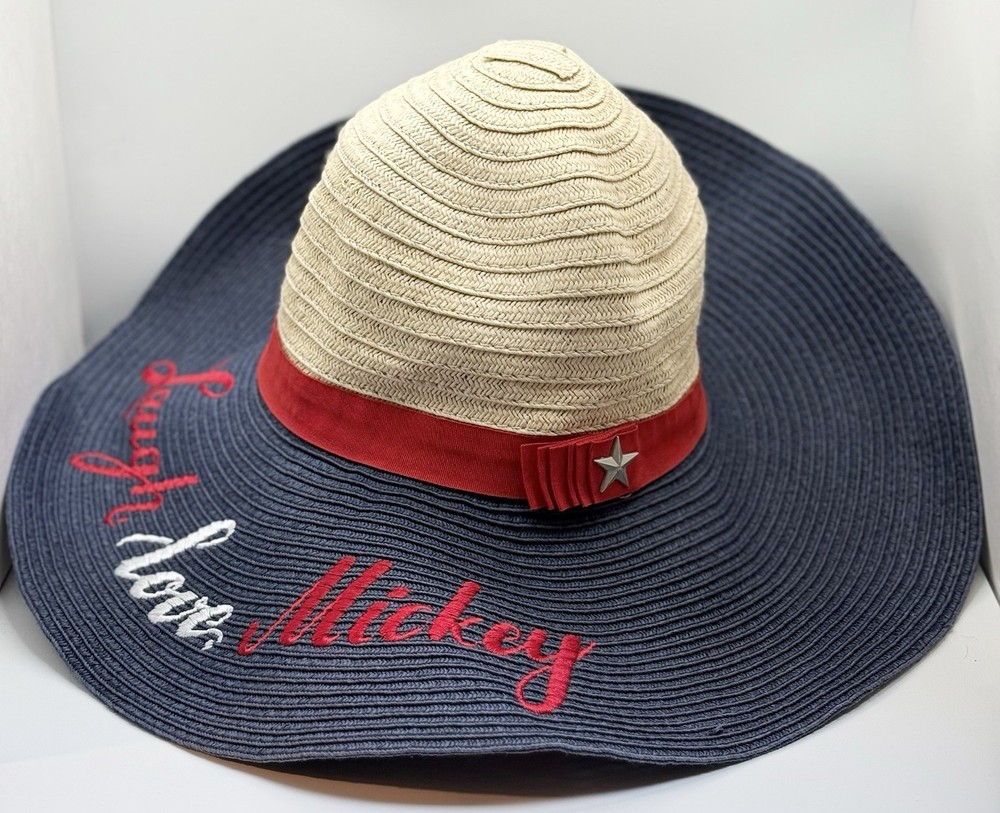 Description Have fun in the sun all summer long under this wide brimmed straw hat with Americana colors and embroidered lettering. With love from Mickey to you! Wide brimmed straw hat Patriotic colors Hatband with star appliqué Embroidered Mickey message Part of the Mickey Americana Collection One size fits most Paper straw / polyester Imported *Authentic Disney Park Merchandise*