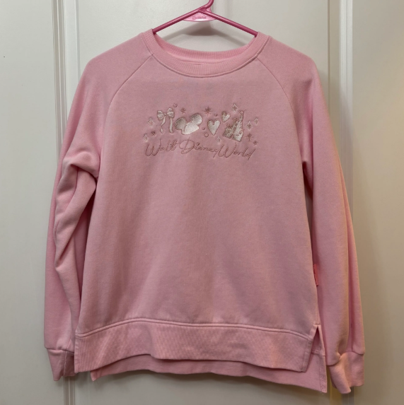 Brand new with tags! ***NOTE: There is a small mark on the tag of the sweater. It cannot be seen when worn. It does not bleed through to the sweater itself. Please purchase at your own discretion!*** Disney Parks Walt Disney World Pink Embroidered Bow Ears Hearts Castle Pullover Crewneck Sweater - Size: Large