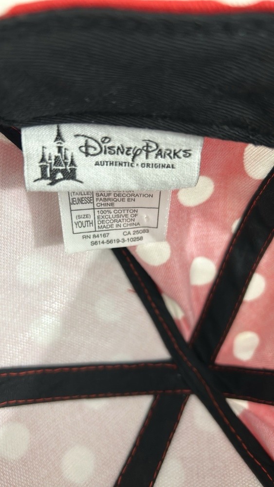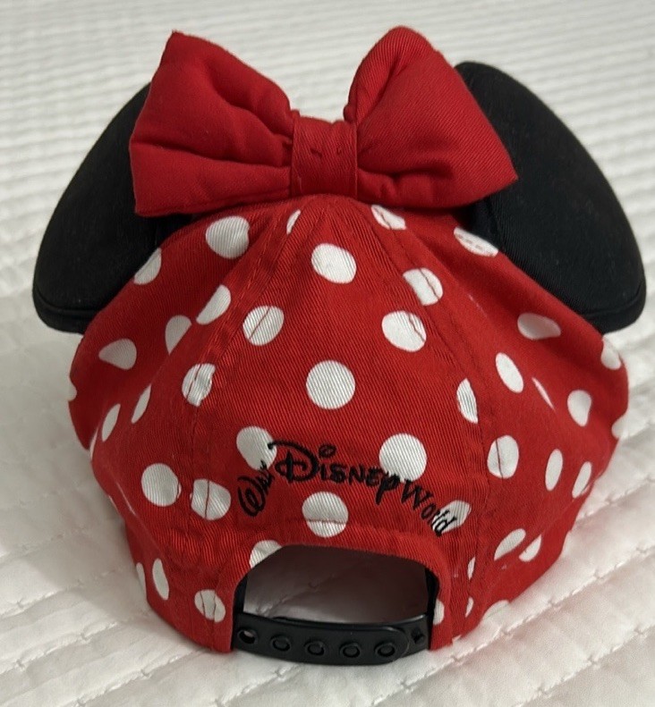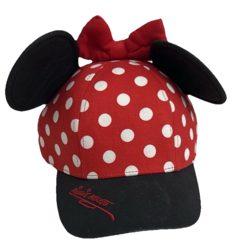 Adorable Minnie Mouse hat with red polka dots. Features black ears and a red bow. Perfect for kids.