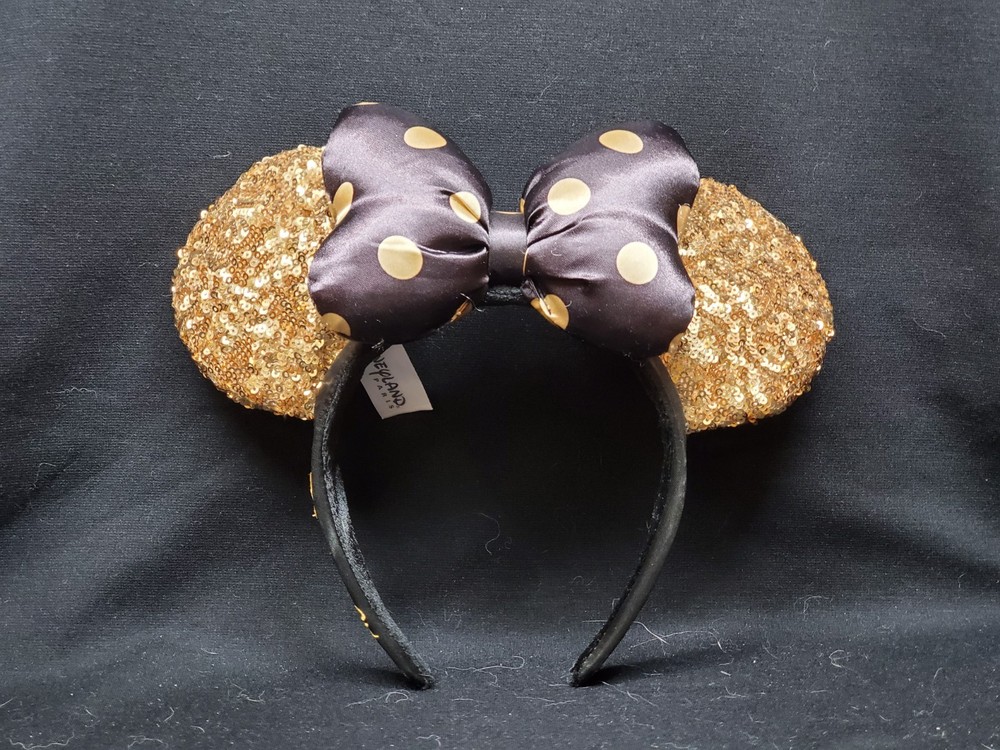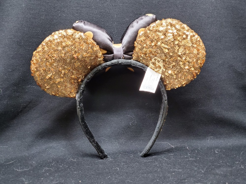 DisneyParks Black Gold Polka Dot Minnie Mouse Bow Sequins Ears Headband Ears. Condition is Used. Shipped with USPS Ground Advantage....