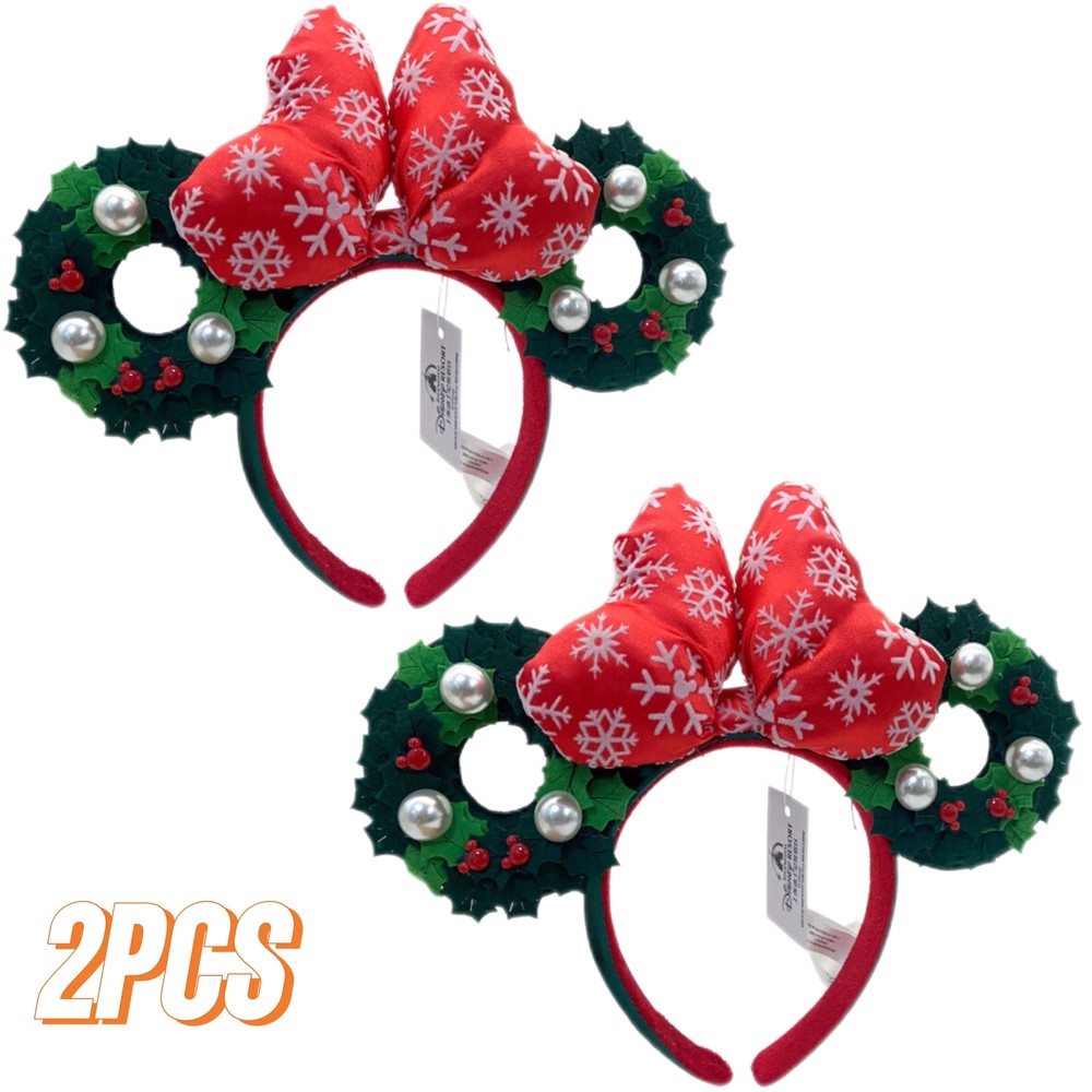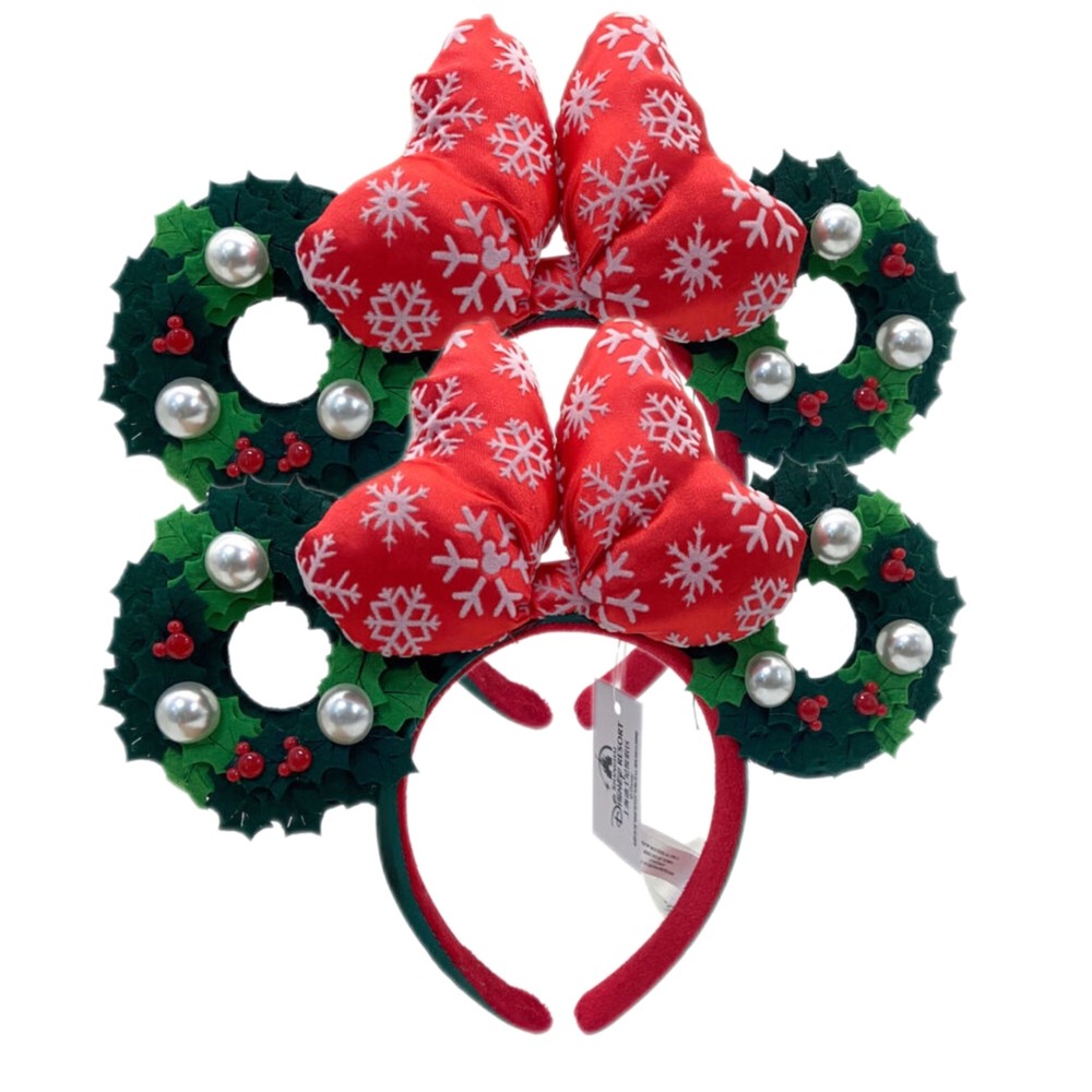 Disney Parks Minnie Mouse Red Christmas Bow Wreath Ears Headband 2-Piece Set
