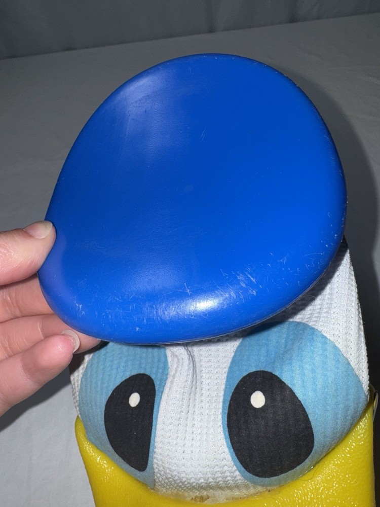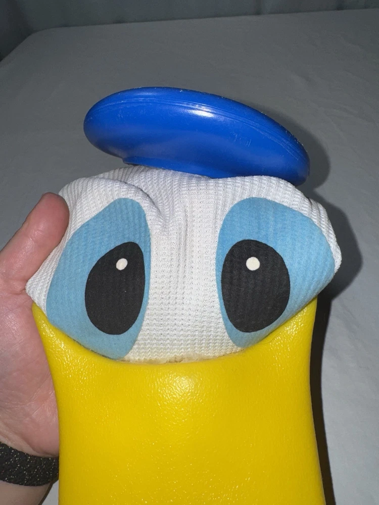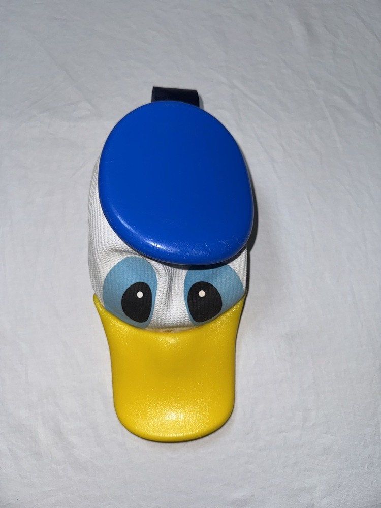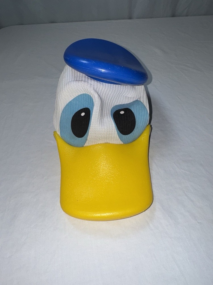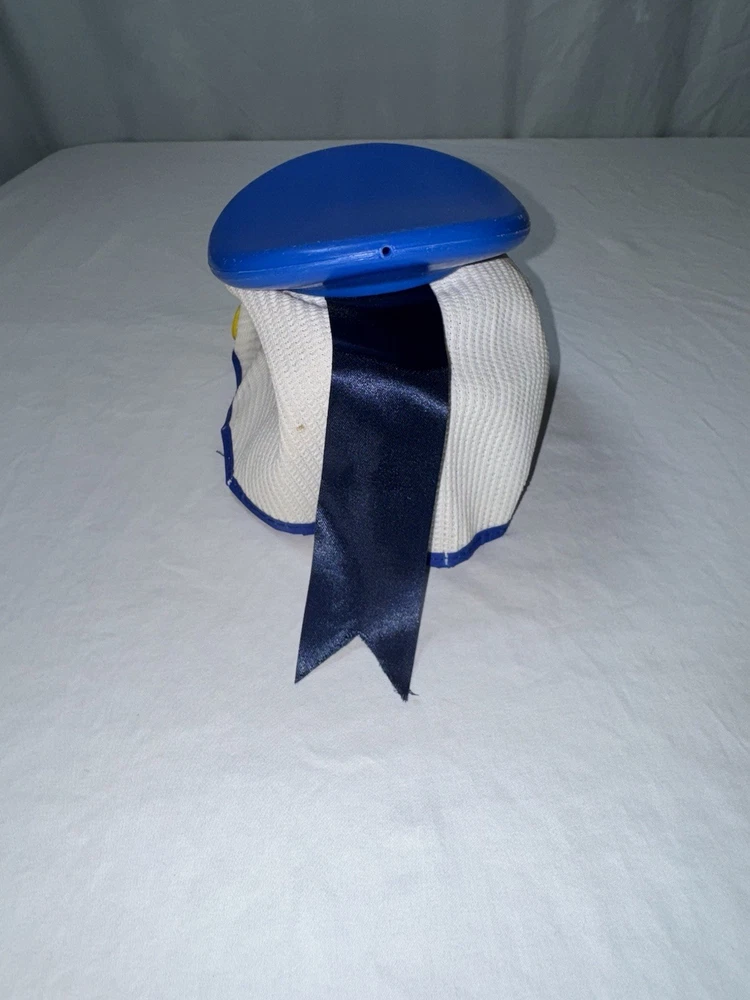 This is a vintage Donald Duck hat. The beak squeaks when you squeeze it. This has general wear. There are some rust spot stains to various white parts of the hat. There are cracks along the blue rim, and various scratches/ marks to the plastic hat and beak. The eye decals also have some cracking due to age. The hat is still wearable, it just shows wear from use and age. Please see all photos. PLEASE READ: Payment is due within 4 days of end of auction. If you have any questions please ask PRIOR to purchase. I ship Monday- Friday, excluding holidays.