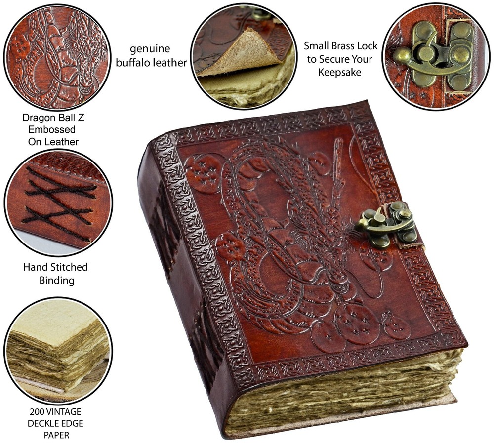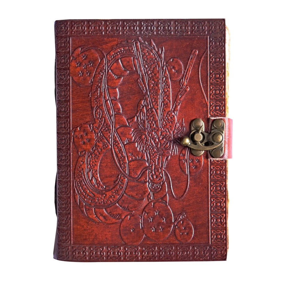 Shenron Journal - Unlock Your Creativity with Dragon Ball Z Magic! The Shenron Journal: No longer need the 7 Dragon Balls to summon Shenron; just add this journal to your cart, and he's all yours! Perfect for jotting down your bucket list and secrets, this handsomely printed leather journal with a lock brings back all those nostalgic memories from Dragon Ball Z. Handmade High-Quality Leather : Richly embossed on both front and back covers, immortalizing the iconic Shenron design. Swiveling Lock Mechanism : Ensures secure and easy closure. Leather Coptic Binding : Allows the journal to lay flat no matter where you are, making it perfect for writing or sketching. Acid-Free Paper : Ideal for art, notes, journaling, and more; it’s designed to get your creative juices flowing! Unique Leather Variations : Made from 100% handmade genuine leather, naturally tanned with vegetable oils, ensuring each journal is unique in color and shade. Perfect Size : Measuring 7” x 5”, this sketchbook is your perfect adventure companion, easily fitting into most purses, backpacks, and totes. Pages : 100 Deckle Edge Paper (200 pages total), perfect for pens, pencils, and markers without bleeding through. The Perfect Gift: When a gift card simply won’t do, give a gift they’ll love! Ideal for the sketch artist, doodler, writer, poet, musician, or daydreamer in your life who loves anime. No need to wrap; this present is ready to impress! Enhance your journaling experience and relive the magic of Dragon Ball Z with the Shenron Journal. Whether it's for personal use or a thoughtful gift, this unique leather journal is sure to inspire creativity and hold cherished memories.