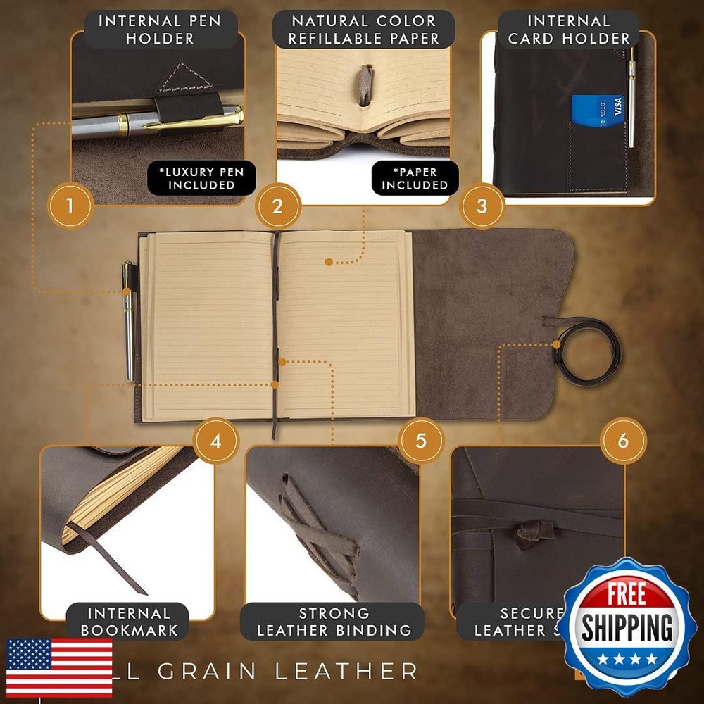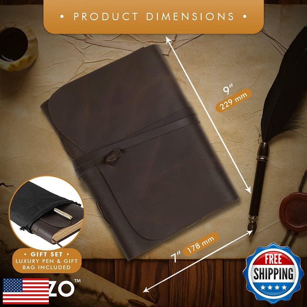 ELIZO Leather Journal Notebook Leather Bound Journal for Men - 7x9 Refillable Leather journal with Lined Pages - Writing Journals for Women - Large Travel Journal Diary Pen Gift Set Features PREMIUM LEATHER - Our exclusive genuine leather journal notebook is handmade from the finest top grain leather and natural paper. Beautiful, refillable & durable this leather notebook will surely last a lifetime. THE PERFECT SIZE - At 7" x 9" (A5) this large writing journal, diary is big enough to create yet small enough to carry in your bag. A soft real aesthetic leather travel journal for any adventure. HIGH QUALITY PAPER - Thick sturdy A5 sized pages with no bleed through or ghosting. A beautiful refillable leather journal with lined pages that will lay flat (6.5 mm spacing) for easy writing. LUXURY PEN GIFT SET – The perfect vintage journal gift set for aspiring writers or poets. Includes a personal leather bound journal, fancy pen, bookmark, pocket, pen holder and gift bag. THE ELIZO PROMISE – If for any reason you don’t love your brown leather journal for men or your handmade leather journals for women to write in, get in touch with us and we promise we will make things right – no questions asked! Unique gifts for christmas, anniversary, graduation, birthdays Shipping Free & Fast Shipping: We offer free shipping to most of the USA with a normal delivery time of 3-7 days. However, due to the current situation, additional delivery time (up to 3 weeks) may be required for some items. Alternative Carriers: We may use alternative carriers (e.g., USPS, FedEx, UPS) to ensure your package arrives safely and on time. Due to the use of multiple carriers, we are unable to provide a tracking number automatically. Handling Time: Orders are processed and shipped within 1-2 business days of receiving cleared payment. Shipping Restrictions: Shipping to Alaska, Hawaii, Puerto Rico, Guam, and other US territories may incur shipping charges or delivery restrictions. Please contact us before ordering, or your order can be refunded/cancelled. State Restrictions: Certain items may not be shipped to California due to state regulations. Contact for Tracking Updates: If you require tracking updates or have any concerns about the delivery of your order, please feel free to contact us, and we will be happy to assist you. Return Policy 30-Day Hassle-Free Returns: If you are not completely satisfied with your purchase, you can return the item for free within 30 days of receiving it for a full refund or exchange. Easy Return Process: Contact us, and we will provide you with a prepaid return shipping label and detailed instructions. No Restocking Fee: There are no restocking fees for returns. However, the buyer is responsible for return shipping costs if the return is not due to a seller's error. Refund Processing: Refunds will be processed within 1 business day of receiving the returned item in its original condition. Payment We accept all major credit cards, PayPal, and Apple Pay for your convenience. Your payment information is secure and encrypted to ensure a safe and seamless transaction. Please complete your payment within 3 days of purchase to avoid any delays in shipping. Feedback Your feedback is extremely important to us. We strive to provide the best products and customer service possible. If you are satisfied with your purchase, please take a moment to leave us a positive review. If you have any concerns or issues with your order, please contact us before leaving negative feedback. We are committed to resolving any problems and ensuring your satisfaction. Contact Us If you have any questions or concerns, please feel free to reach out to our customer support team. You can contact us through the eBay messaging system. We are available Monday to Friday, 9:00 am to 5:00 pm EST, and we will do our best to respond to your inquiry within 24 hours. Thank you for supporting our small family business!