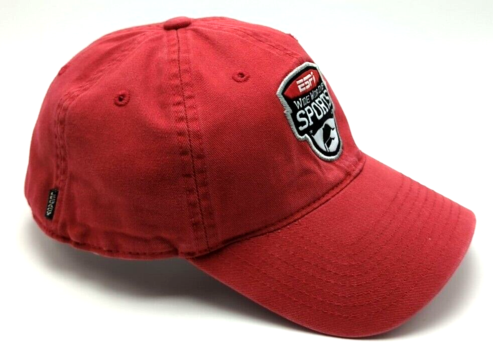 This is an ESPN WIDE WORLD OF SPORTS hat Walt Disney World red adjustable cap Features: - ESPN Wide World of Sports patch on front of cap - "Walt Disney World" embroidered on back of cap - Slightly curved brim - Adjustable strap fits most heads Condition notes: Washed and ready to wear. Some signs of wear on inside edge and the buckle has left marks on the back strap. Please see the photos for more details. I pack carefully and ship quickly. Have any questions? Please ask.