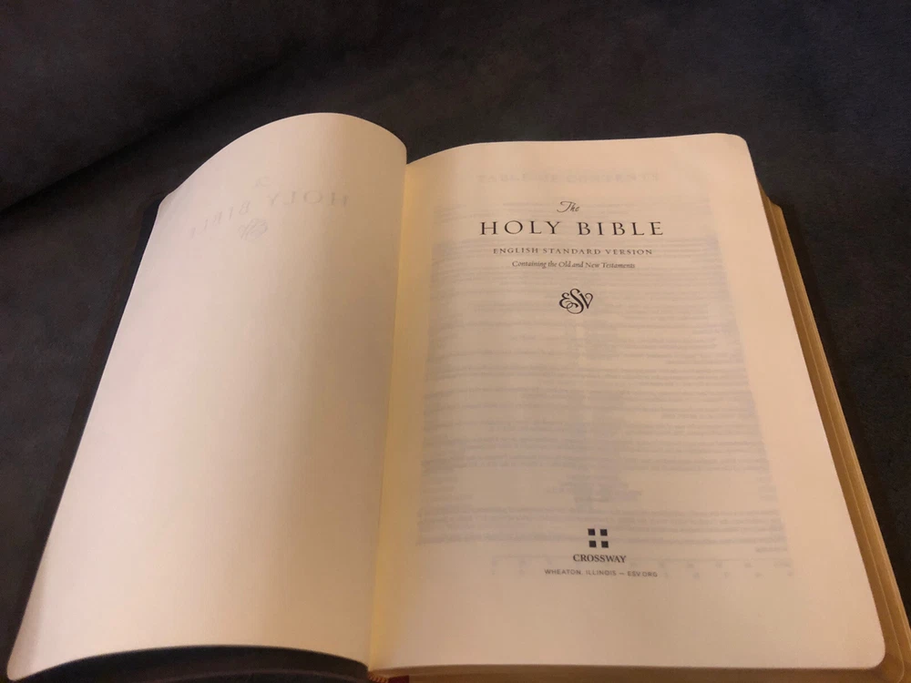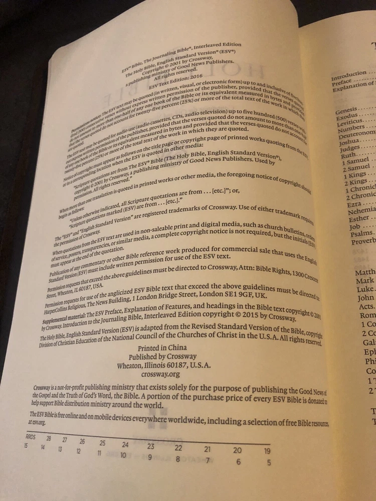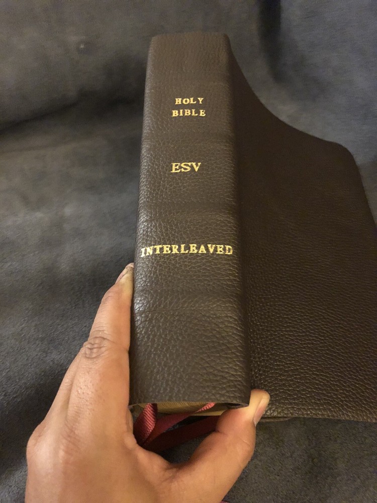 ESV ENGLISH Standard Version interleaved Journaling Bible Soft Cowhide Leather. Shipped with USPS Media Mail. Comes with genuine cowhide leather, the thickness of leather is 4 oz. the leather is very durable, ribs on spine for elegant look, 2 ribbons, this Bible has no markings or highlights whatsoever it has never been used plz examine pics carefully before purchasing and feel free to ask any questions, I do my best to respond quickly and also be sure to check out the other bibles that I have for sale, and if you want a certain Bible rebound let me know I can do that too, God bless.