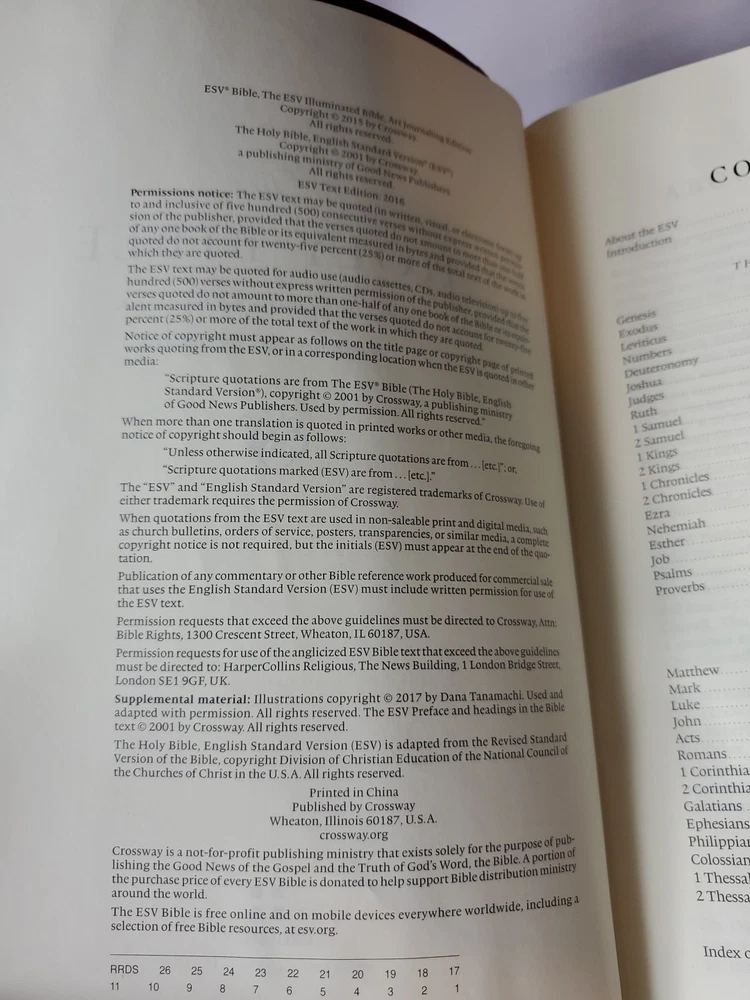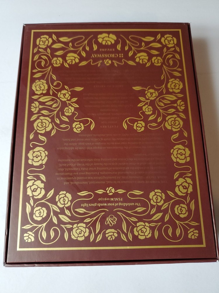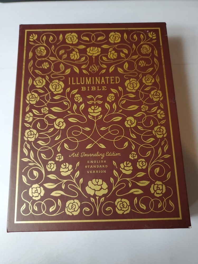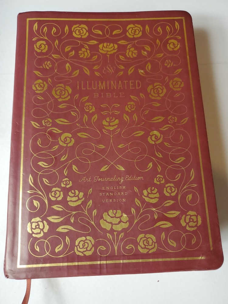 The "ESV Illuminated Bible, Art Journaling Edition" in Burgundy Leather features wide margins, gold gilded page edges, and illustrations. Published by Crossway in 2017, this edition of the English Standard Version Bible includes elements for art journaling and is part of a historical book series. Authored by Crossway and Esv Bibles, it is an inspirational resource for topics related to Christianity, Jesus Christ, and Christian history.