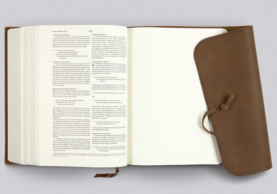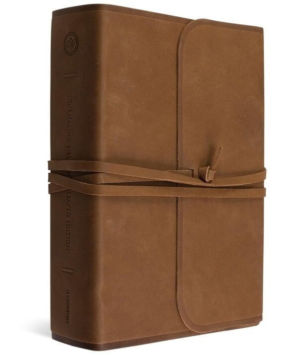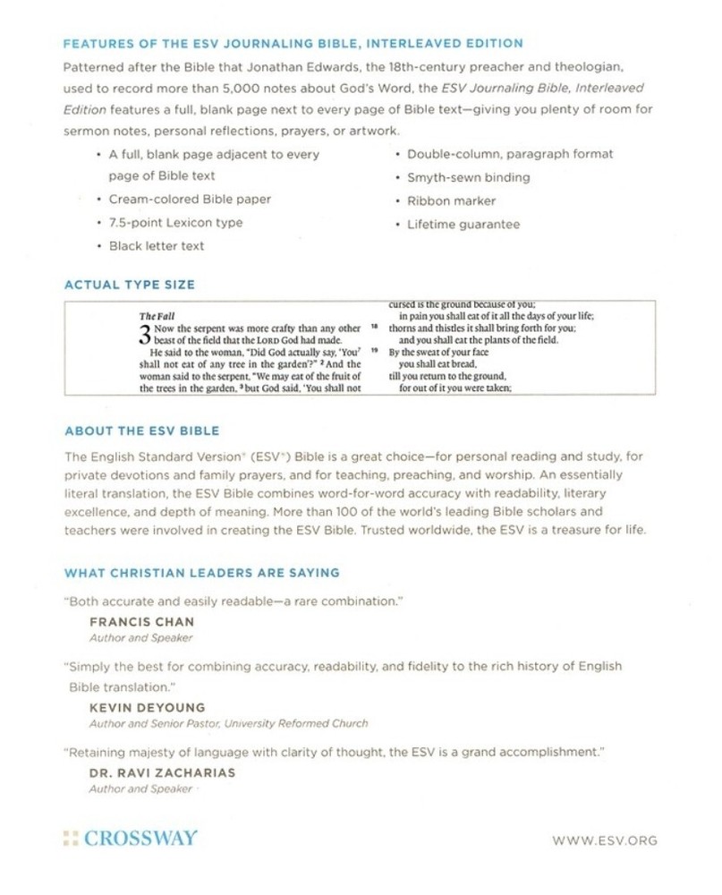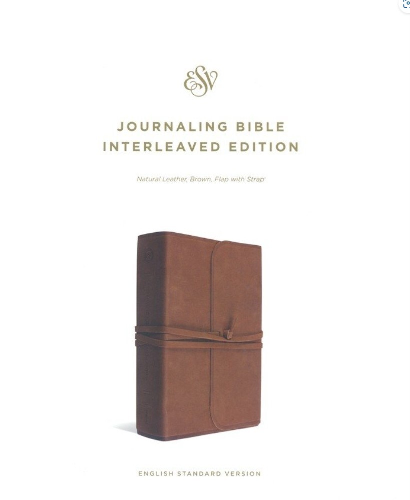 The ESV Journaling Bible, Interleaved Edition features a full, blank page next to every page of Bible text. Created to give you as much space as possible this edition features a durable binding to ensure that it lasts a lifetime. Features • Includes a full, blank page next to every page of Bible text-for personal notes, reflections, prayers, etc. • Cream-colored paper • Through the Bible in a Year reading plan • Smyth-sewn binding • Permanent slipcase • Ribbon marker • 7-point text size • Special flap cover with leather strap