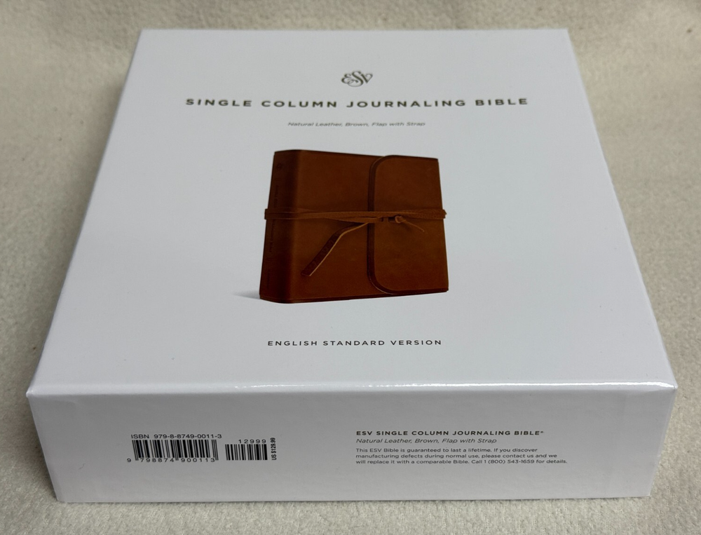 ESV Single Column Journaling Bible Natural Leather, Brown, Flap with Strap The ESV Single Column Journaling Bible is a redesign of the original ESV Journaling Bible. The Bible text is laid out in an easy-to-follow, single-column format. Ruled lines in the extra-wide margins enable users to more easily align their notes with specific verses. With high-quality Bible paper and cover materials, the ESV Single Column Journaling Bible is a durable edition for anyone who wants to capture notes, prayers, or personal reflections in their Bible. Item: ESV Single Column Journaling Bible Publisher: Crossway ISBN-13: 9798874900113 Features: Cream-colored paper Black-letter text 2" ruled margins for writing Ribbon marker Smyth-sewn binding Natural leather cover with flap and wrap-around leather strap Specifications: ESV Text Edition: 2016 Pages: 1,472 Cover: Cowhide Natural Leather Cover Color: Brown Layout: Single column, paragraph format Text Font: 8 point type Words of Christ: Black Letter Page Gilding : None Packaging: Box Size: 6.25" x 8.5 Weight: 53.69 ounces Condition: New Important Notes : Leather has natural flaws which is normal and expected. Please see pictures of cover (back & front) of the actual item. Thank you for looking at my auction! SHIPPING INFORMATION USPS is our primary Shipping Service. We also can ship UPS or FedEx. We ship quickly. Most items are processed within 1 business day of cleared payment. SAVE MONEY! I will combine ship. Purchase multiple items and have them invoiced together to save on shipping costs. Costs are based upon actual weight and a small handling charge to help cover the costs of packaging materials. International shipments take longer to arrive due to delays with government custom agencies. Buyer is responsible for all Duties and Taxes. PAYMENT DETAILS Payment is expected within 7 days from the end of the auction. RETURN & EXCHANGE POLICY Many of our items are brand new in the box which will be noted in the auction. We guarantee against items being DOA (Dead on Arrival) unless otherwise noted by (AS-IS) in the description of the item. If the item does not function properly you must notify us within 7 days of receipt and we will make arrangements to exchange the product or refund your payment. We take pride in our descriptions and pictures. If you feel that the item is materially different from our description, please contact us within 48 hours of receipt so we can resolve the issue. Buyer is responsible for shipping costs. Questions??? Please ask. Thank you for looking at my auction!
