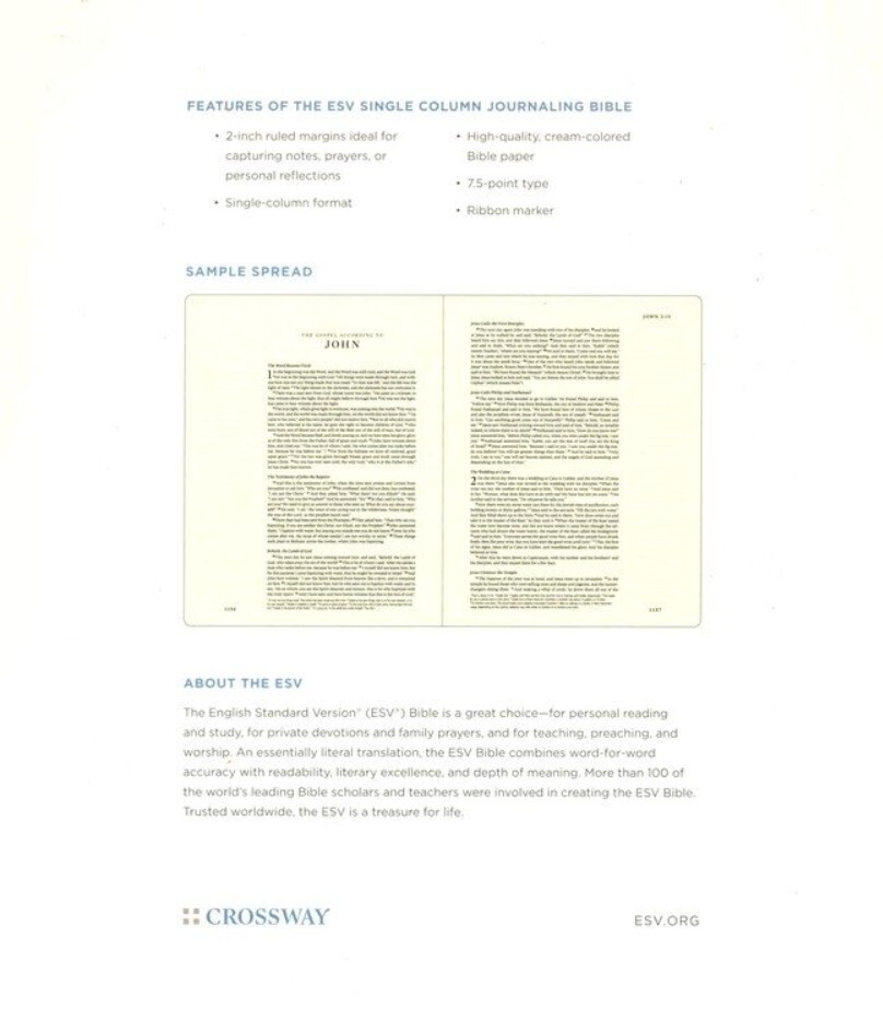 The ESV Single Column Journaling Bible is a redesign of the original ESV Journaling Bible. The Bible text is laid out in an easy-to-follow, single-column format. Ruled lines in the extra-wide margins enable users to more easily align their notes with specific verses. With high-quality Bible paper and cover materials, the ESV Single Column Journaling Bible is a durable edition for anyone who wants to capture notes, prayers, or personal reflections in their Bible. Features: • Cowhide leather cover • 2 inch ruled margins for writing • Single Column • Cream-colored Bible paper • Ribbon marker • Smyth-sewn binding • 7.5 point type