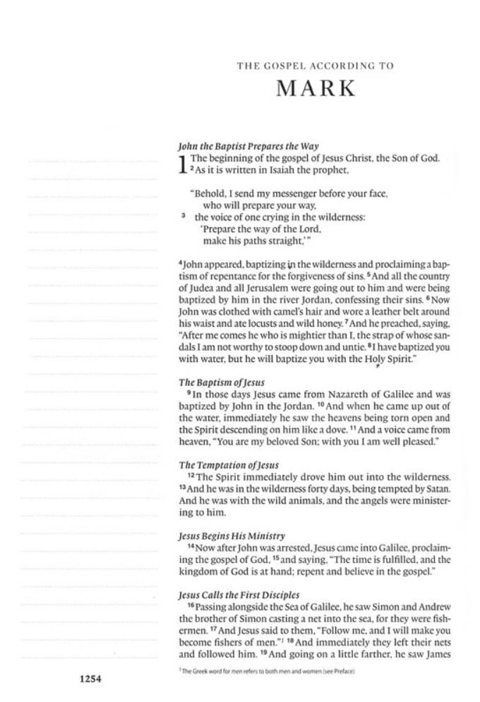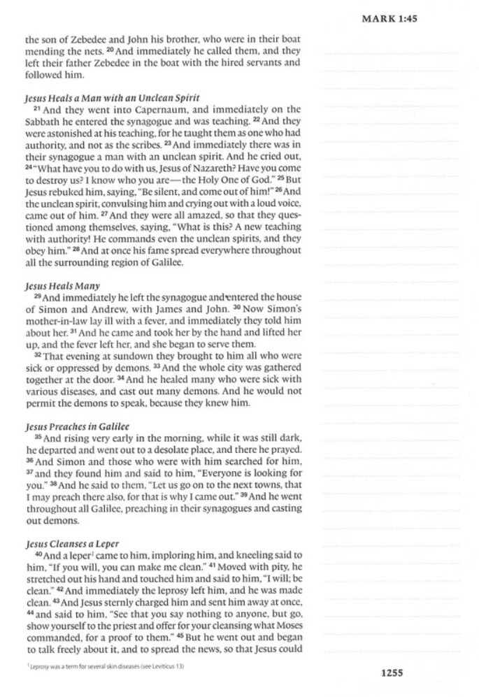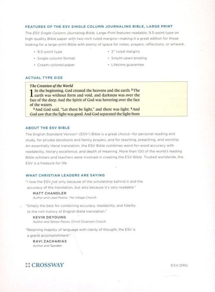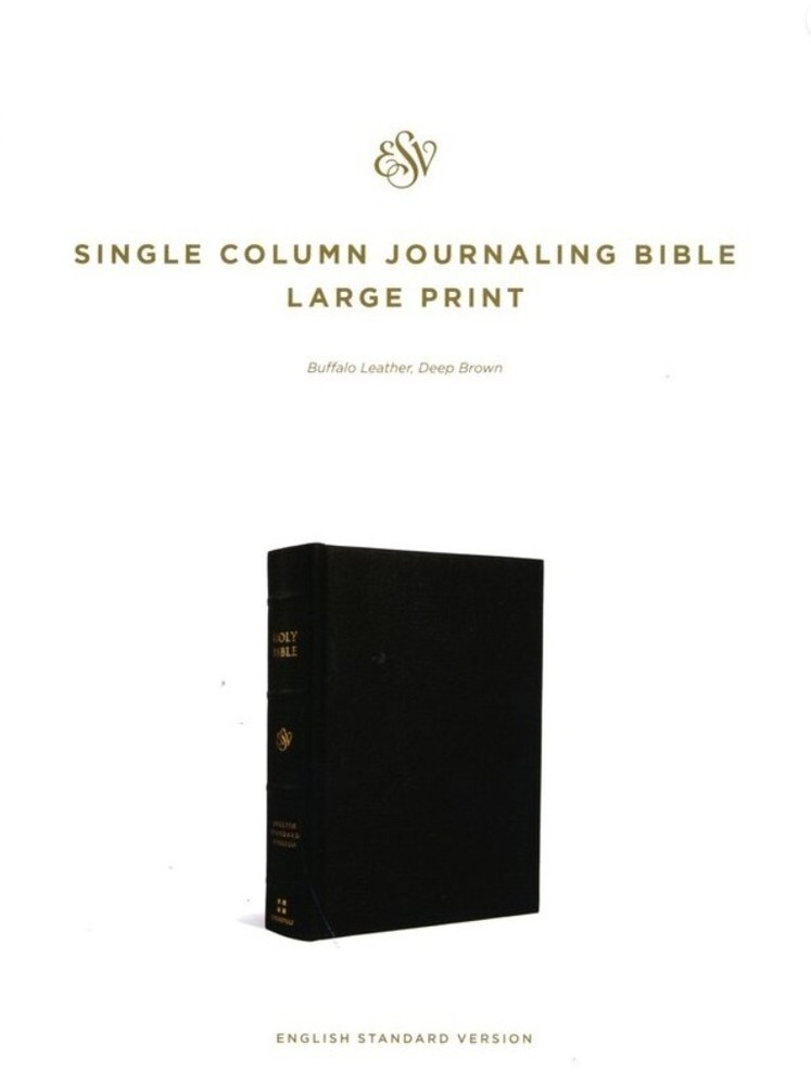 The ESV Single Column Journaling Bible, Large Print features the same high-quality Bible paper and two-inch ruled margins as the original ESV Single Column Journaling Bible. This new edition is perfect for those seeking a large-print Bible with plenty of space for notes, prayers, reflections, or artwork. Features: • Single-column format • Cream-colored paper • 2" ruled margins • Smyth-sewn binding • 9.5-point type