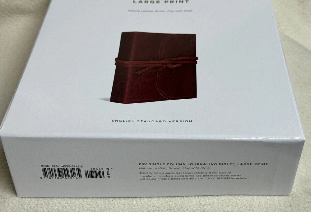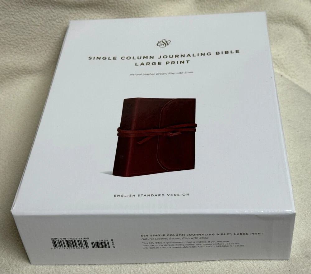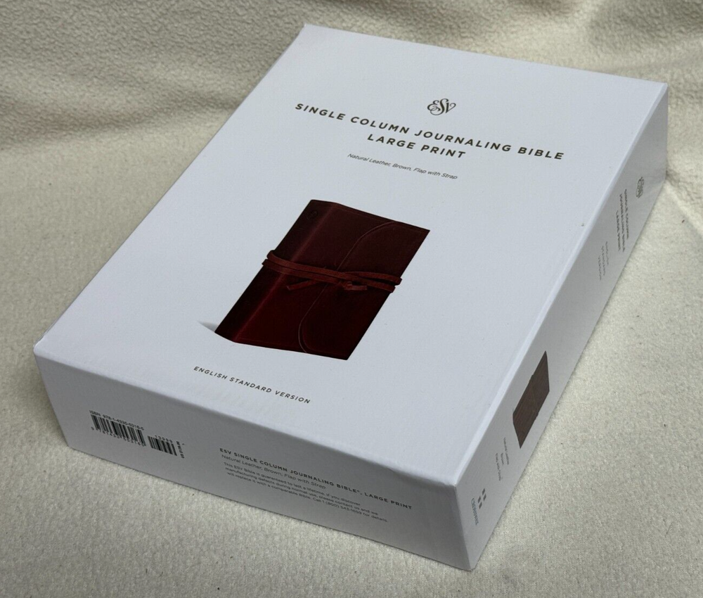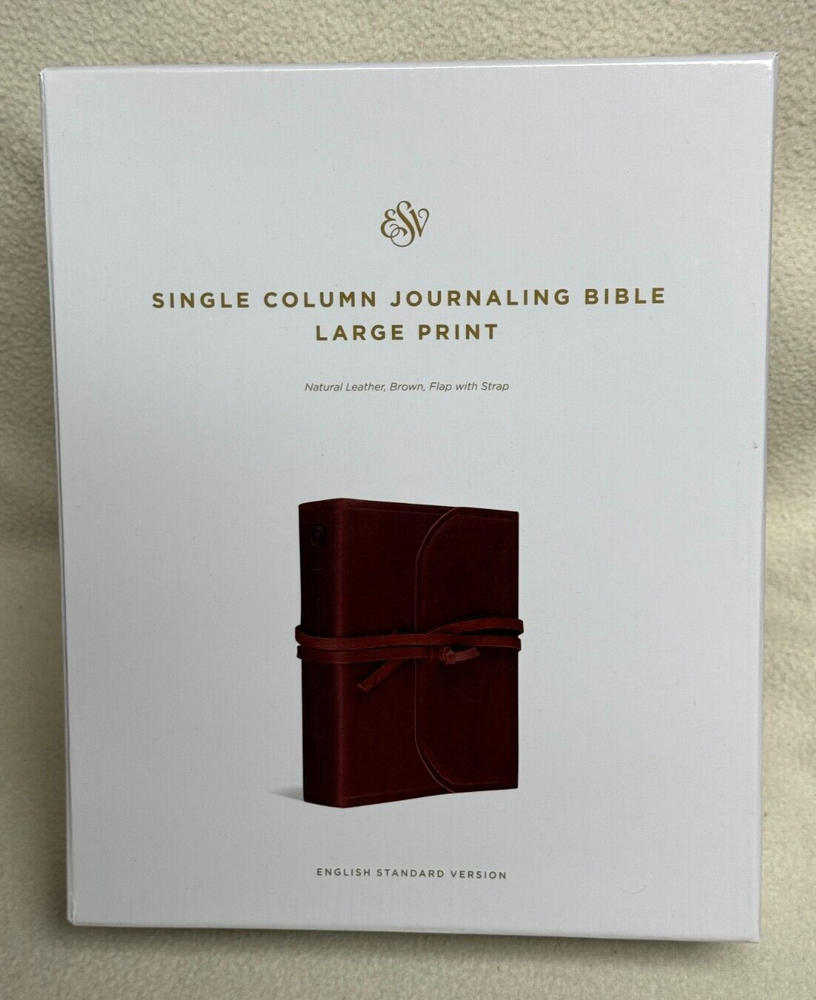 ESV Single Column Journaling Bible Large Print, Natural Leather, Brown, Flap with Strap The ESV Single Column Journaling Bible, Large Print features the same high-quality Bible paper and two-inch ruled margins as the original ESV Single Column Journaling Bible, but now with larger, 9.5-point type. This new edition is perfect for those seeking a large-print Bible with plenty of space for notes, prayers, reflections, or artwork. Item Description: ESV Single Column Journaling Bible , Natural Leather Publisher: Crossway ISBN-10: 1-4335-5316-3 ISBN-13: 9781433553165 Features: Cream-colored paper Black-letter text 2" ruled margins Single-column format Ribbon marker Smyth-sewn binding Natural leather cover with special flap and wrap-around leather strap Specifications: ESV Text Edition: 2016 Pages: 1,568 Cover: Cowhide Natural Leather Cover Color: Brown Layout: Single column, paragraph format Text Font: 9.5-point type Words of Christ: Black Letter Page Gilding : None Packaging: Clamshell Box Page Size: 6.5" x 9.25 Weight: 58.5 ounces Condition: New Important Notes : Leather has natural flaws which is normal and expected. Please see pictures of cover (back & front) of the actual item. Thank you for looking at my auction! SHIPPING INFORMATION USPS is our primary Shipping Service. We also can ship UPS or FedEx. We ship quickly. Most items are processed within 1 business day of cleared payment. SAVE MONEY! I will combine ship. Purchase multiple items and have them invoiced together to save on shipping costs. Costs are based upon actual weight and a small handling charge to help cover the costs of packaging materials. International shipments take longer to arrive due to delays with government custom agencies. Buyer is responsible for all Duties and Taxes. PAYMENT DETAILS Payment is expected within 7 days from the end of the auction. RETURN & EXCHANGE POLICY Many of our items are brand new in the box which will be noted in the auction. We guarantee against items being DOA (Dead on Arrival) unless otherwise noted by (AS-IS) in the description of the item. If the item does not function properly you must notify us within 7 days of receipt and we will make arrangements to exchange the product or refund your payment. We take pride in our descriptions and pictures. If you feel that the item is materially different from our description, please contact us within 48 hours of receipt so we can resolve the issue. Buyer is responsible for shipping costs. Questions??? Please ask. Thank you for looking at my auction!