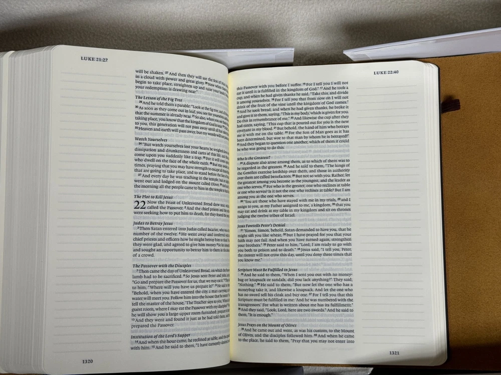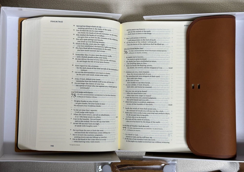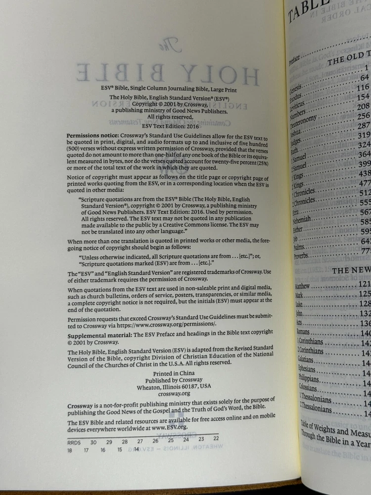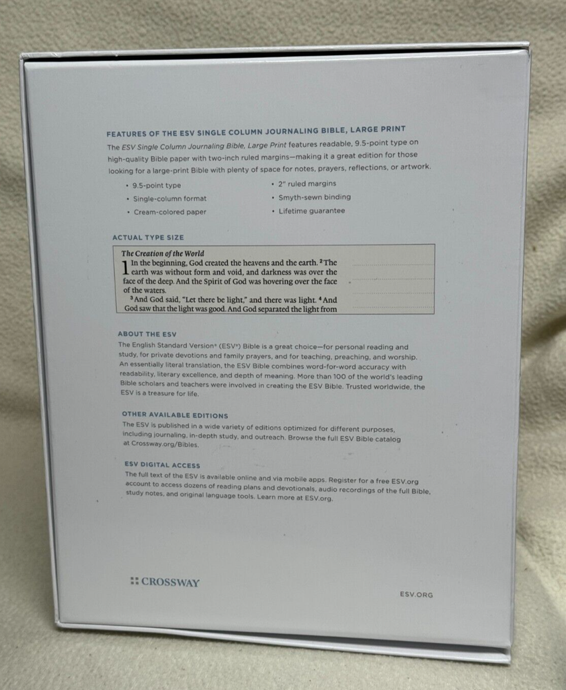ESV Single Column Journaling Bible Large Print, Natural Leather, Brown, Flap with Strap The ESV Single Column Journaling Bible, Large Print features the same high-quality Bible paper and two-inch ruled margins as the original ESV Single Column Journaling Bible, but now with larger, 9.5-point type. This new edition is perfect for those seeking a large-print Bible with plenty of space for notes, prayers, reflections, or artwork. Item Description: ESV Single Column Journaling Bible , Natural Leather Publisher: Crossway ISBN-10: 1-4335-5316-3 ISBN-13: 9781433553165 Features: Cream-colored paper Black-letter text 2" ruled margins Single-column format Ribbon marker Smyth-sewn binding Natural leather cover with special flap and wrap-around leather strap Specifications: ESV Text Edition: 2016 Pages: 1,568 Cover: Cowhide Natural Leather Cover Color: Brown Layout: Single column, paragraph format Text Font: 9.5-point type Words of Christ: Black Letter Page Gilding : None Packaging: Clamshell Box Page Size: 6.5" x 9.25 Weight: 58.5 ounces Condition: New Important Notes : Leather has natural flaws which is normal and expected. Please see pictures of cover (back & front) of the actual item. Thank you for looking at my auction! SHIPPING INFORMATION USPS is our primary Shipping Service. We also can ship UPS or FedEx. We ship quickly. Most items are processed within 1 business day of cleared payment. SAVE MONEY! I will combine ship. Purchase multiple items and have them invoiced together to save on shipping costs. Costs are based upon actual weight and a small handling charge to help cover the costs of packaging materials. International shipments take longer to arrive due to delays with government custom agencies. Buyer is responsible for all Duties and Taxes. PAYMENT DETAILS Payment is expected within 7 days from the end of the auction. RETURN & EXCHANGE POLICY Many of our items are brand new in the box which will be noted in the auction. We guarantee against items being DOA (Dead on Arrival) unless otherwise noted by (AS-IS) in the description of the item. If the item does not function properly you must notify us within 7 days of receipt and we will make arrangements to exchange the product or refund your payment. We take pride in our descriptions and pictures. If you feel that the item is materially different from our description, please contact us within 48 hours of receipt so we can resolve the issue. Buyer is responsible for shipping costs. Questions??? Please ask. Thank you for looking at my auction!
