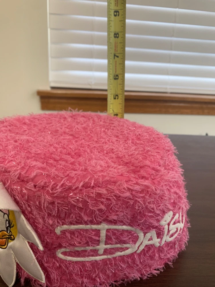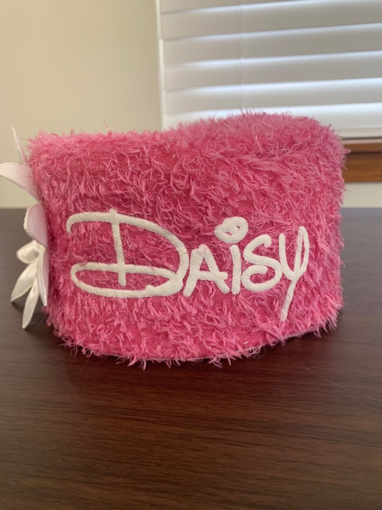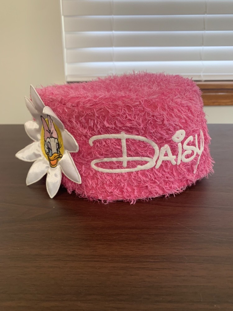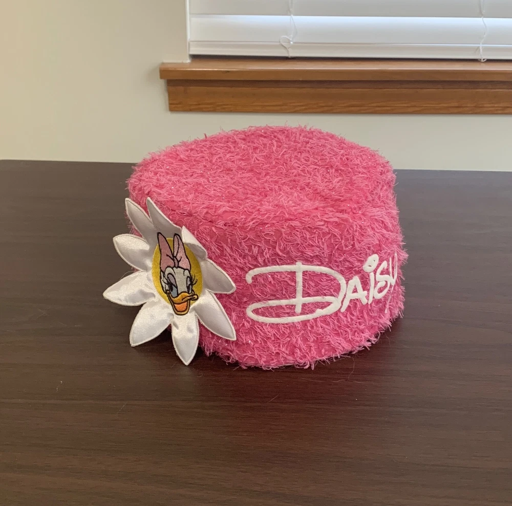Vintage Daisy Duck textured pink pillbox hat, with pink satin lining. EUC - no stains, smells, snags. Flower is satin and embroidered. "Daisy" spelled out has two places with tiny cracks on "D" and "y". Please see photos. I purchased this at Disney World circa 1998. Worn once - has been stored for 20+ years. No size listed on tag. Measures approximately 7.5" across, 4" tall. Comes from non-smoking, pet friendly home.