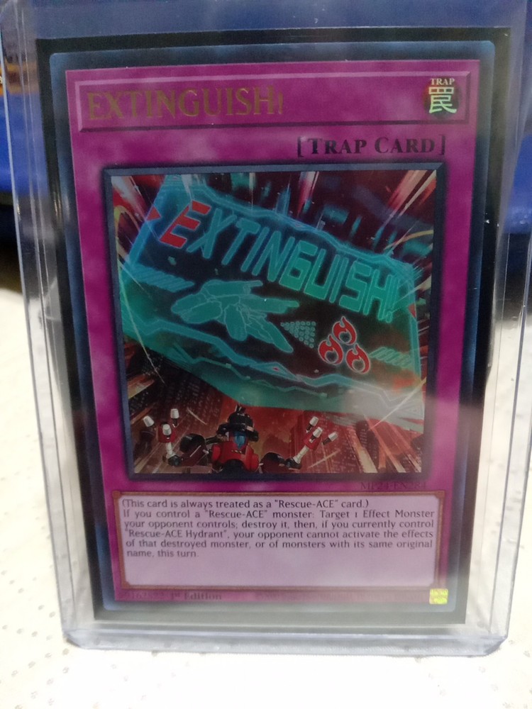 The EXTINGUISH! MP24-EN284 25th Anniversary Tin: Dueling Mirrors 1st Edition card is a highly sought-after Ultra Rare trap card in the Yu-Gi-Oh! TCG. Manufactured by Konami, this English-language card features a unique "Rescue-ACE" theme that can disable your opponent's Effect Monsters. It is a Trap-Normal card with the card number MP24-EN284, making it a valuable addition to any collector's deck. With its special 1st Edition release, this card is in near mint condition and sure to be a standout in any card collection.