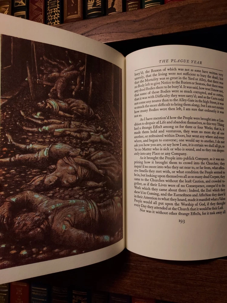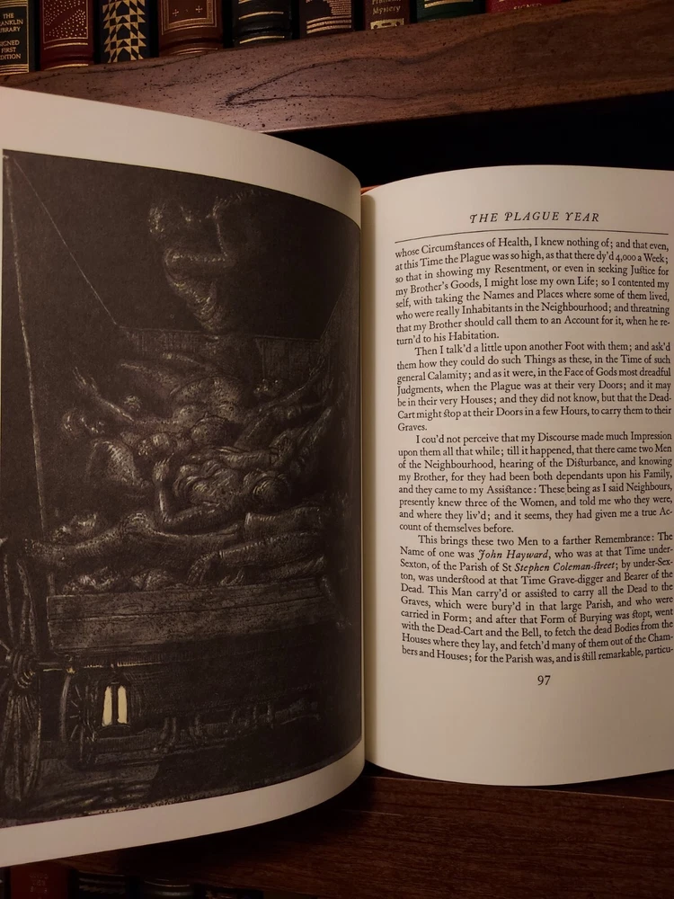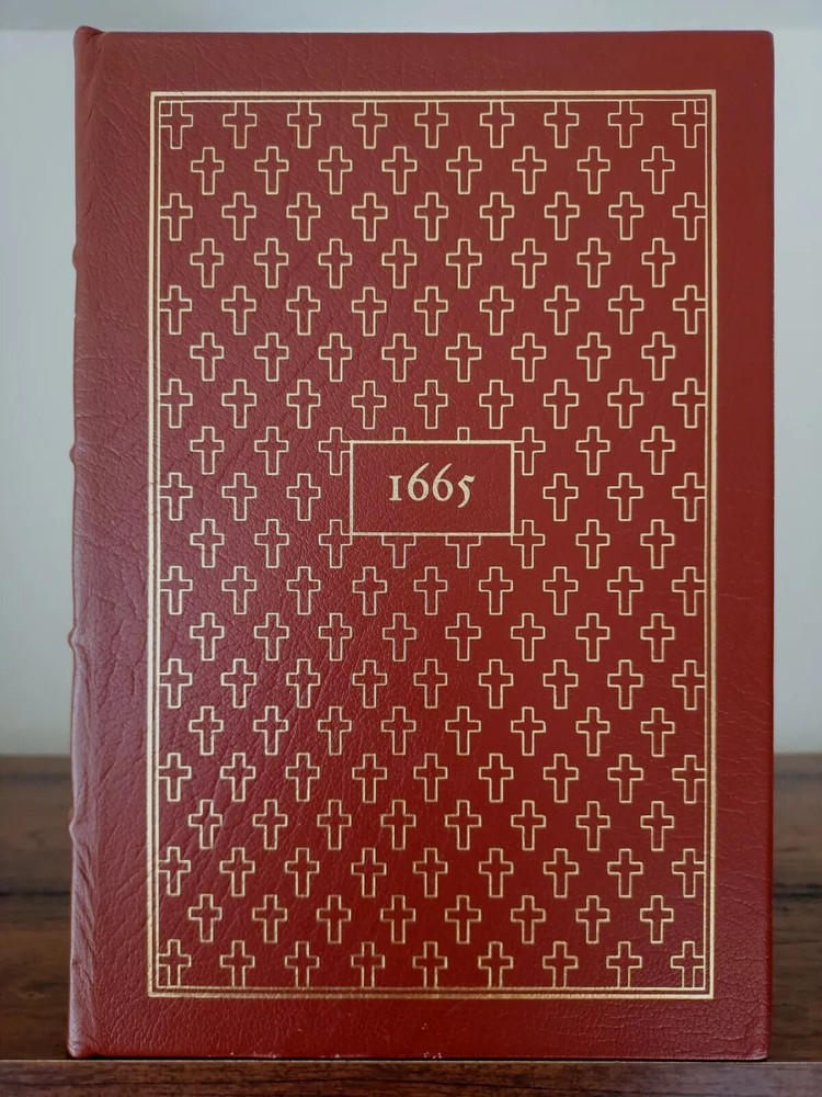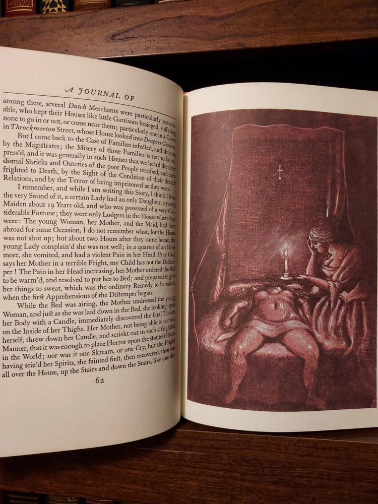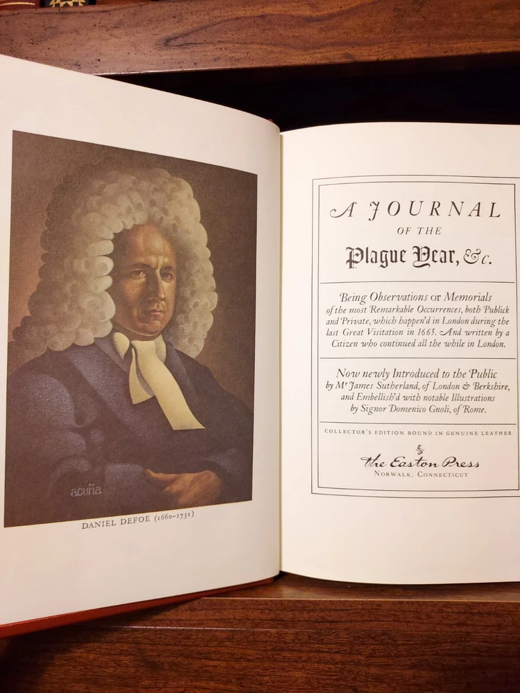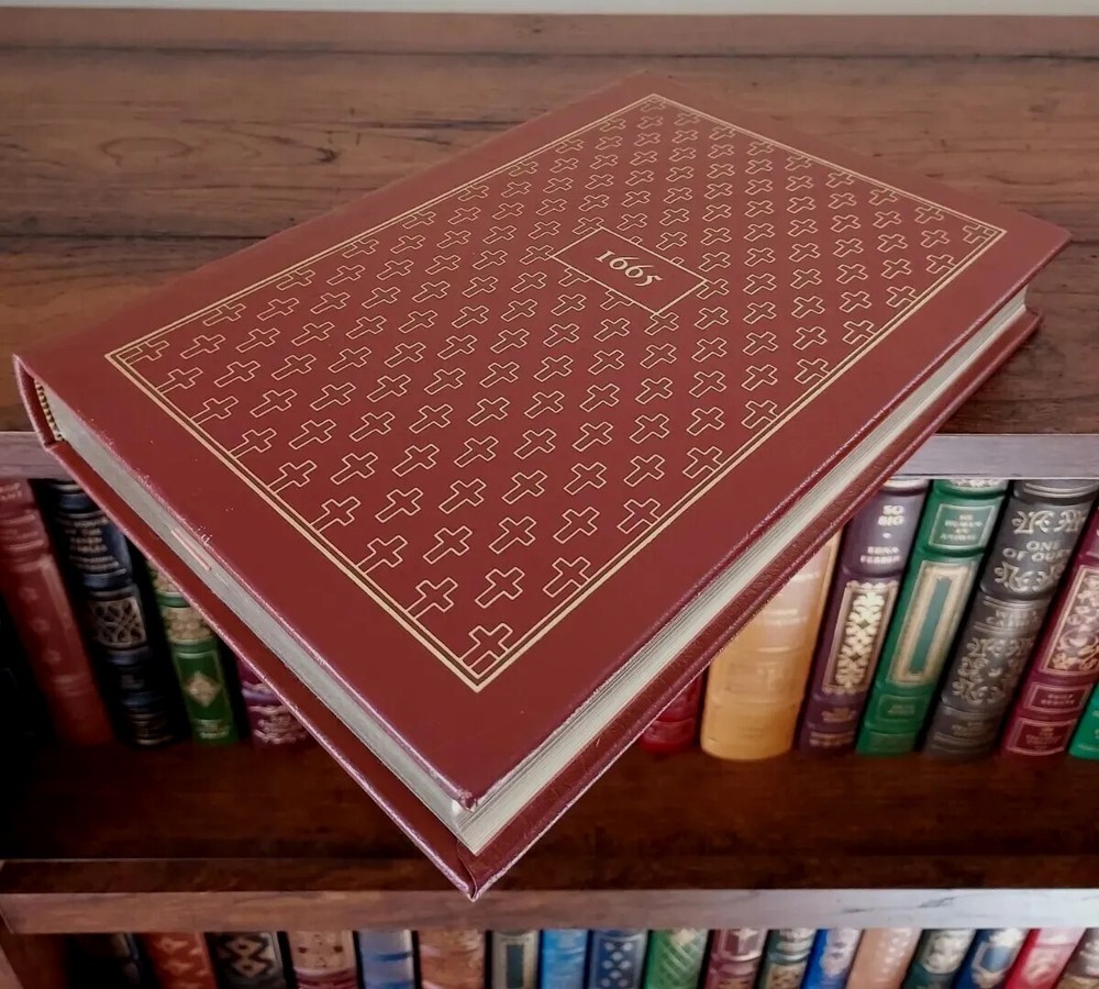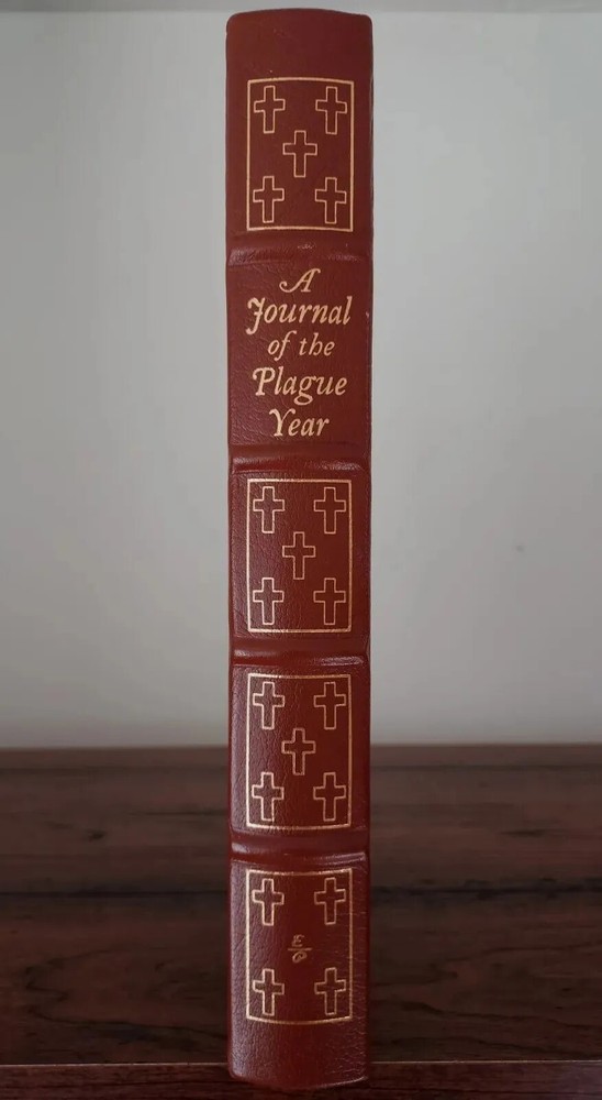 This beautiful book is in NEAR MINT condition. It looks like new. The leather is glossy and gorgeous, and the golden gilding is sharp and shimmering. The pages' gilt remains saturated with gold. The paper is fresh and crisp. There was some sticker attached and removed on the bottom right corner of the front moire end leaf, as seen in picture #9 A Journal of the Plague Year: Being Observations or Memorials, Of the most Remarkable Occurrences, As well Publick as Private, which happened in London During the last Great Visitation In 1665, commonly called A Journal of the Plague Year, is a book by Daniel Defoe, first published in March 1722. It is an account of one man's experiences of the year 1665, in which the bubonic plague struck the city of London in what became known as the Great Plague of London, the last epidemic of plague in that city. Presented as an eyewitness account of the events at the time, it was written in the years just prior to the book's first publication in March 1722. Defoe was only five years old in 1665 when the Great Plague took place, and the book itself was published under the initials H. F. and is probably based on the journals of Defoe's uncle, Henry Foe, who, like 'H. F.', was a saddler who lived in the Whitechapel district of East London. Defoe goes to great pains to achieve an effect of verisimilitude, identifying specific neighborhoods, streets, and even houses in which events took place. Additionally, it provides tables of casualty figures and discusses the credibility of various accounts and anecdotes received by the narrator. The book is often compared to the actual, contemporary accounts of the plague in the diary of Samuel Pepys. Defoe's account, which appears to include much research, is far more systematic and detailed than Pepys's first-person account.