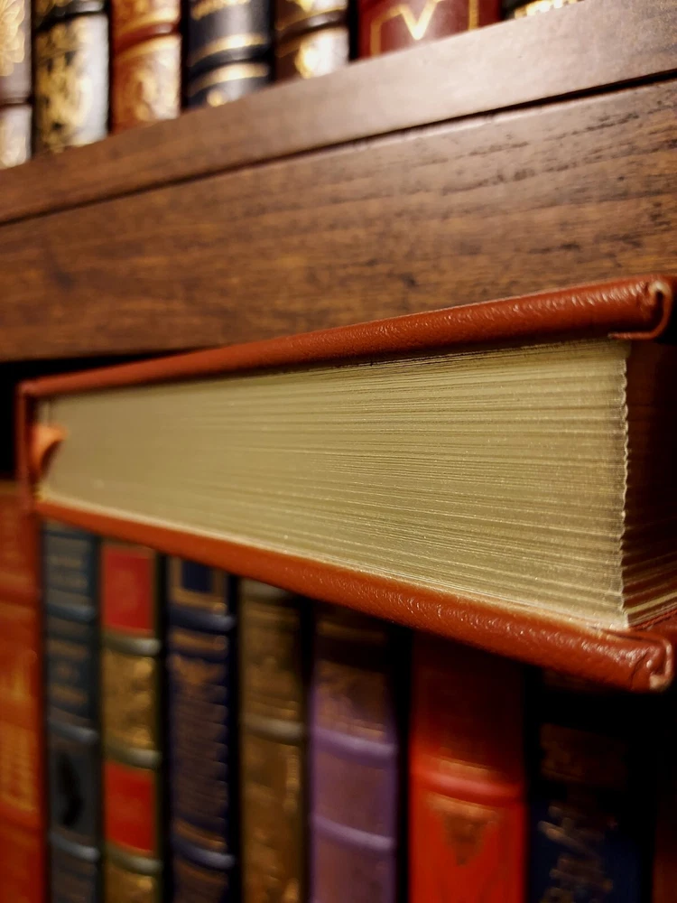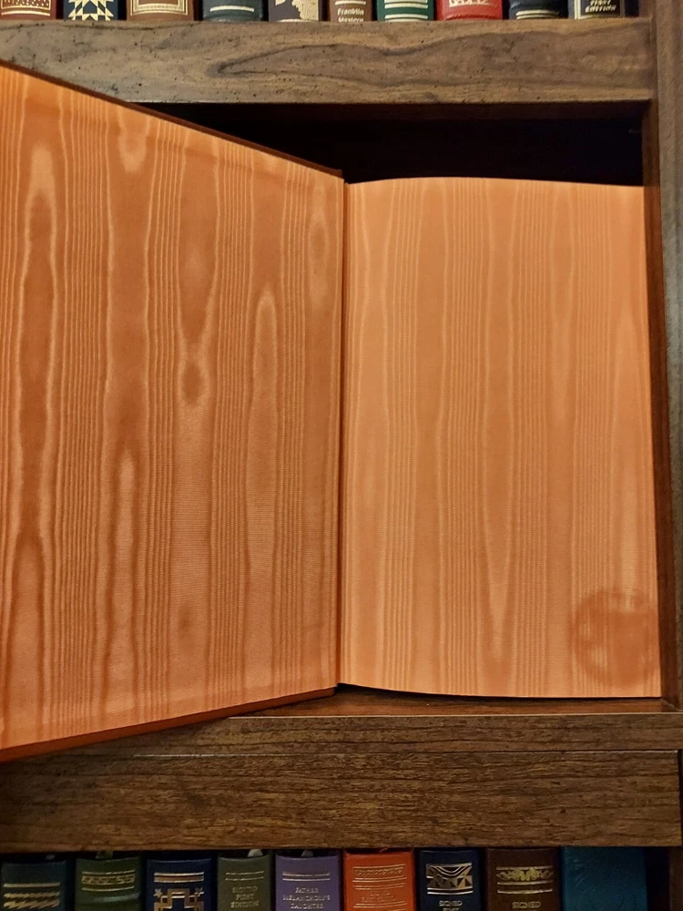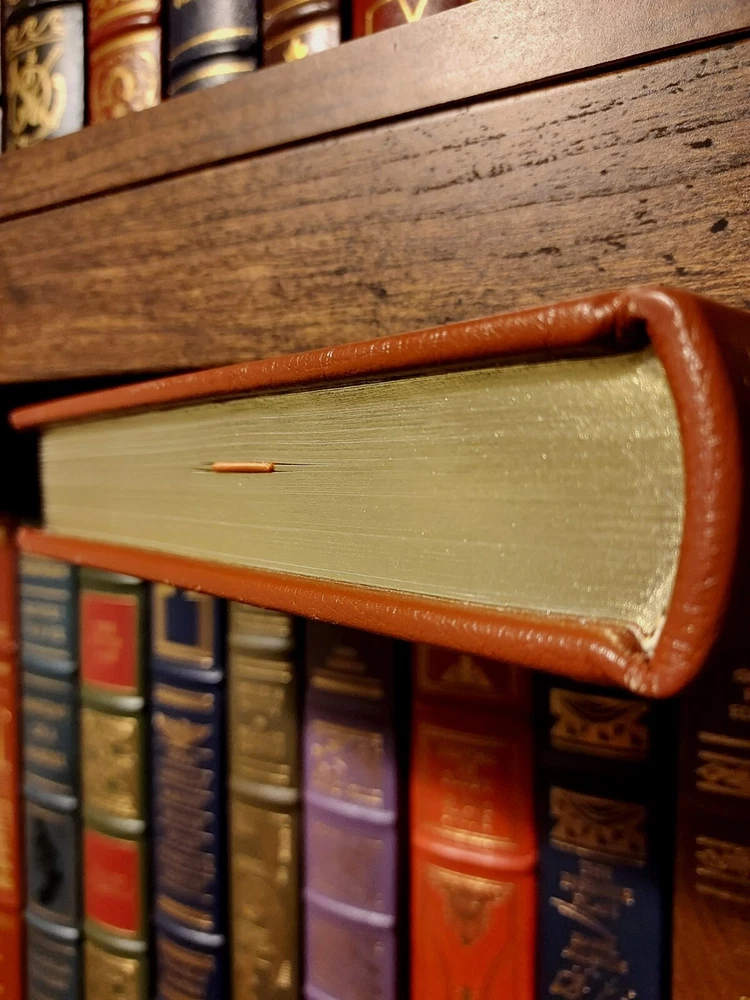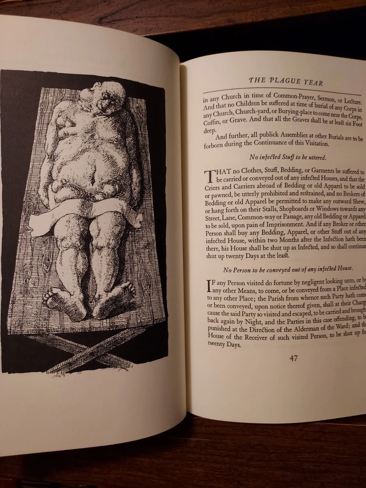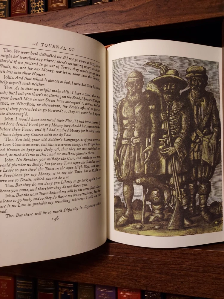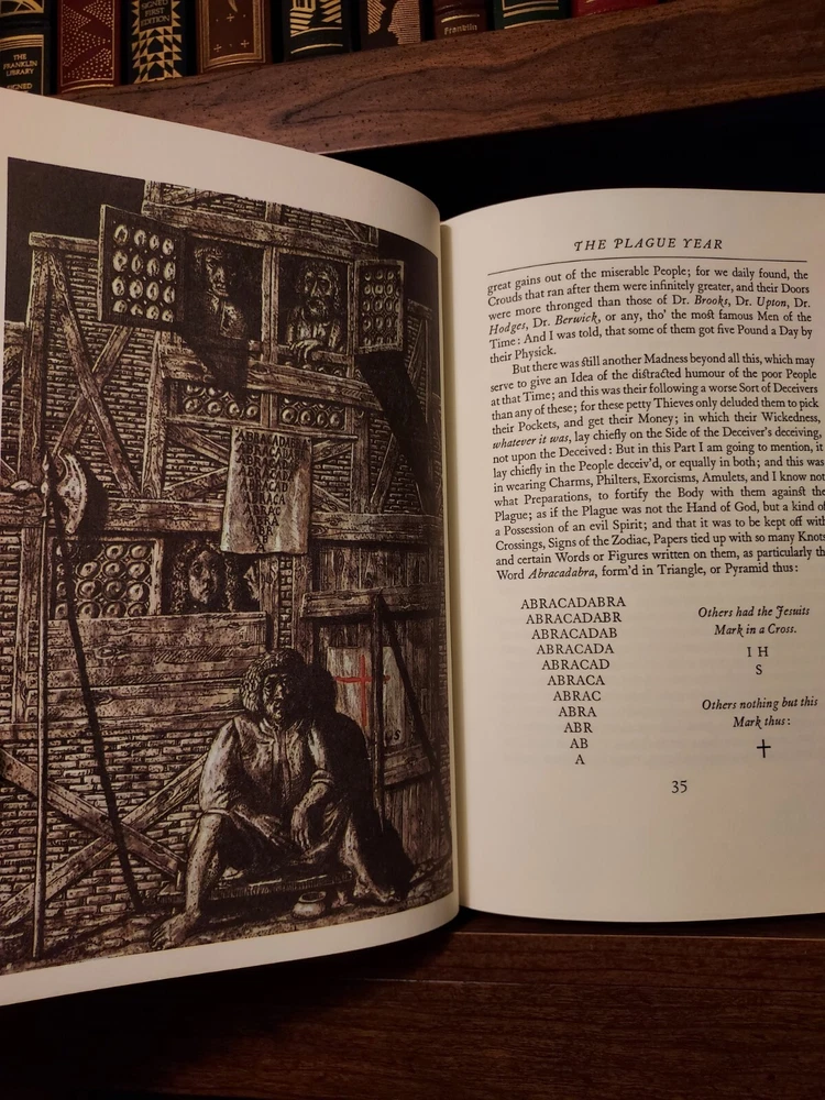 This beautiful book is in NEAR MINT condition. It looks like new. The leather is glossy and gorgeous, and the golden gilding is sharp and shimmering. The pages' gilt remains saturated with gold. The paper is fresh and crisp. There was some sticker attached and removed on the bottom right corner of the front moire end leaf, as seen in picture #9 A Journal of the Plague Year: Being Observations or Memorials, Of the most Remarkable Occurrences, As well Publick as Private, which happened in London During the last Great Visitation In 1665, commonly called A Journal of the Plague Year, is a book by Daniel Defoe, first published in March 1722. It is an account of one man's experiences of the year 1665, in which the bubonic plague struck the city of London in what became known as the Great Plague of London, the last epidemic of plague in that city. Presented as an eyewitness account of the events at the time, it was written in the years just prior to the book's first publication in March 1722. Defoe was only five years old in 1665 when the Great Plague took place, and the book itself was published under the initials H. F. and is probably based on the journals of Defoe's uncle, Henry Foe, who, like 'H. F.', was a saddler who lived in the Whitechapel district of East London. Defoe goes to great pains to achieve an effect of verisimilitude, identifying specific neighborhoods, streets, and even houses in which events took place. Additionally, it provides tables of casualty figures and discusses the credibility of various accounts and anecdotes received by the narrator. The book is often compared to the actual, contemporary accounts of the plague in the diary of Samuel Pepys. Defoe's account, which appears to include much research, is far more systematic and detailed than Pepys's first-person account.