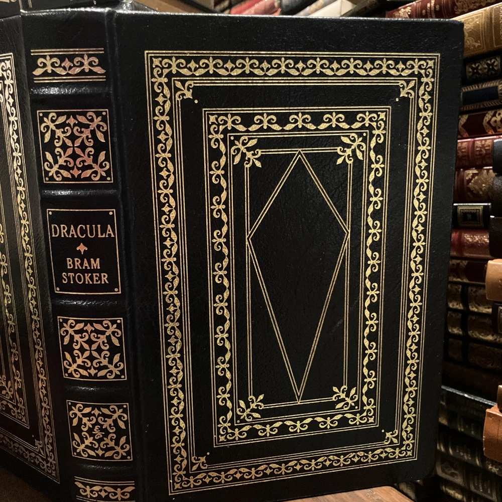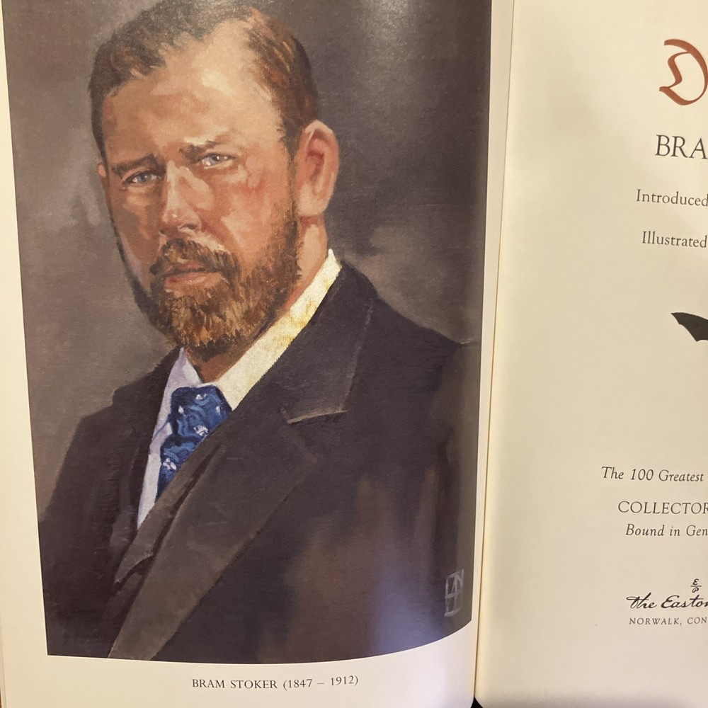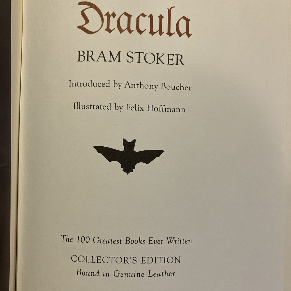 Easton Press leather edition of Bram Stoker 's "Dracula," a COLLECTOR'S edition, Illustrated by Felix Hoffmann, Introduced by Anthony Boucher, one of the 100 GREATEST BOOKS EVER WRITTEN series, published in 2005. Bound in hunter green leather, the book has camel tan French moire silk end leaves, acid-free paper, Symth-sewn binding, gold gilding on three edges, a satin book marker---in near FINE condition. Abraham Stoker, who lived from 1847--1912, popularly known as Bram Stoker, was an Irish author who wrote the 1897 Gothic horror novel, "Dracula," a milestone in Vampire fiction. Stoker who received his M.A. with Honors in pure mathematics at Dublin University, worked in the West End Lyceum Theatre and was a theatre critic for an Irish newspaper. His magnum opus "Dracula" has been adapted in numerous movies, films, short stories, and plays. In 1456, Vlad Dracula, having matured into a strong leader with a keen intellect and a penchant for command, finally claimed the Wallachian throne. He established Tirgoviste as his capital city, and he chose to build his castle in the mountains near the Arges River. Dracula was a strict and cruel ruler who enjoyed grisly forms of punishment---dismemberment, strangulation, skinning, burning, and exposure to wild animals, but impalement was his preferred methods of execution. The decaying corpses of the victims were often left on the stakes indefinitely as a warning to any enemies or potential criminals. After being forced from power in 1462, Dracula spent his final years imprisoned in a tower under the auspices of Hungary's King Matthias Corvinus. Vlad was actually more sadistic and bloodthirsty than Stoker's mysterious Count. 410 pages. I offer combined shipping.