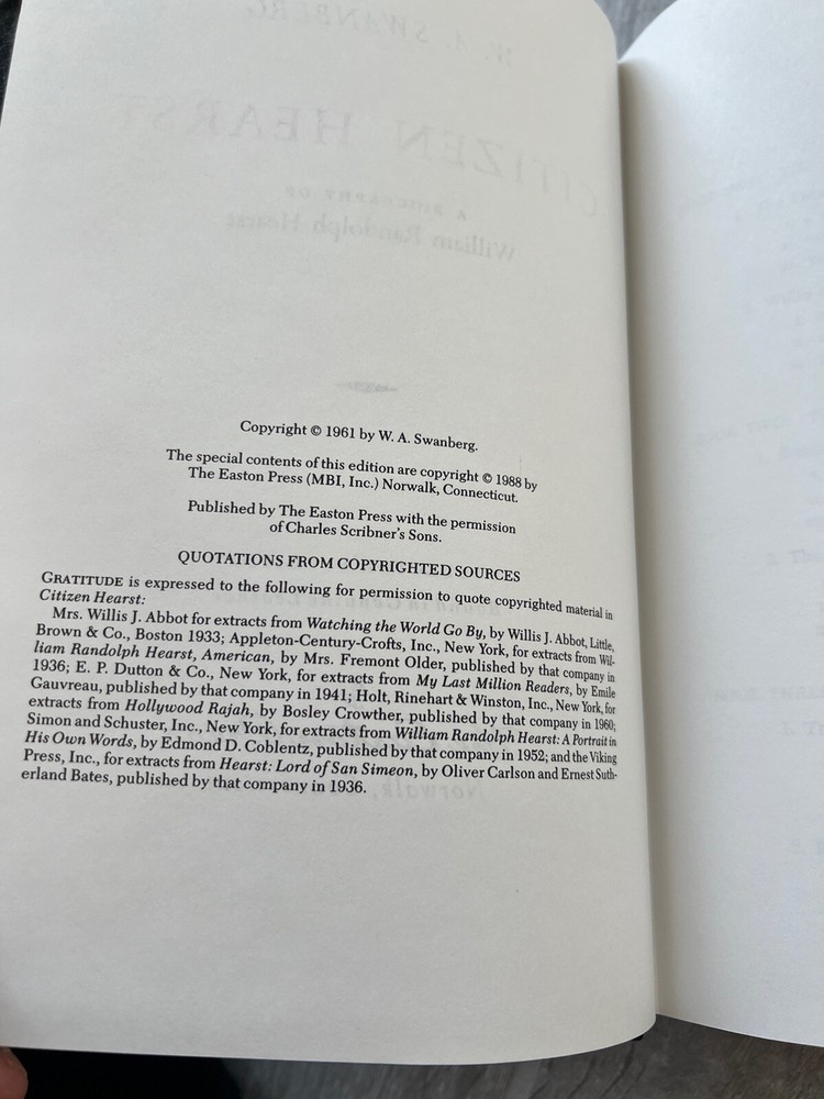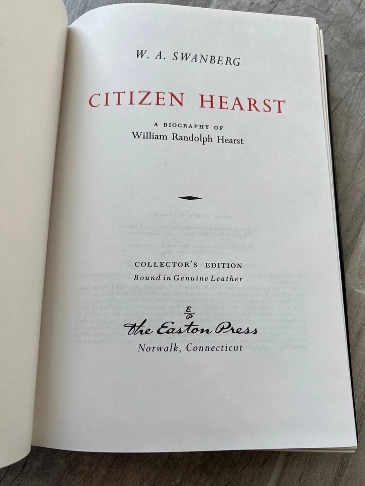 (230223) This book is a must have for your finer book collection! The cover has a beautiful shine with minor wear from typical handling. The pages are crisp and clean (no writing no highlighting). The spine and binding are in perfect shape. The book is written by WA Swanberg, a renowned biographer and historian, and is adorned with special attributes that make it a true masterpiece. With its English language, original printing, and antique aspect, this book is a valuable addition to any collection. Get your hands on this remarkable piece of history today and experience the wonder of Citizen Hearst! INCLUDES ORIGINAL PAPER INSERT! 22k Gold accents!!