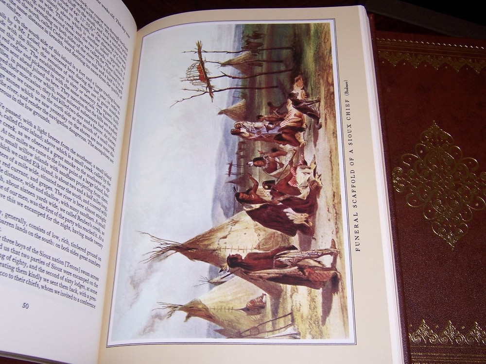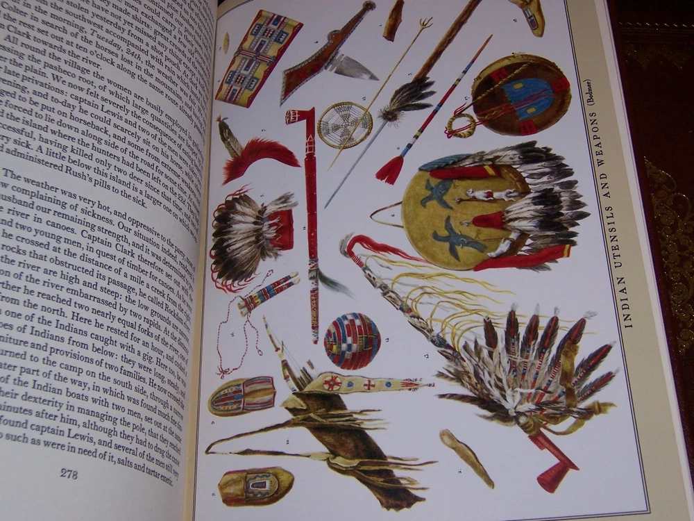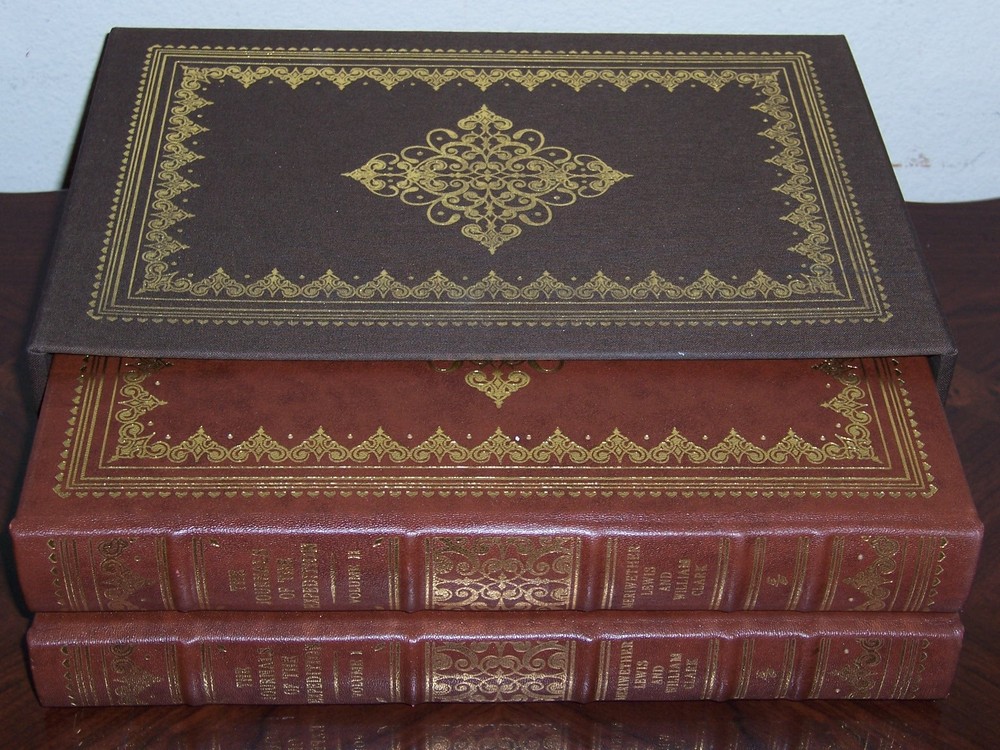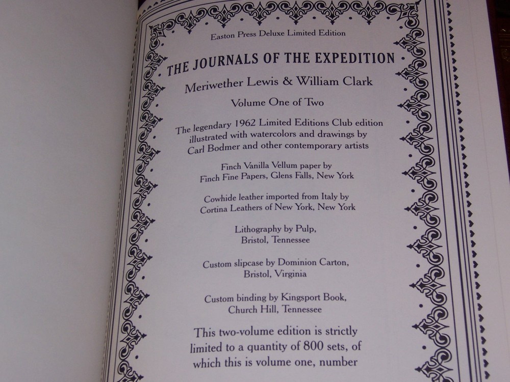 Deluxe Limited Edition Easton Press THE JOURNALS OF THE EXPEDITION in two volumes by Merriwether Lewis & William Clark The landmark journals for the most epic expedition in American history… In 1804, Lewis and Clark set off to explore the western territory of the vast Louisiana Purchase. The illustrated journals they kept document the majestic wilderness, unique animal species and American Indian peoples they encountered on the journey. This stunning edition reproduces all the detailed maps and stunning illustrations from the magnificent 1962 Limited Editions Club edition of the journals, bringing to life Lewis and Clark's legendary journey. Features include: 1. The legendary 1962 Limited Editions Club edition illustrated with watercolors and drawings by Carl Bodmer and other contemporary artists 2. Finch Vanilla Vellum paper by Finch Fine papers, Glens Fall, New York 3. Cowhide leather imported from Italy by Cortina Leathers 4. Lithography by Pulp, Bristol, Tennessee 5. Custom binding by Kingsport Book, Church Hill, Tennessee 6. Strictly limited to 800 sets, features two-color stamping and marbled endpapers. measured by 7 3/4" x 11 1/4" with Custom slipcase by Dominion Carton, Bristol, Virginia do not miss out this good deal Copyright by The Easton Press hubbed spine, bound in premium full leathers distinctive cover design, beautiful illustrations handsome, readable typefaces, permanent satin ribbon page marker elegant gilded page edges, endsheets of rich mabled pattern thread-sewn pages for durability and strength, long-lasting high quality, acid-neutral paper CONDITION DESCRIPTION: The books are in like new and unread condition: binding is tight, gold page edging still shiny, beautiful bright endleaves and satin ribbon page marker. It will make a great addition to any library. SHIPPING / HANDLING: Book(s) will be handled/packed very safely, and shipped via USPS media mail with delivery confirmation.