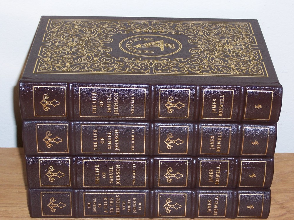 Heirloom Edition Easton Press THE LIFE OF SAMUEL JOHNSON in 4 volumes by James Boswell with marginal comments and markings from two copies annotated by Hester Lynch Thrale Piozzi Prepared for publication with an introduction by Edward G Fletcher Uniform brown leather bindings, distinct cover designs with decorations, frontispiece portrait in full color out-of-print, do not miss out this good deal Copyright by The Easton Press hubbed spine, bound in premium full leathers distinctive cover design, beautiful illustrations handsome, readable typefaces, permanent satin ribbon page marker elegant gilded page edges, endsheets of rich moire fabric thread-sewn pages for durability and strength, long-lasting high quality, acid-neutral paper LIST OF TITLES: a series in 4 volumes: 1.The Life of Samuel Johnson, I 2. The Life of Samuel Johnson, II 3. The Life of Samuel Johnson, III 4. The Journal of A Tour to the Hebrides with Samuel Johnson LL.D. CONDITION DESCRIPTION: Mint and unread condition, factory sealed in shrinkwrap binding is tight and gold page edging still shiny, beautiful bright endleaves and satin ribbon page marker. This set could be a precious addition to your family library. SHIPPING / HANDLING: Book(s) will be handled/packed very safely, and shipped via USPS media mail with delivery confirmation.