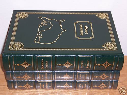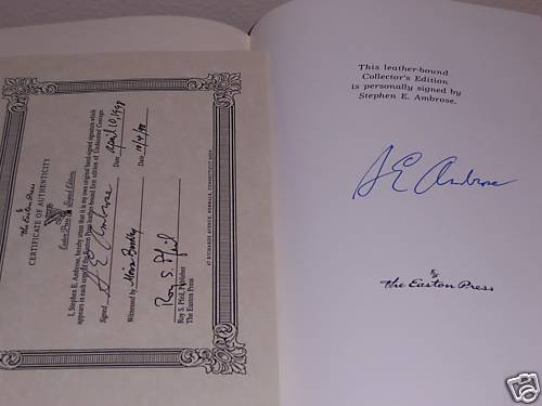 Easton Press Signed Collector's Edition Easton Press Undaunted Courage and the Lewis & Clark Collection in 3 volumes illustrated with photos and maps out-of-print, do not miss out this good deal Copyright by The Easton Press hubbed spine, bound in premium full leathers distinctive cover design, beautiful illustrations handsome, readable typefaces, permanent satin ribbon page marker elegant gilded page edges, endsheets of rich moire fabric thread-sewn pages for durability and strength, long-lasting high quality, acid-neutral paper LIST OF TITLES: a complete series in 3 volumes: UNDAUNTED COURAGE, personally signed by Stephen Ambrose, with Certificate of Authenticity JOURNALS OF THE EXPEDITION 1803-1806, Vol I & II, by Meriwether Lewis and William Clark, edited by Nicholas Biddle with an introduction by John Bakeless CONDITION DESCRIPTION: Mint and unread condition, factory sealed in shrinkwrap, exquisitely bound in genuine leather. This copy could be a precious addition to your family library. SHIPPING / HANDLING: Book(s) will be handled/packed very safely, and shipped via USPS media mail with delivery confirmation.