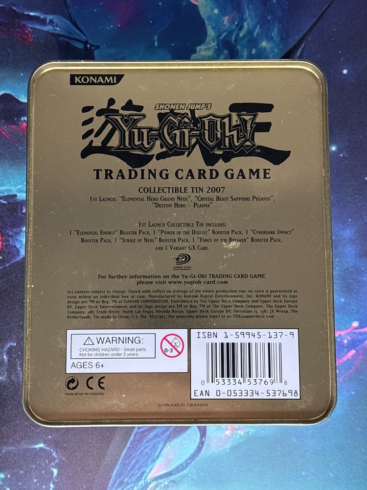 2007 Empty Collectible Tin and includes the promo card. Can be displayed in a collection or used to store cards. See photos for condition, the tin has some light scratches but otherwise in great shape. Additional photos available upon request. Limited Edition Secret Rare - Elemental HERO Grand Neos - CT04-EN001 in Very Light Play condition. Front is great, some light scratches on the back. Also, very light whitening in a couple spots. Would look great in a binder. Please check out my other listings including other Collectible Tin bundles! The tin and cards will be shipped securely in a box with bubble wrap support. Combined shipping discounts are available if you purchase multiple listings. Due to the looming Canada Post strike, letter mail and all CP shipping options will be unavailable. All orders will be shipped with tracking via the cheapest alternative carrier and any savings from the flat fee will be refunded. I appreciate your understanding during this uncertain situation. All U.S. / International orders will continue to use calculated shipping and will include tracking.