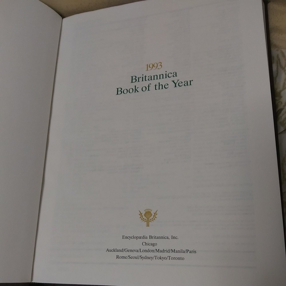 Encyclopedia Britannica 1993 Book Of The Year/Events Of 1992 Leather. Like New, very nice condition, no damage.