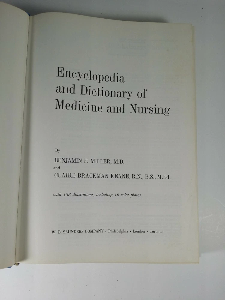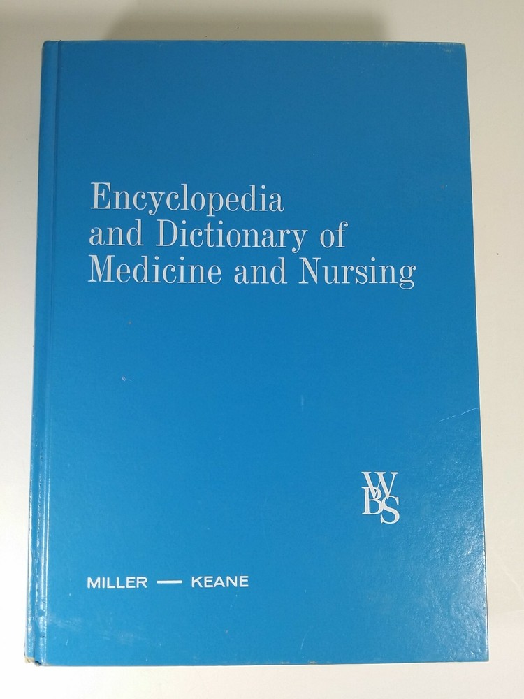 Encyclopedia and Dictionary of Medicine and Nursing by Miller & Keane 1972 Cover has some damage and wear. Has some light dirt staining inside.