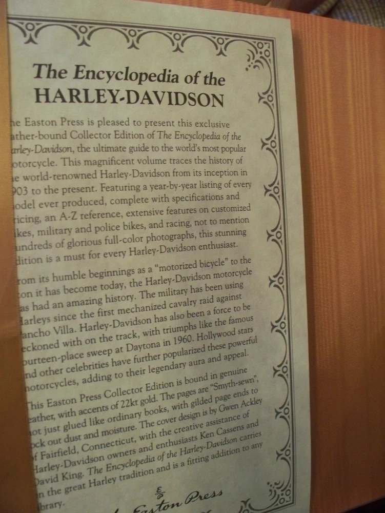 Encyclopedia of the Harley Davidson: The Ultimate Guide to the World's Most Popular Motorcycle. Easton Press/ Chartwell Books, Inc., Edison, NJ, Year 2003, Hardcover, Very Good Condition. This went to Harley's 100th Anniversary in Milwaukee but cause of weight it left the Chicago hotel room once and the special event timing was off for any autographs. Ebay now wants this seller to give month long returns to buyers in order to keep benefits and rating but "u nfortunately" we have bills to pay and cant wait a whole month for closure so our return policy will stay the same so you can return an item if not as described or DOA, "14 day" return policy from when item arrives. Our handling time is no longer 1 day it has been changed to a more relaxed 3 days after payment has been received. If you really need it shipped faster let us know. Shipping prices for lower 48 states.