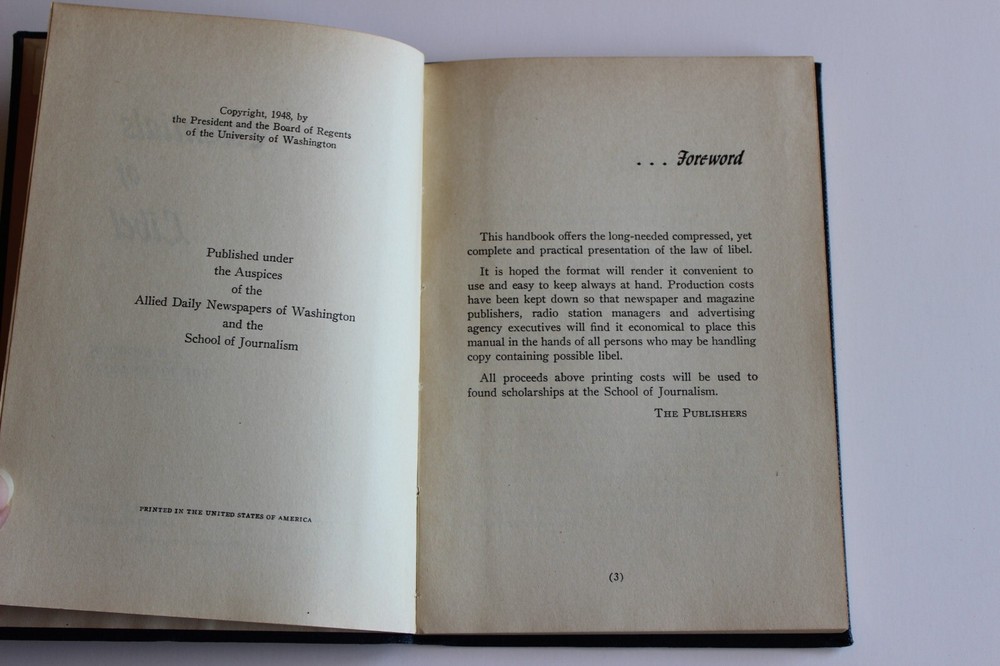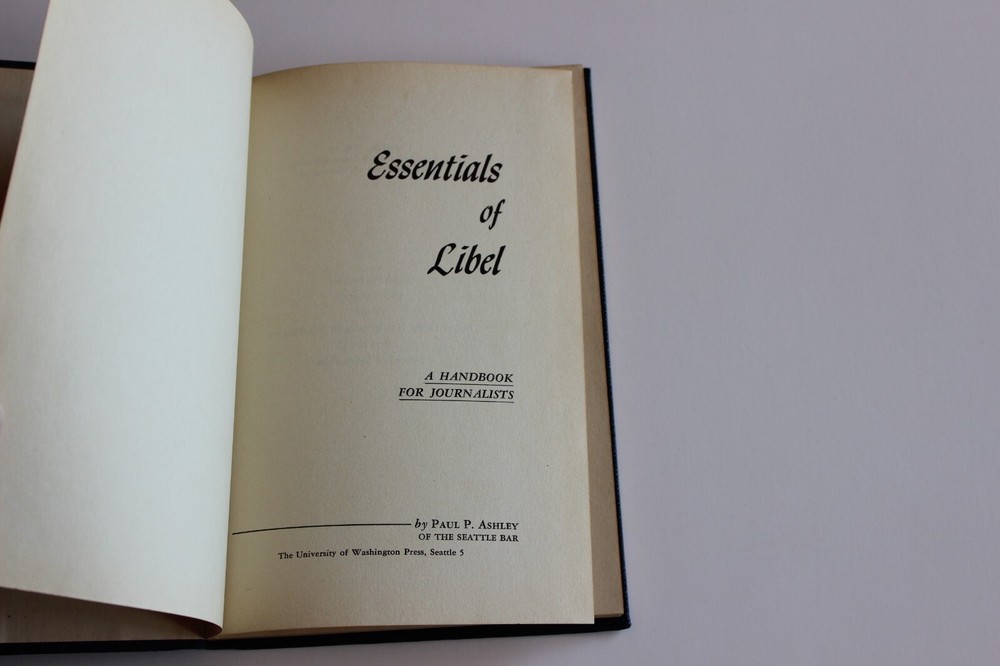 For sale is a leatherbound copy of Essentials of Libel A Handbook for Journalists by Paul P. Ashley, copyright 1948, 71 pages, published by the University of Washington. NOTE: Ebay has changed its listing template and may automatically insert information about the book based on the book's ISBN number which may or may not be correct or pertain to the actual copy of the book I am selling. I am not responsible for this information, only the information that I post in the "Description" area of this listing. CONDITION: Good. The covers have wear at the top and bottom of the spine and corners and there is a spot on the front cover. The pages are lightly tanned but clean and appear secure in their binding with no previous owner markings that I can see. Please look at all photos as they are part of the condition description. PAYMENT TERMS: Any form of payment accepted by Ebay Payments. ALL BOOKS WILL BE SHIPPED VIA THE UNITED STATES POSTAL SERVICE MEDIA MAIL WITH DELIVERY CONFIRMATION UPON RECEIPT OF PAYMENT. I SHIP WITHIN THE UNITED STATES AND ITS TERRITORIES ONLY . PLEASE EMAIL ME WITH ANY QUESTIONS YOU MAY HAVE ABOUT THIS ITEM BEFORE PURCHASING. THANK YOU FOR VISITING MY STORE. HAVE A GREAT DAY!