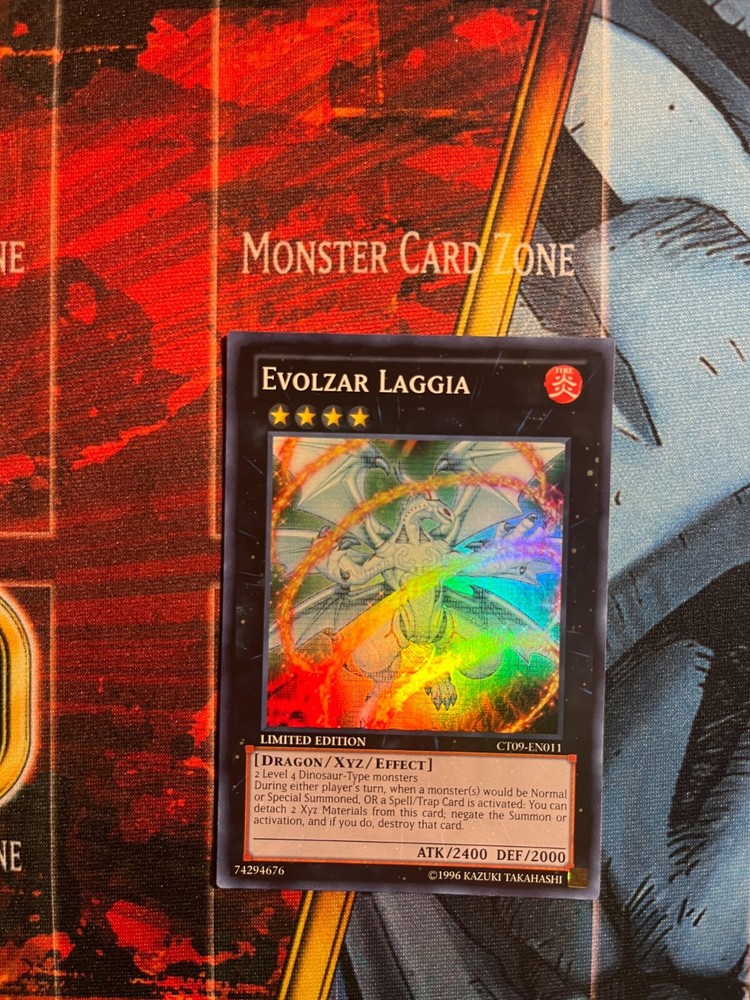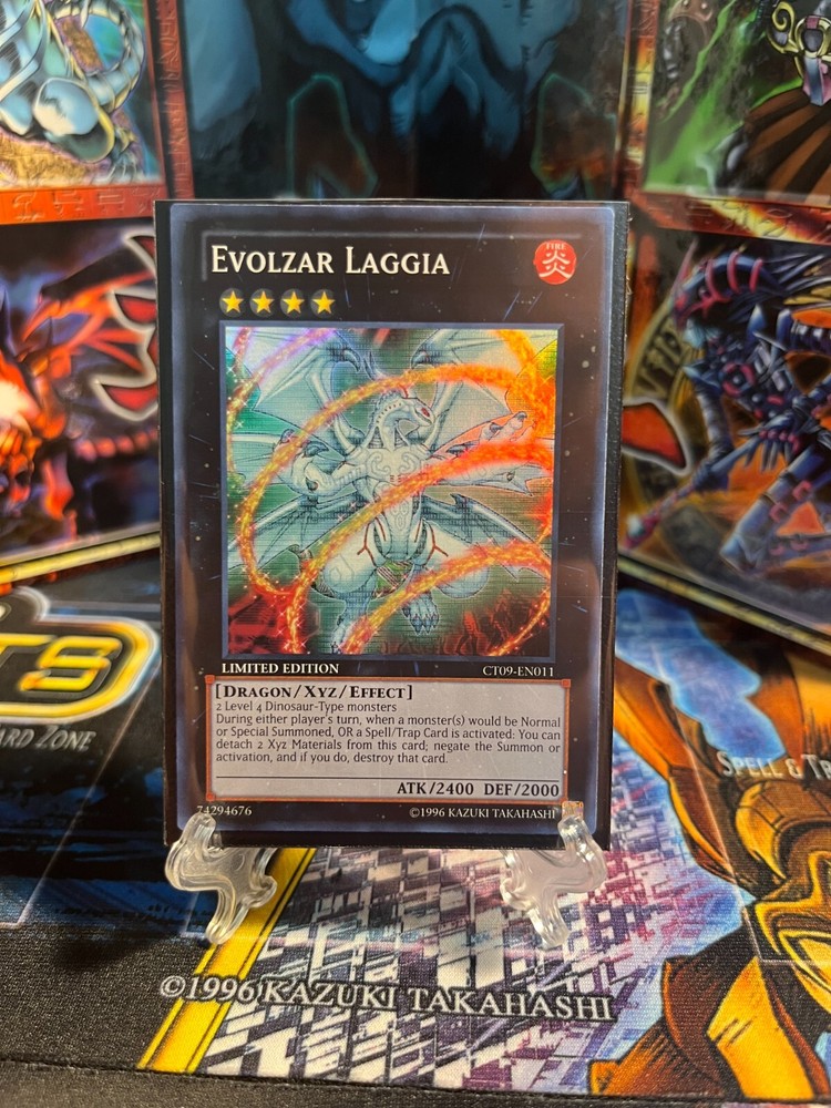 This limited edition collectors tin features the super rare Evolzar Laggia card from the Yu-Gi-Oh! TCG game. The card is an Xyz/Effect Monster type, with a Card Number of CT09-EN011 and a rarity of Super Rare. The card belongs to the 2012 Collectors Tins set and has a Fire attribute. The card is perfect for collectors and players alike, and is sure to be a valuable addition to any collection. Don't miss your chance to own this rare and sought-after card.