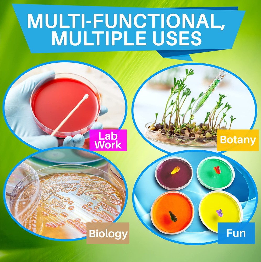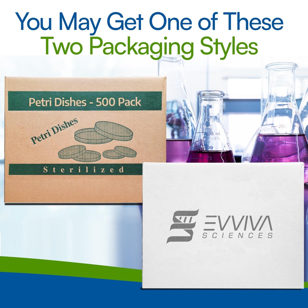 Thank you for choosing Evviva Sciences 500 pack petri dishes together with Evviva transfer pipettes. They are among the highest quality dishes available. They are made from premium quality polystyrene. They are an excellent choice for agar plates but also have a wide range of uses. They can be used for laboratory research projects, classroom science experiments, and mushroom cultivation. Whatever science project you have in mind, these are a great choice. Please also enjoy the 5 transfer pipettes to complement your science project. If you need any help with your project, we offer 24/7 customer support and will always be there to help with anything you need. Please consider these dishes! CASE OF 500 EVVIVA SCIENCES PETRI DISHES: Each case is packed in sleeves of 20 - 25 petri dishes. There are multiple sleeves per case, so you do not have to worry about opening and spoiling the entire bag. Just use the dishes you need and save the rest for another time. This is a great value! STURDY PLASTIC, PERFECT FOR POURING AGAR: These petri dishes are made with premium quality polystyrene, which works excellently for pouring agar plates. The plastic will not melt or warp when you pour hot agar into these dishes. MUSHROOMS, LAB RESEARCH, SCIENCE EDUCATION: Whether you are using these dishes for mushroom cultivation or for a classroom science project, these dishes will work great! They have a wide range of different uses, and are the perfect choice for any project. VENTED LIDS FOR AIR CIRCULATION & LESS CONDENSATION: Each petri plate has a vented lid so that there is improved air circulation. Condensation can ruin your agar plates and lead to poor performance. The vented lids reduce condensation significantly! INCLUDES 5 EVVIVA TRANSFER PIPETTES: These dishes come with 5 transfer pipettes that have a wide range of uses for science projects. The transfer pipettes will definitely come in handy for your project!