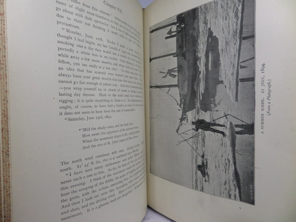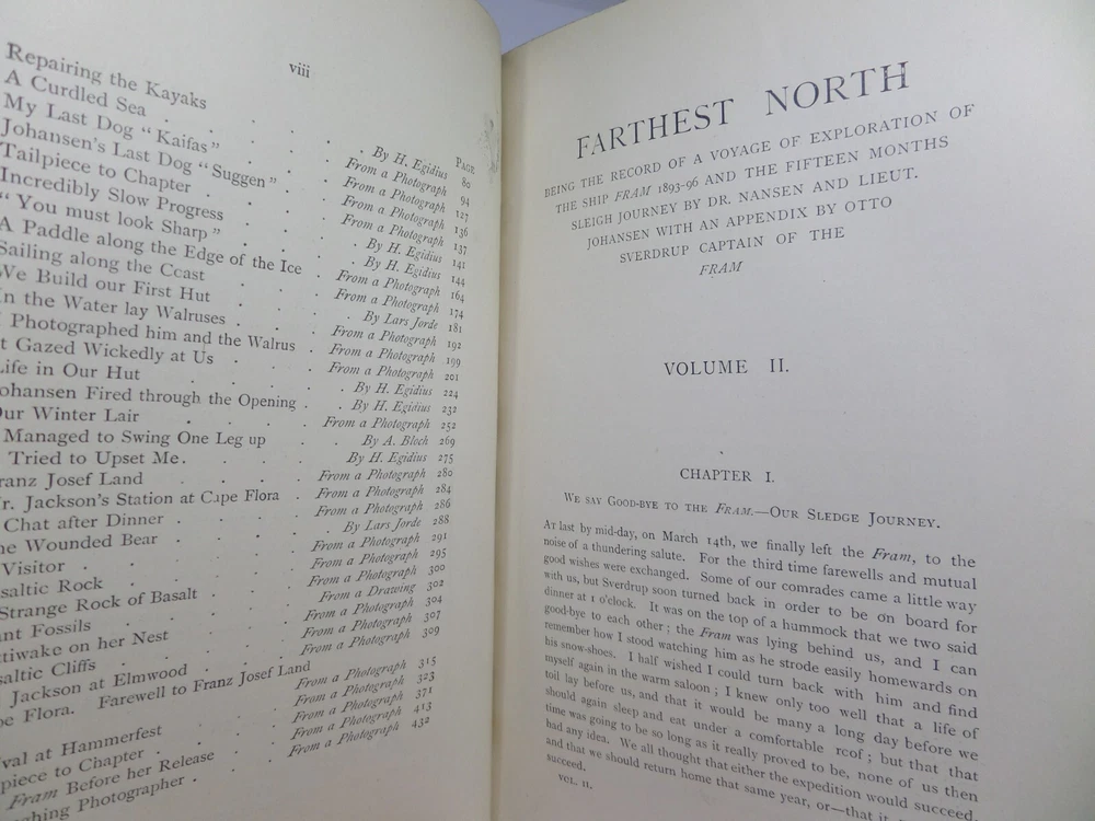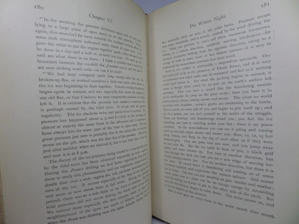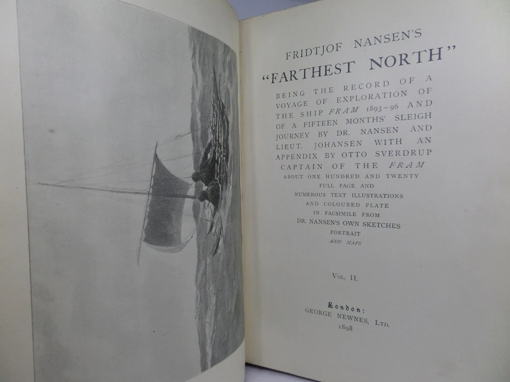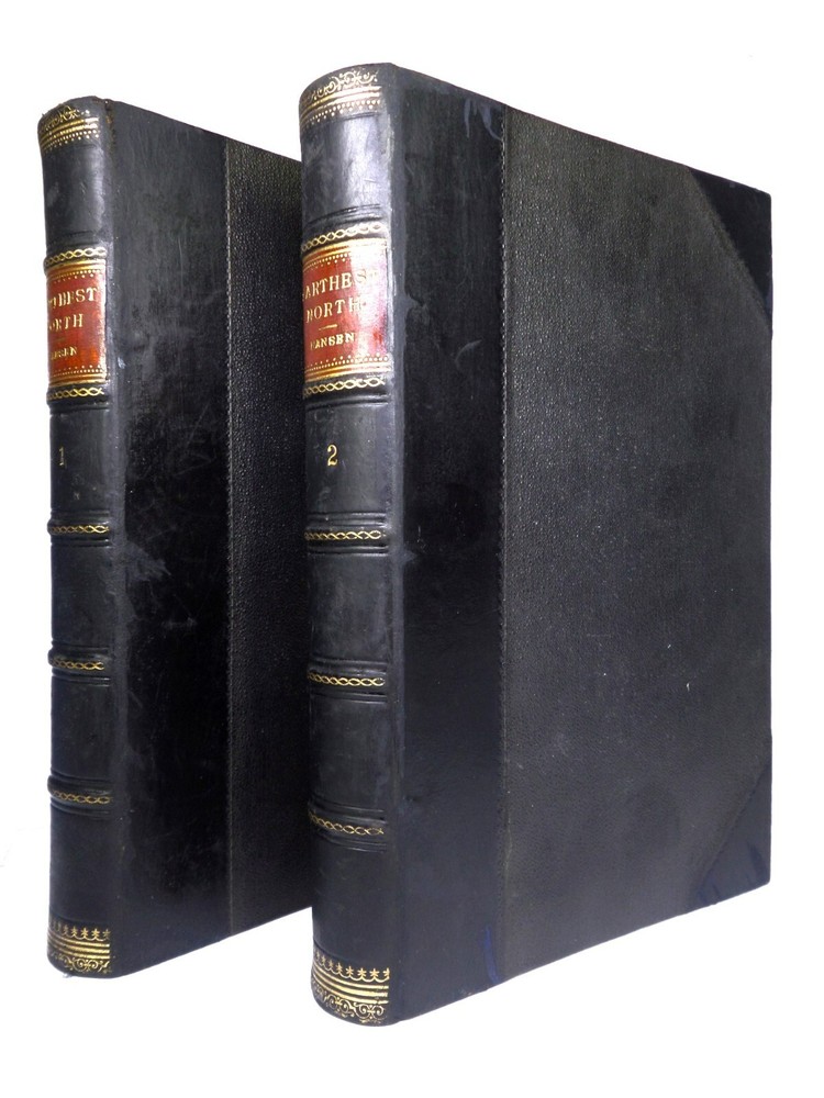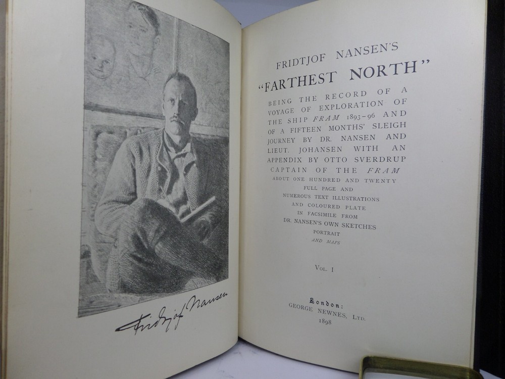 [NANSEN, FRIDTJOF (1861-1930)]. Farthest North: Being the Record of a Voyage of Exploration of the Ship Fram 1893-96 and of a Fifteen Months' Sleigh Journey by Dr. Nansen and Lieut. Johansen with an Appendix by Otto Sverdrup, Captain of the Fram . About One Hundred and Twenty Full Page and Numerous Text Illustrations and Coloured Plate in Facsimile from Dr. Nansen's own Sketches, Portrait and Maps. London: George Newnes, Ltd., 1898. Second edition. In two volumes. Leather-bound. Hardcover. Large octavo (24 cm x 16 cm). Pp. [xv], 480; [viii], 456. English text. Handsomely r ebound in half-calf, the spines gilt, speckled page edges. One colour plate from Nansen's own sketch, portrait frontispiece of Nansen, "around 120 full page black and white illustrations", plus many illustrations in the text. Fold out map in colour to the rear of vol.1. Condition: VERY GOOD. Bindings tight and secure with the hinges and joints intact. The covers and interiors largely very well-preserved. The folding map with some tears. Notes: Nansen's own account of "a remarkable achievement in Polar exploration" (PMM). He designed a ship, the Fram, to "slip like an eel out of the embraces of the ice" and which he hoped would drift along the ice to the North Pole. His account of the difficult journey by sledge and the return of the Fram to Tromso became a worldwide bestseller. International tracked shipping - dispatched promptly and securely. Please view my other rare books.
