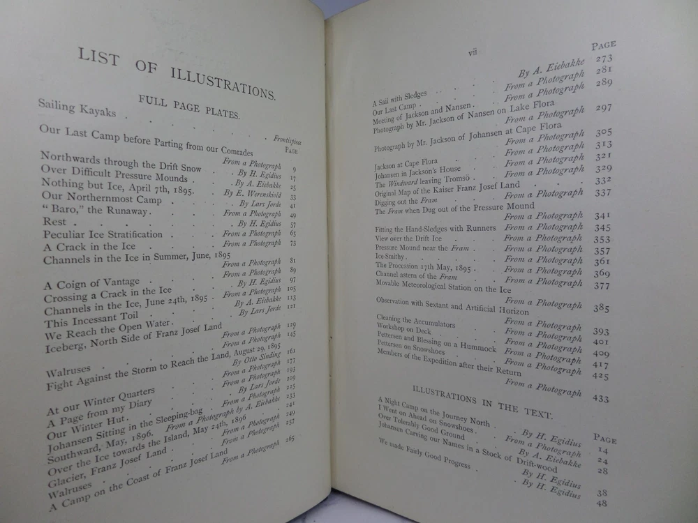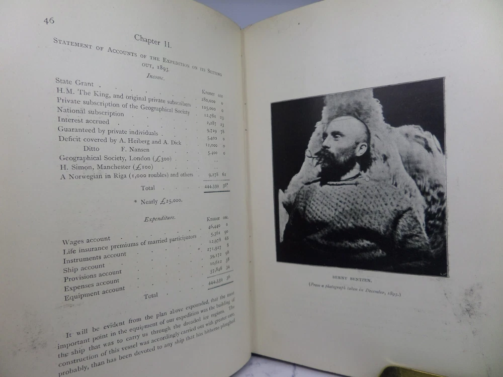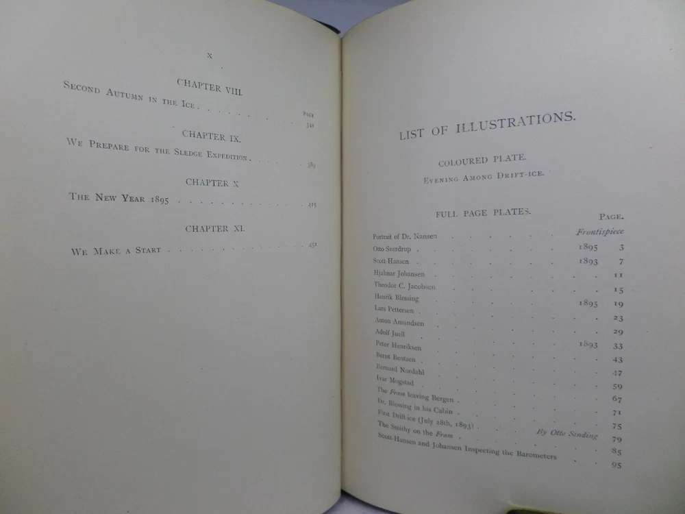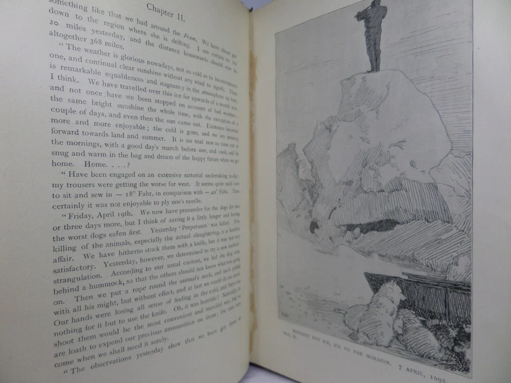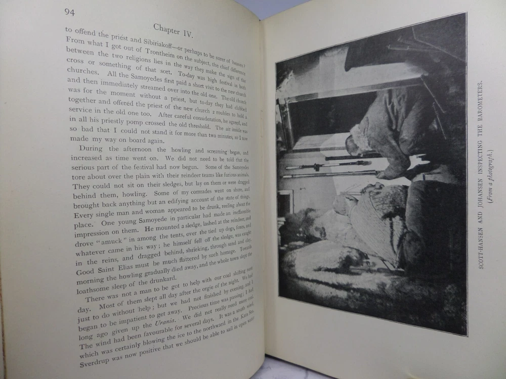 [NANSEN, FRIDTJOF (1861-1930)]. Farthest North: Being the Record of a Voyage of Exploration of the Ship Fram 1893-96 and of a Fifteen Months' Sleigh Journey by Dr. Nansen and Lieut. Johansen with an Appendix by Otto Sverdrup, Captain of the Fram . About One Hundred and Twenty Full Page and Numerous Text Illustrations and Coloured Plate in Facsimile from Dr. Nansen's own Sketches, Portrait and Maps. London: George Newnes, Ltd., 1898. Second edition. In two volumes. Leather-bound. Hardcover. Large octavo (24 cm x 16 cm). Pp. [xv], 480; [viii], 456. English text. Handsomely r ebound in half-calf, the spines gilt, speckled page edges. One colour plate from Nansen's own sketch, portrait frontispiece of Nansen, "around 120 full page black and white illustrations", plus many illustrations in the text. Fold out map in colour to the rear of vol.1. Condition: VERY GOOD. Bindings tight and secure with the hinges and joints intact. The covers and interiors largely very well-preserved. The folding map with some tears. Notes: Nansen's own account of "a remarkable achievement in Polar exploration" (PMM). He designed a ship, the Fram, to "slip like an eel out of the embraces of the ice" and which he hoped would drift along the ice to the North Pole. His account of the difficult journey by sledge and the return of the Fram to Tromso became a worldwide bestseller. International tracked shipping - dispatched promptly and securely. Please view my other rare books.