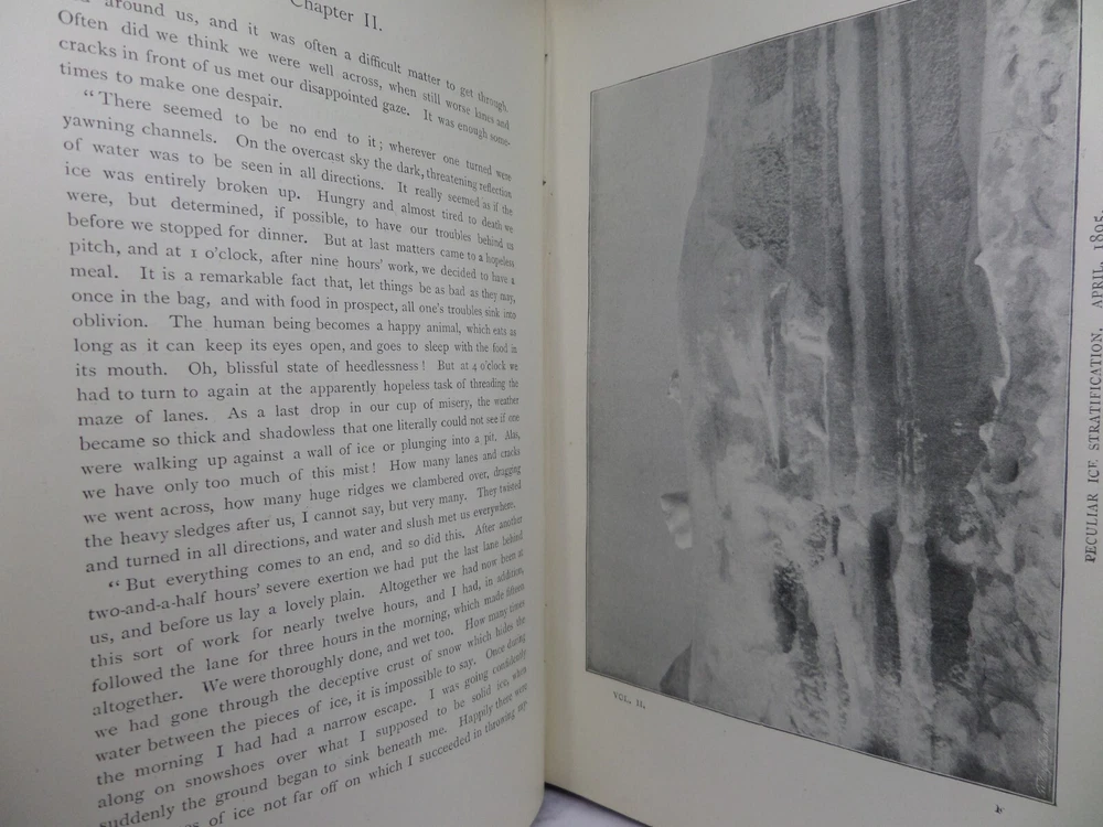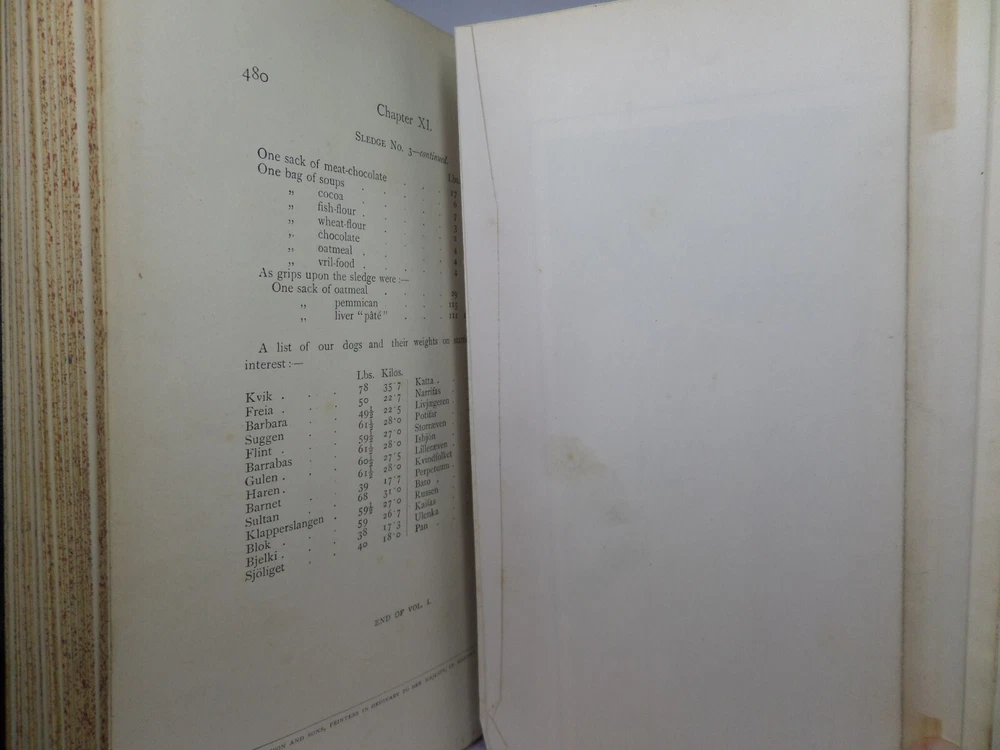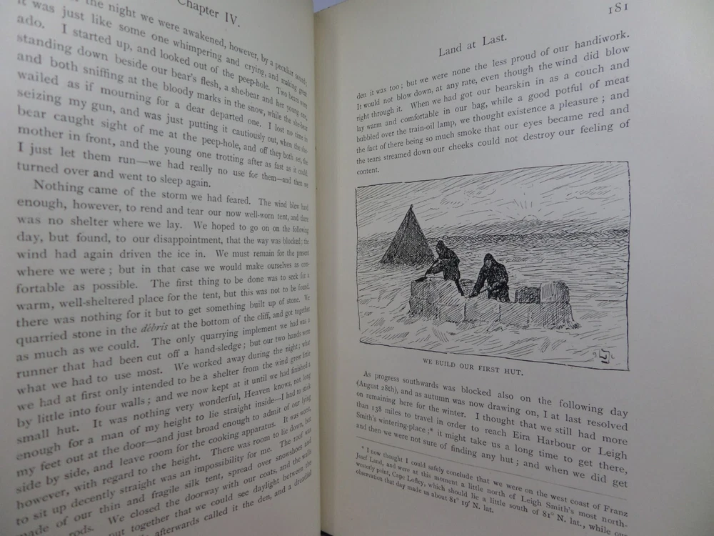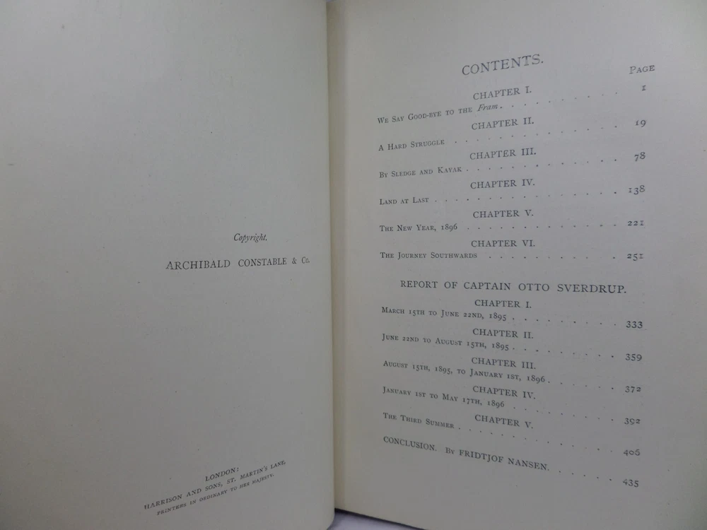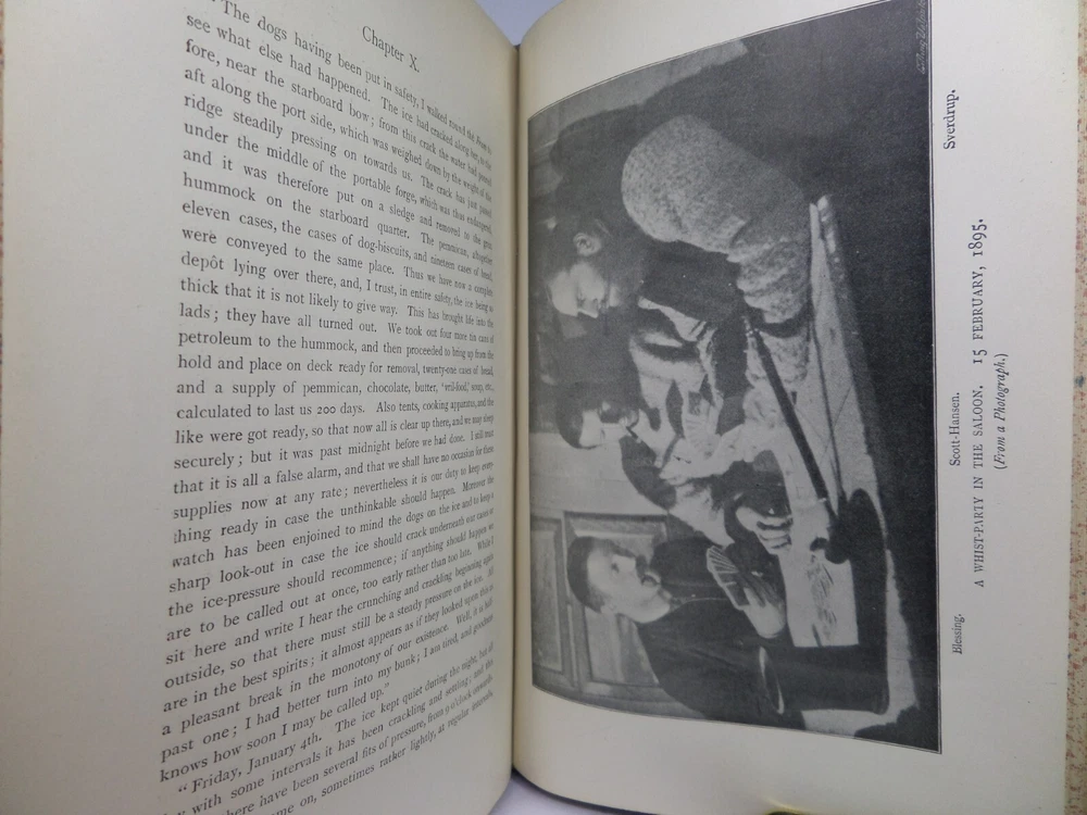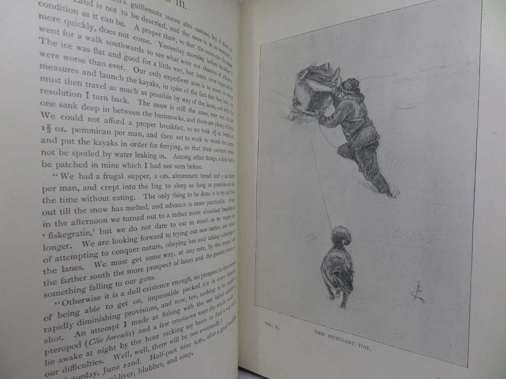 [NANSEN, FRIDTJOF (1861-1930)]. Farthest North: Being the Record of a Voyage of Exploration of the Ship Fram 1893-96 and of a Fifteen Months' Sleigh Journey by Dr. Nansen and Lieut. Johansen with an Appendix by Otto Sverdrup, Captain of the Fram . About One Hundred and Twenty Full Page and Numerous Text Illustrations and Coloured Plate in Facsimile from Dr. Nansen's own Sketches, Portrait and Maps. London: George Newnes, Ltd., 1898. Second edition. In two volumes. Leather-bound. Hardcover. Large octavo (24 cm x 16 cm). Pp. [xv], 480; [viii], 456. English text. Handsomely r ebound in half-calf, the spines gilt, speckled page edges. One colour plate from Nansen's own sketch, portrait frontispiece of Nansen, "around 120 full page black and white illustrations", plus many illustrations in the text. Fold out map in colour to the rear of vol.1. Condition: VERY GOOD. Bindings tight and secure with the hinges and joints intact. The covers and interiors largely very well-preserved. The folding map with some tears. Notes: Nansen's own account of "a remarkable achievement in Polar exploration" (PMM). He designed a ship, the Fram, to "slip like an eel out of the embraces of the ice" and which he hoped would drift along the ice to the North Pole. His account of the difficult journey by sledge and the return of the Fram to Tromso became a worldwide bestseller. International tracked shipping - dispatched promptly and securely. Please view my other rare books.