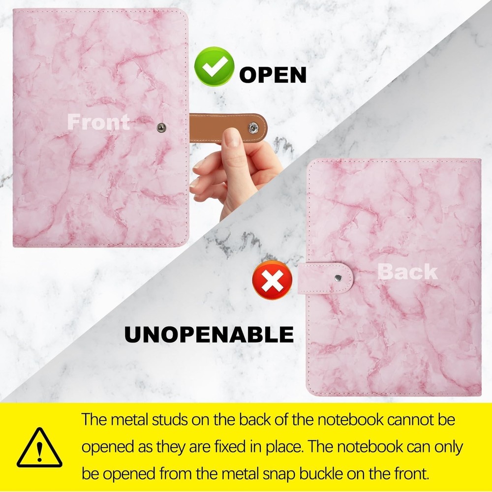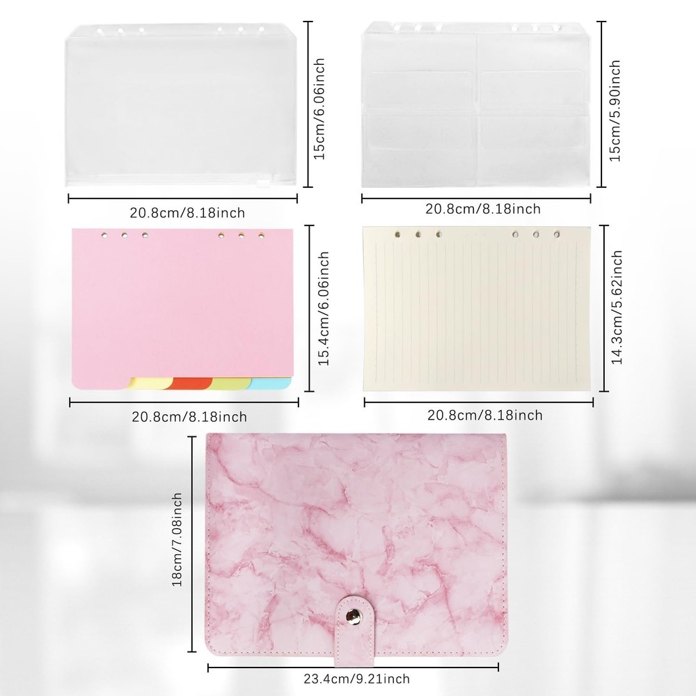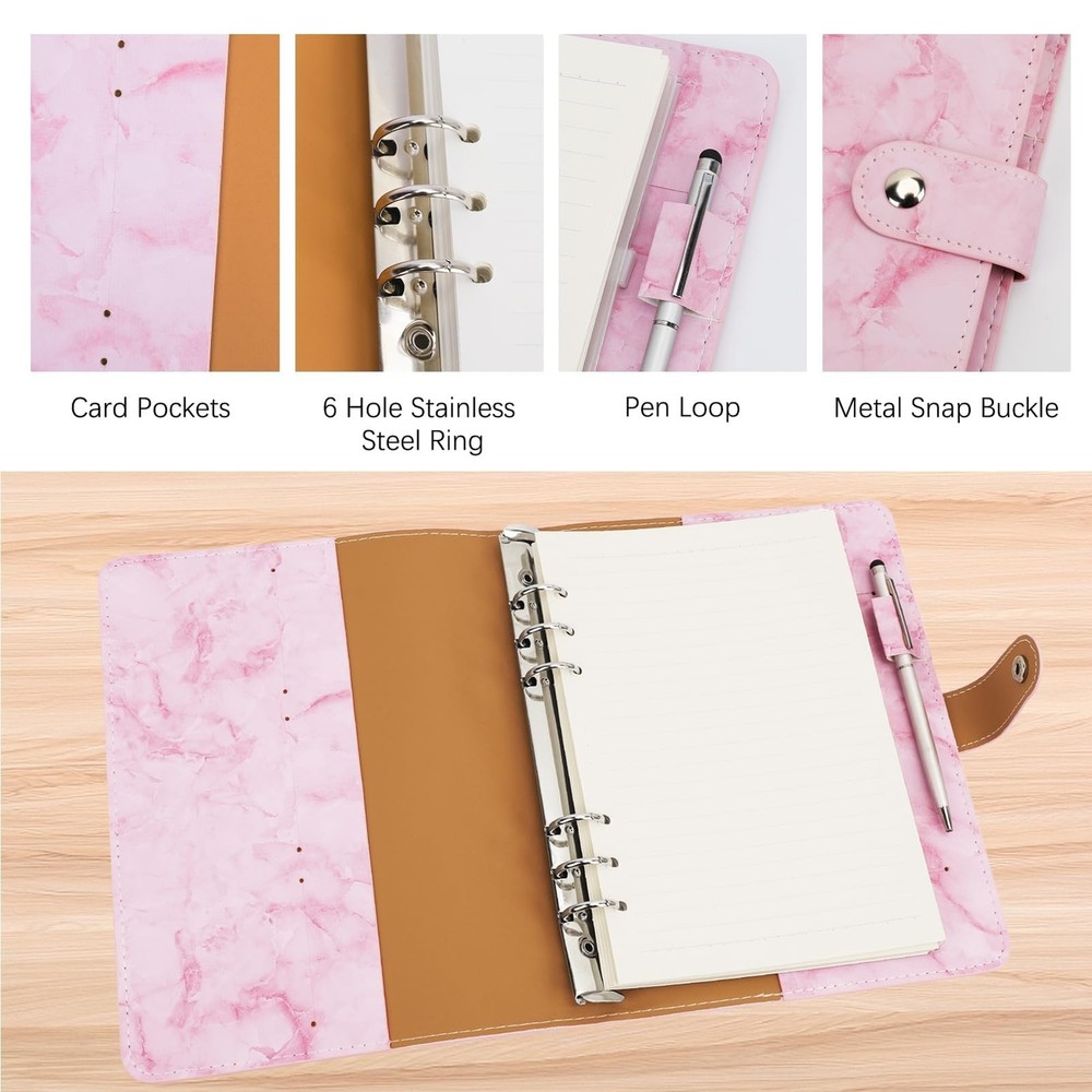 FYY Leather A5 Binder 6 Ring Binder Notebook - Refillable Notebook A5 Planner Binder with Binder Pockets, A5 Dividers, A5 Refill Paper, PU Leather Travel Binder Journal Cover Binder Marble Pink Product Details Size: A5 Color: Marble Pink Brand: FYY MPN: FYY-US-D-1186-Binder-Notebook-A5-Mar-P UPC: Does not apply EAN: Does not apply Color: Marble Pink Material: Faux Leather, Stainless Steel Capacity: 1.15 Pounds Brand: FYY Sheet Size: 5.6 x 8.2 Inches Manufacturer: FYY Brand: FYY Item Weight: 1.12 pounds Product Dimensions: 9.2 x 7 x 0.1 inches Item model number: FYY-US-D-1186-Binder-Notebook-A5-Mar-P Color: Marble Pink Cover Material: Faux Leather Material Type: Faux Leather, Stainless Steel Number of Dividers: 5 Size: A5 Sheet Size: 5.6 x 8.2 Inches Number of Holes: 6 Manufacturer Part Number: FYY-US-D-1186-Binder-Notebook-A5-Mar-P Date First Available: August 29, 2023 Quality MaterialFYY leather a5 journal binder is wear-resistant and comfortable to handle, making it a good assistant for your office. The card slots and pockets inside can organize your cards, tickets, cash, etc. The pen holder can keep the pen in place. Convenient StructureThe 6 rings binder a5 is structured with a convenient metal snap closure, include A5 refill paper, binder pockets and dividers paper sheet inside, perfect for a school notebook, office notebook, travel journal, budget noteboook, sketchbook, notebook, personal organizer, a planner, etc. Sturdy 6-ringsMade of sturdy stainless steel, can hold the paper firmly and prevent papers from falling off. With 2cm inner diameter, the binder can keep 80-100 sheets paper, meeting your daily needs. Perfect SizeThe size of the a5 journal binder cover is 23.5 x 17.8 x 2 cm (9.2 x 7 x 0.8 inches), perfect for your shoulder bags and backpacks. An ideal gift for Christmas, New Year, Valentine's Day, Birthday. Package ContainThe 6 rings binder a5 includes 1pcs 6 ring binder cover, 80 sheets of lined paper, 3pcs binder pockets with 3 styles, and 5pcs dividers paper sheet. Your 100% satisfaction is our mission. If there is any problem about our items, please feel free to contact us in e-mail, we will provide money-back or replacement service.