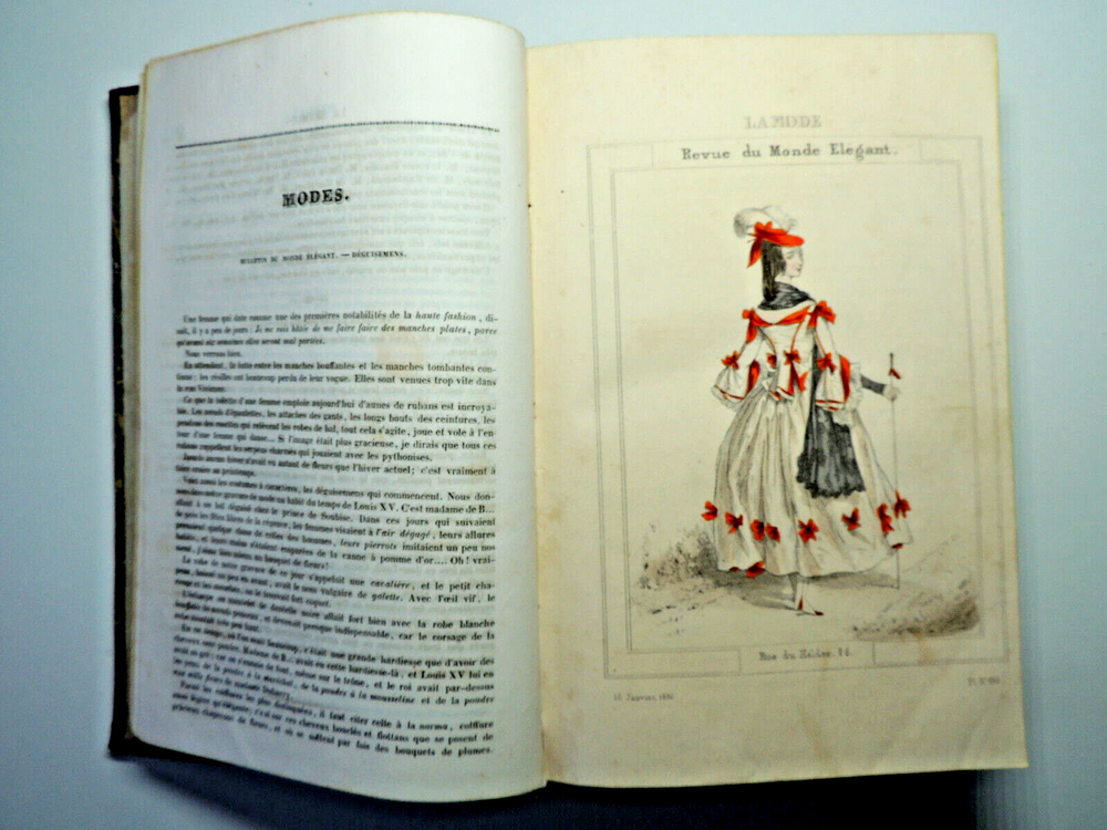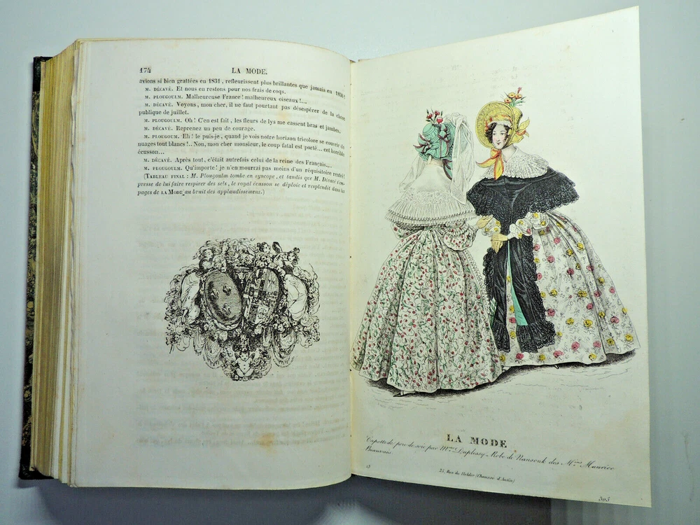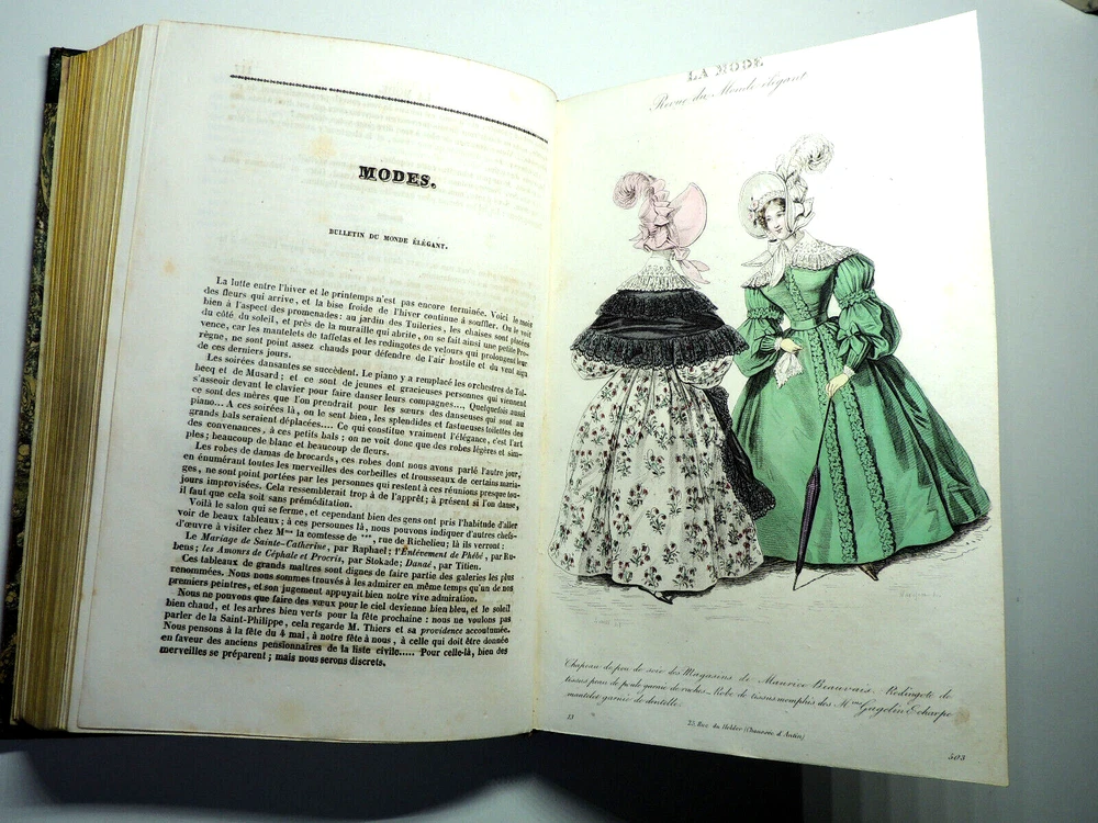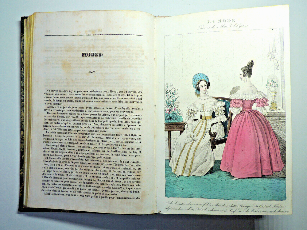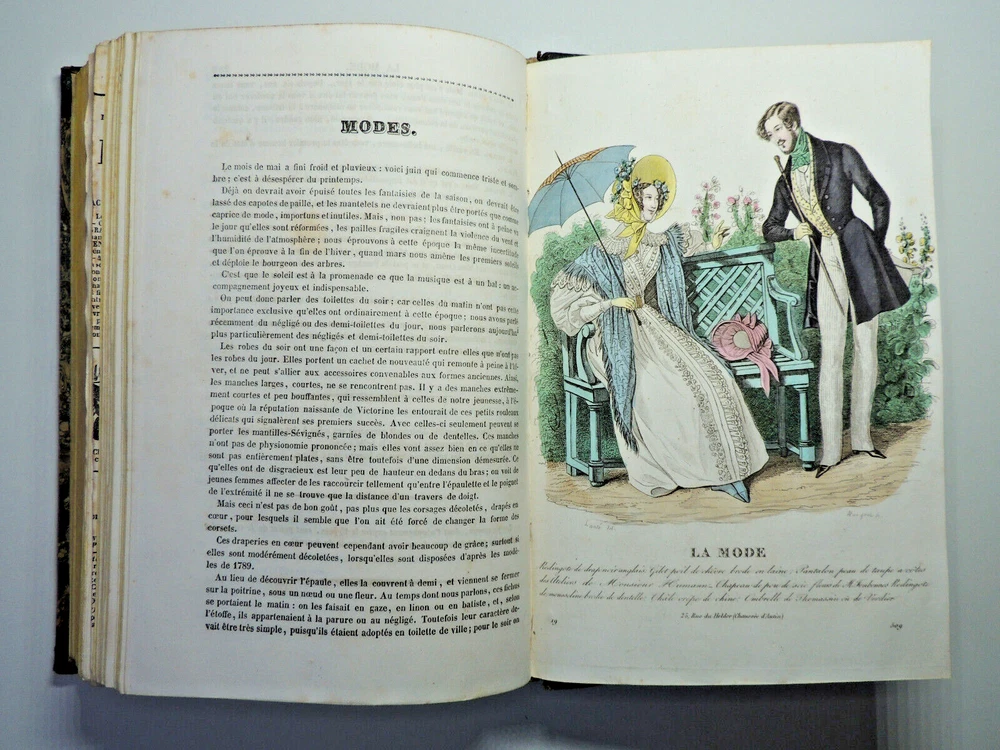 Fashion Journal 1836. 23 Color Plates The description of this item has been automatically translated. If you have any questions, please feel free to contact us. Fashion. 1836 Dedication to Viscount Edouard Walsh, fashion director The year 1836 was a time of transition in the fashion world, marking the end of the Regency era and the beginning of the Victorian era. Here are some characteristic elements of fashion from this period: Female Figure: The female figure in the early 1830s was marked by broad shoulders, a narrow waist, and a full skirt. Dresses were often decorated with ruffles, ruching and draping, creating a bell-shaped silhouette. Basque bodices: Bodices were fitted and often featured peplums, ruffles that reached down to the hips. These peplums added volume and dimension to the silhouette. Lamb sleeves: The sleeves were wide and puffy at the shoulders, but narrowed towards the wrists. These lamb sleeves were popular and gave a romantic look to outfits. Hats and headdresses: Women generally wore hats, often decorated with feathers, ribbons and flowers. Hair was styled in low buns and decorated with accessories such as headbands and combs. Fabrics and Patterns: The fabrics used were often light and flowing, such as chiffon and organdy. Floral patterns and stripes were popular, adding liveliness to outfits. Colors: Bright colors were all the rage, with shades of pink, blue, green and yellow. Checkered and striped designs were also common. half leather bound flight, tears, complete, 25x15, good copy of this sought-after work. 1836 ref/256 The year 1836 was a time of transition in the fashion world, marking the end of the Regency era and the beginning of the Victorian era. Here are some characteristic elements of fashion from this period: Female Figure: The female figure in the early 1830s was marked by broad shoulders, a narrow waist, and a full skirt. Dresses were often decorated with ruffles, ruching and draping, creating a bell-shaped silhouette. Lamb sleeves: The sleeves were wide and puffy at the shoulders, but narrowed towards the wrists. These lamb sleeves were popular and gave a romantic look to outfits. Hats and headdresses: Women generally wore hats, often decorated with feathers, ribbons and flowers. Hair was styled in low buns and decorated with accessories such as headbands and combs. Fabrics and Patterns: The Caractéristiques spéciales Édition originale Caractéristiques spéciales Illustré Auteur La mode illustrée Date de publication 1836 Objet modifié Non Reliure Cuir Langue Français Époque XIXème Nom Mode Sujet Livres illustrés