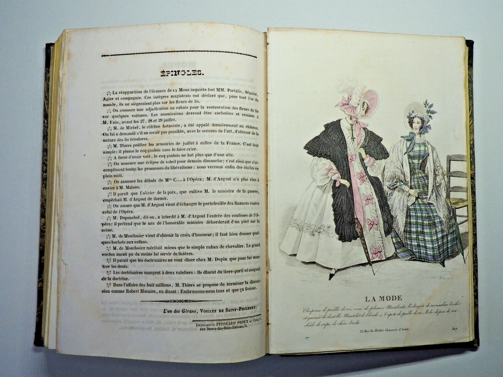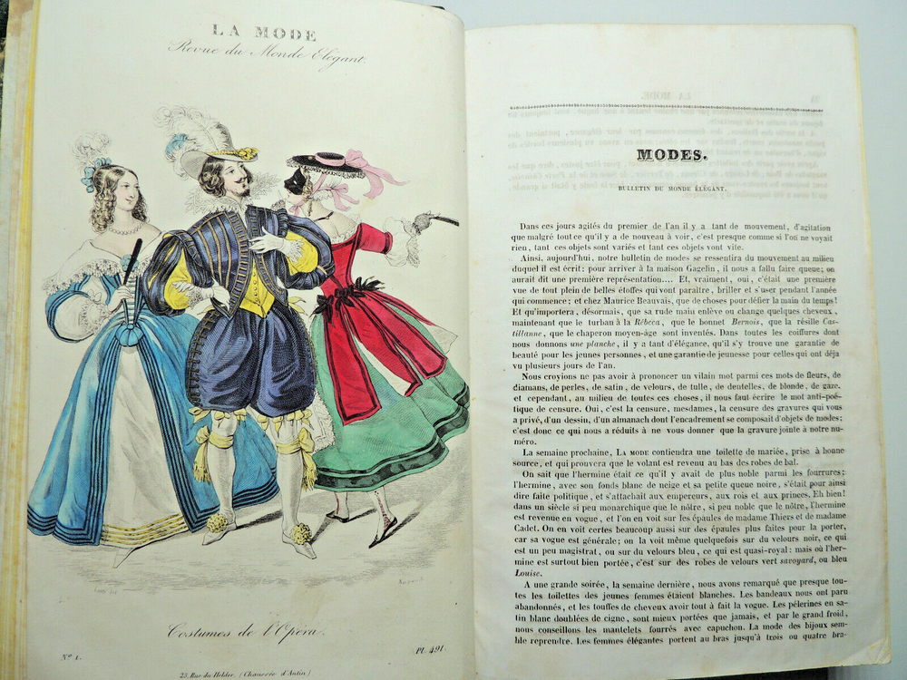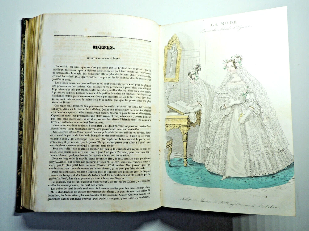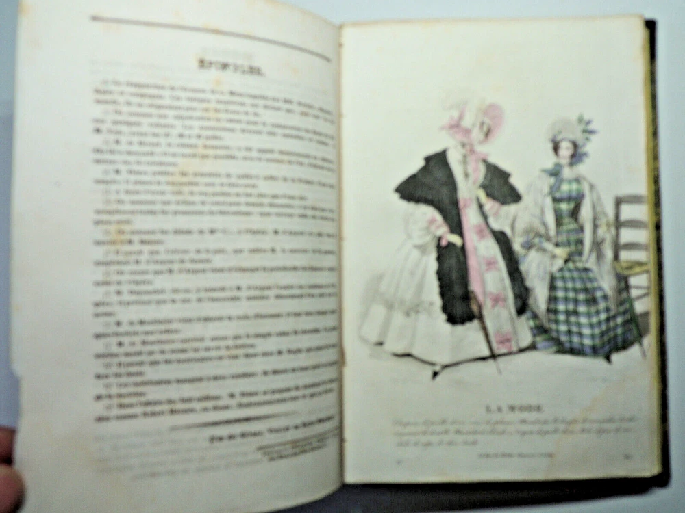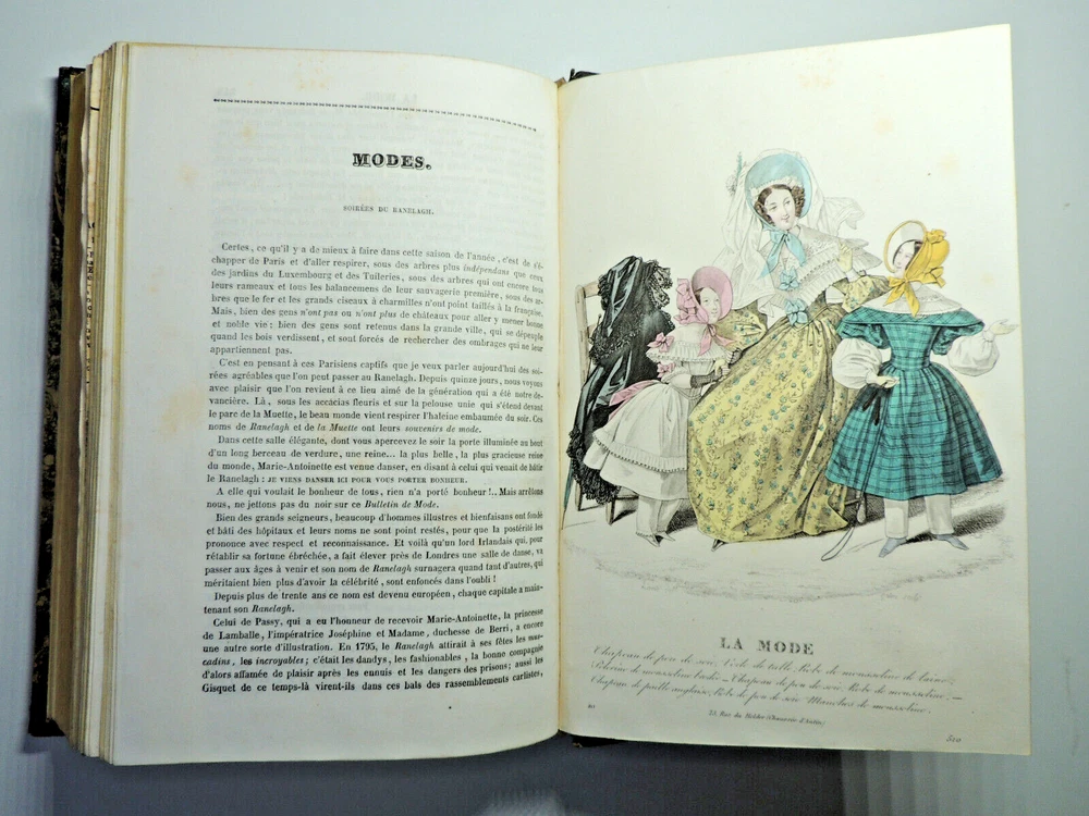 Fashion Journal 1836. 23 Color Plates The description of this item has been automatically translated. If you have any questions, please feel free to contact us. Fashion. 1836 Dedication to Viscount Edouard Walsh, fashion director The year 1836 was a time of transition in the fashion world, marking the end of the Regency era and the beginning of the Victorian era. Here are some characteristic elements of fashion from this period: Female Figure: The female figure in the early 1830s was marked by broad shoulders, a narrow waist, and a full skirt. Dresses were often decorated with ruffles, ruching and draping, creating a bell-shaped silhouette. Basque bodices: Bodices were fitted and often featured peplums, ruffles that reached down to the hips. These peplums added volume and dimension to the silhouette. Lamb sleeves: The sleeves were wide and puffy at the shoulders, but narrowed towards the wrists. These lamb sleeves were popular and gave a romantic look to outfits. Hats and headdresses: Women generally wore hats, often decorated with feathers, ribbons and flowers. Hair was styled in low buns and decorated with accessories such as headbands and combs. Fabrics and Patterns: The fabrics used were often light and flowing, such as chiffon and organdy. Floral patterns and stripes were popular, adding liveliness to outfits. Colors: Bright colors were all the rage, with shades of pink, blue, green and yellow. Checkered and striped designs were also common. half leather bound flight, tears, complete, 25x15, good copy of this sought-after work. 1836 ref/256 The year 1836 was a time of transition in the fashion world, marking the end of the Regency era and the beginning of the Victorian era. Here are some characteristic elements of fashion from this period: Female Figure: The female figure in the early 1830s was marked by broad shoulders, a narrow waist, and a full skirt. Dresses were often decorated with ruffles, ruching and draping, creating a bell-shaped silhouette. Lamb sleeves: The sleeves were wide and puffy at the shoulders, but narrowed towards the wrists. These lamb sleeves were popular and gave a romantic look to outfits. Hats and headdresses: Women generally wore hats, often decorated with feathers, ribbons and flowers. Hair was styled in low buns and decorated with accessories such as headbands and combs. Fabrics and Patterns: The Caractéristiques spéciales Édition originale Caractéristiques spéciales Illustré Auteur La mode illustrée Date de publication 1836 Objet modifié Non Reliure Cuir Langue Français Époque XIXème Nom Mode Sujet Livres illustrés
