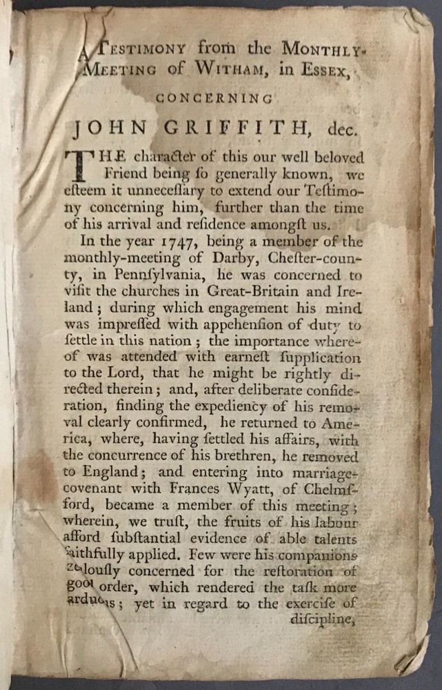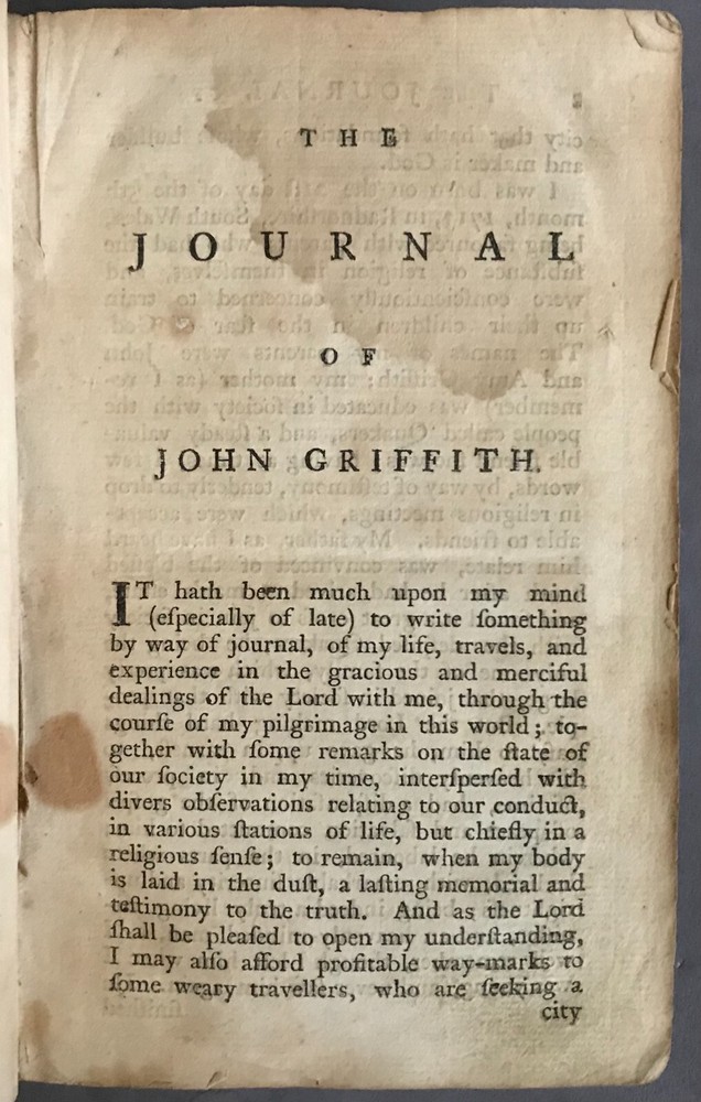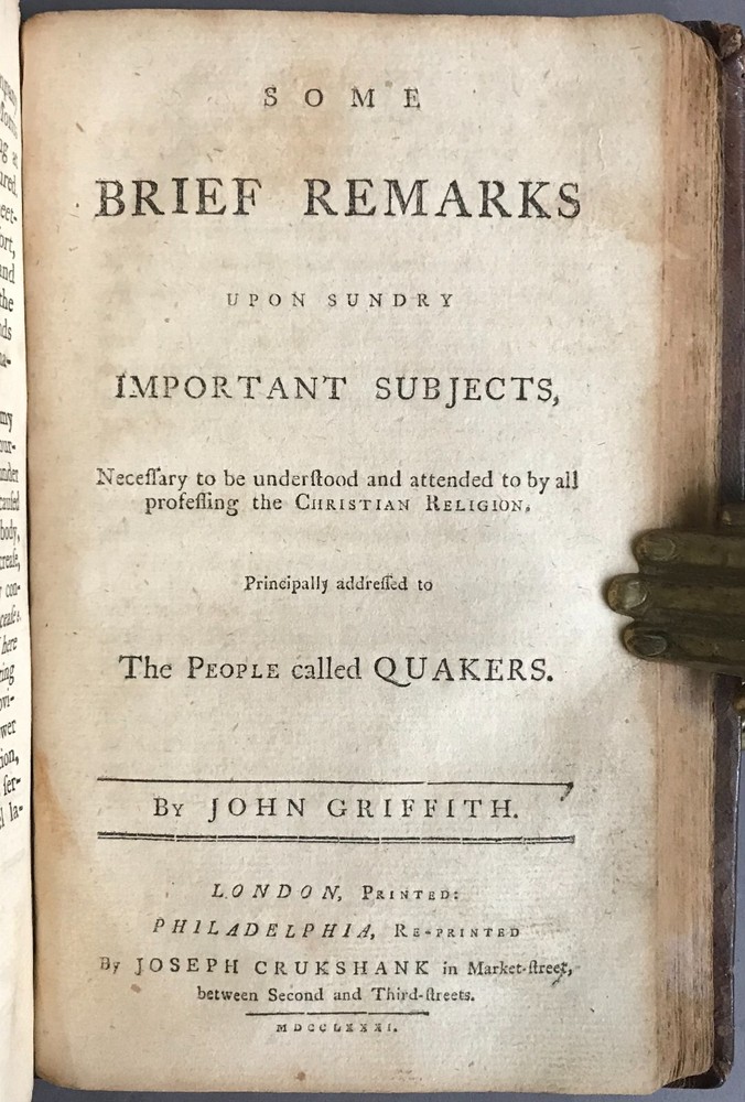 First US Ed. John Griffith A Journal of the Life, Tavels, and Labours… 1780/1 John Griffith. A Journal of the Life, Tavels, and Labours in the Work of the Ministry [bound with:] Some Brief Remarks Upon Sundry Important Subjects, Necessary to be Understood and attended to by All Professing the Christian Religion, Principally Addressed to the People Called Quakers . Philadelphia: Re-printed by Joseph Cruikshank, 1780/1781. First American editions. Octavo. iv, 426pp; (8), 112pp. Contemporary full calf, five raised bands. The journal of English Quaker minister John Griffith (1713 – 1776). Includes valuable information on his travels through the North and Mid-Atlantic states as well as England. Includes Quaker doctrines, discussion of Quaker meetings, etc., with his account of his capture by privateers on the high seas. An interesting American Revolutionary War imprint. Smith I, 871; Sabin, 28825; Evans, 16793. Extremities rubbed, bumped, and soiled, with slight loss to spine head; light toning, scattered foxing and dampstaining throughout; ink/pencil inscriptions to (nearly detached) first blank, front pastedown. About very good. NPD-00106A Please visit our eBay store for more great biographies and memoirs! https://www.ebay.com/str/inkqnabula/Biography-Memoir/_i.html?_storecat=30600674014