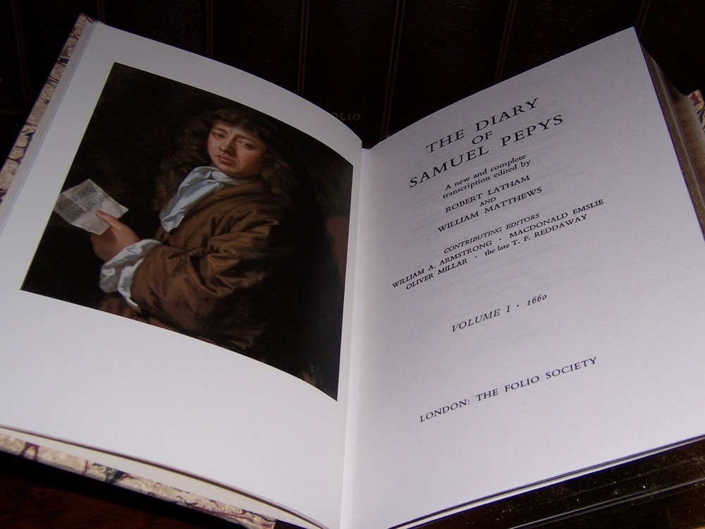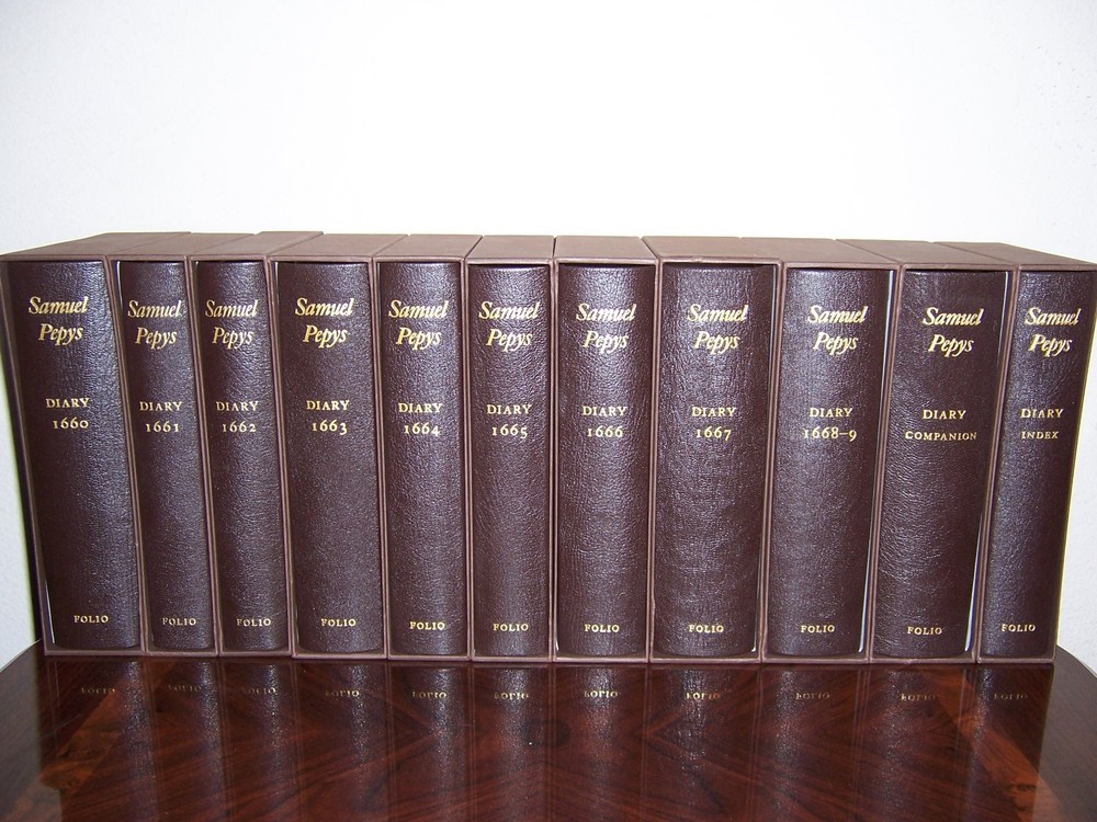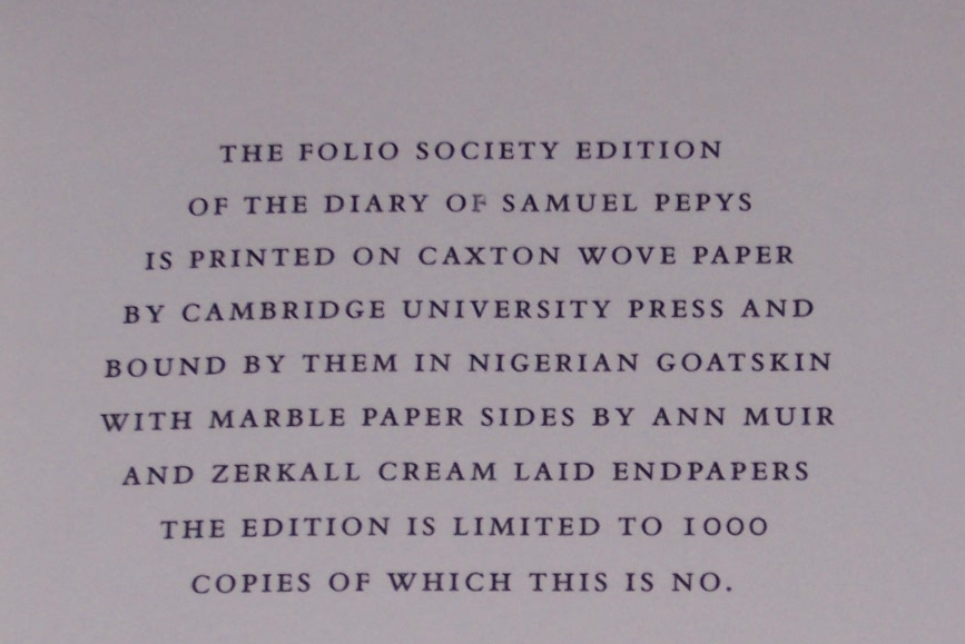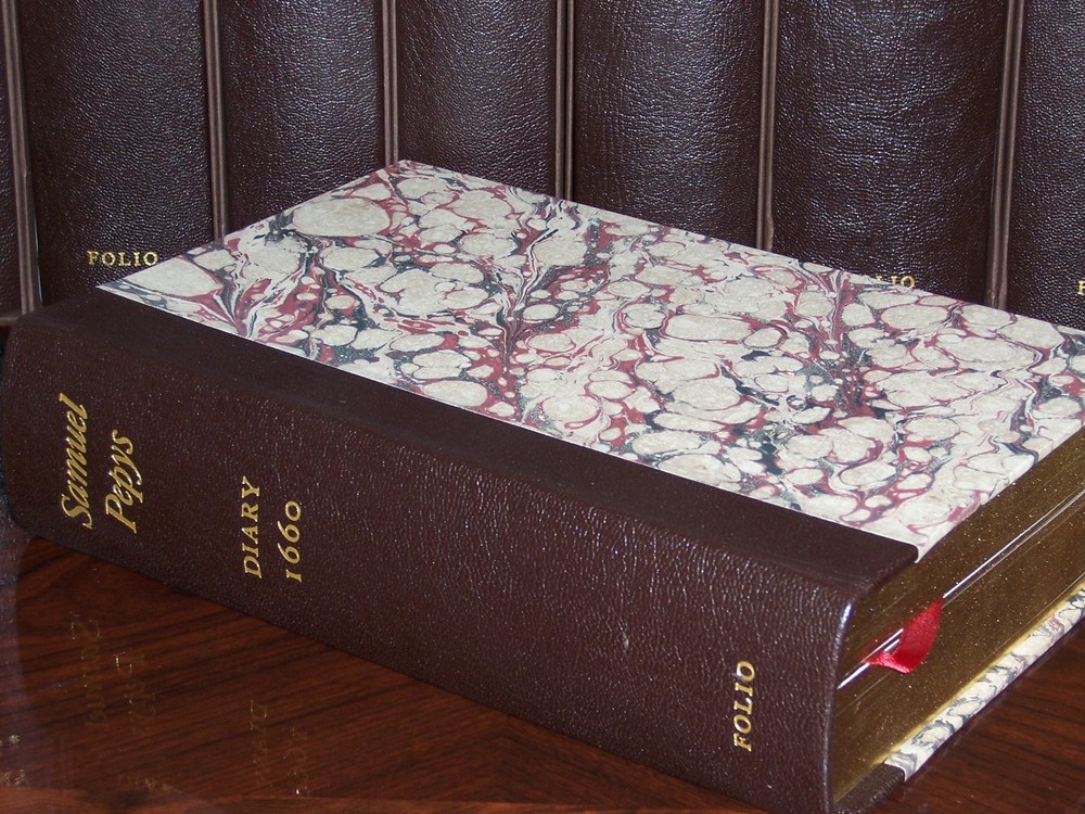 The most famous diary in the English language Folio Society The Diary of Samuel Pepys in 11 vols Limited to 1,000 copies A new and complete transcription edited by William Matthews and Robert Latham frontispiece artworks in full color out-of-print, do not miss out this good deal Copyright by The Folio Society Quarter-bound in the finest Nigerian goatskin leather, and blocked in gold. Hand marble paper sides by Ann Muir and Zerkall mould-made cream laid endpapers Printed on Caxton wove paper by Cambridge University Press Colour frontispieces and maps, ribbon markers Book edges stained maroon and gildedpaper The type on the spines is by William Caslon, the first of the great English type founders The eleven volumes are presented in individual slipcases LIST OF TITLES: a series in 11 volumes: 1. The Diary of Samuel Pepys, Vol. I: 1660 2. The Diary of Samuel Pepys, Vol. II: 1661 3. The Diary of Samuel Pepys, Vol. III: 1662 4. The Diary of Samuel Pepys, Vol. IV: 1663 5. The Diary of Samuel Pepys, Vol. V: 1664 6. The Diary of Samuel Pepys, Vol. VI: 1665 7. The Diary of Samuel Pepys, Vol. VII: 1666 8. The Diary of Samuel Pepys, Vol. VIII: 1667 9. The Diary of Samuel Pepys, Vol. IX: 1668-9 10. The Diary of Samuel Pepys, Vol. X: Index 11. The Diary of Samuel Pepys, Vol. XI: Companion CONDITION DESCRIPTION: Like new and Unread condition, slight wear to slipcase, books are fresh and like new, binding is tight, crisp & bright inside pages, and solid hardcover. This set could be a precious addition to your family library. SHIPPING / HANDLING: Book(s) will be handled/packed very safely, and shipped via USPS media mail with delivery confirmation.