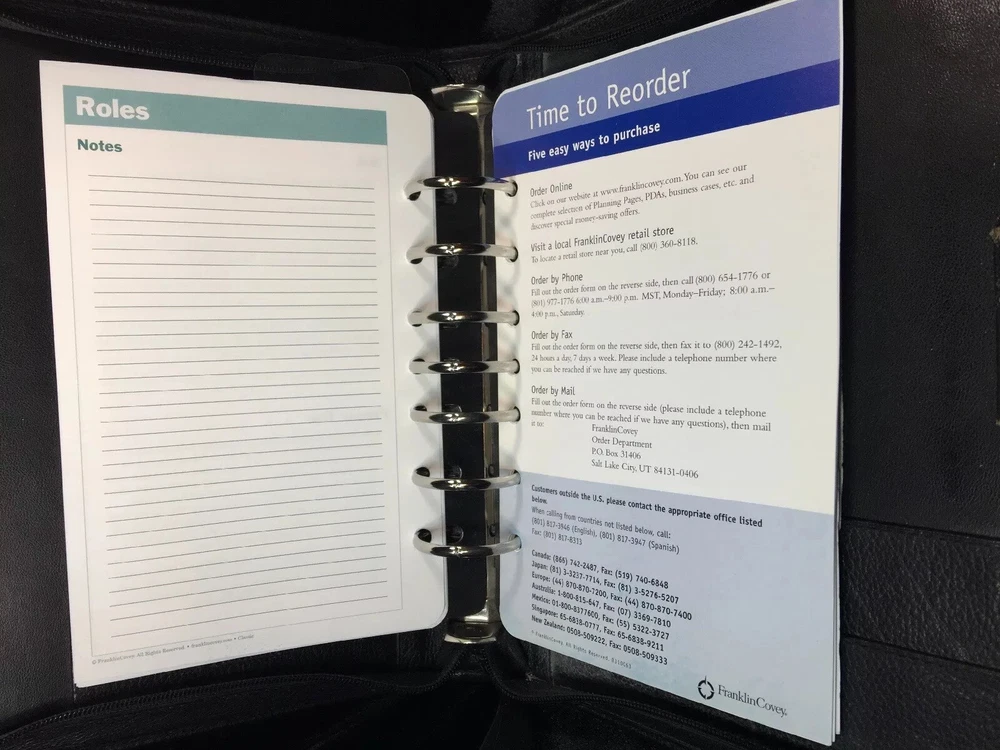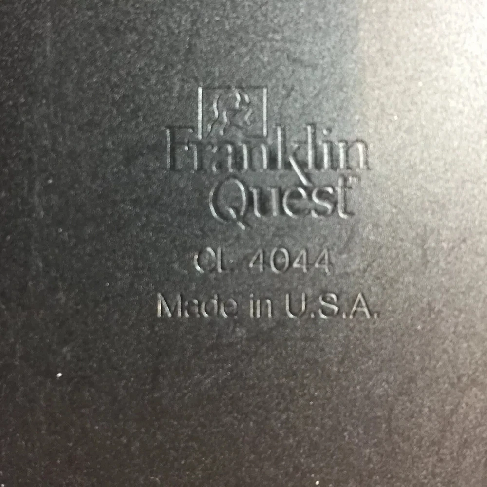 Vintage Franklin Quest Black Planner Journal Calendar 7- 1.5” rings CL4044 USA. Condition is Used. Shipped with USPS Priority Mail. Franklin Quest Binder Top Grain Black Leather 7 Rings USA~ Vintage Good pre-owned. Signs of previous wear and use. Zip around leather binder in black. Measures:- 11" H x 9" W x 2" D. Holds pages 5.5" x 8.5". Seven 1.5" W Rings. - Made of Top Grain Leather. - Interior Left Side - 1 medium size side entry slip pocket, 2 small inserts 2 pen holders- 1 on each side Ruler - Interior Right Side - 1 larger expandable slip pocket and 2 lower business card slip pockets. All items are professionally packed for safe arrival. Thank you for visiting my shop. Please choose “Ingebjorg” as a favorite shop to see new listings every day! Enjoy your purchase. US bookcase