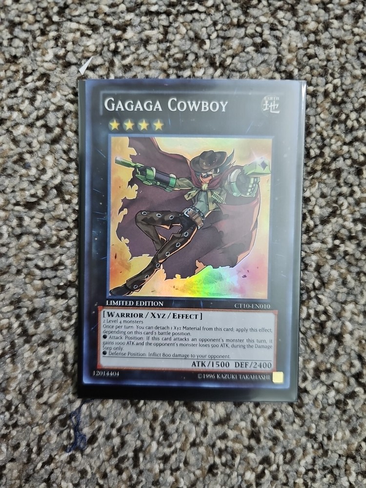 This limited edition Gagaga Cowboy card is a must-have for any Yu-Gi-Oh! TCG collector. With its Super Rare rarity and Earth attribute, this Xyz Effect card is sure to be a powerful addition to any deck. The card features the iconic Gagaga Cowboy character and was manufactured by Konami in 2013 as part of the 2013 Collectors Tins set. The card's defense/toughness is 2400 and its attack/power is 1500, making it a formidable opponent in battle. This card is in English language and has the card number CT10-EN010. It is perfect for fans of the game who are looking for a unique and rare card to add to their collection.