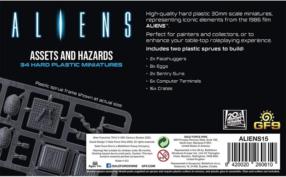The product is a board game by Gale Force Nine called "Aliens - Assets and Hazards." It includes 34 pieces made of plastic, with a colorful design inspired by the movie and science fiction theme. The game is designed for players aged 12 and above, and features a strategic gameplay where players must manage resources and interact with various assets and hazards to survive. The game is in English and released on October 11, 2023, offering a thrilling experience for fans of the Alien franchise.