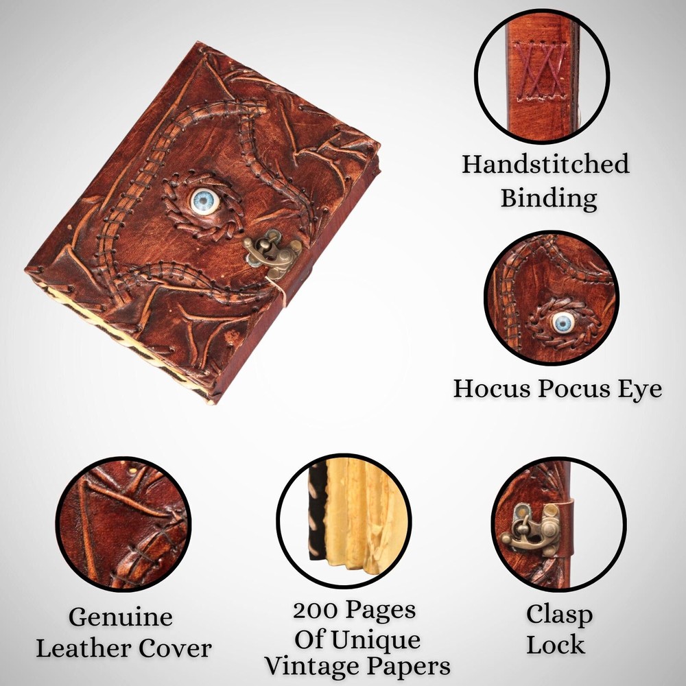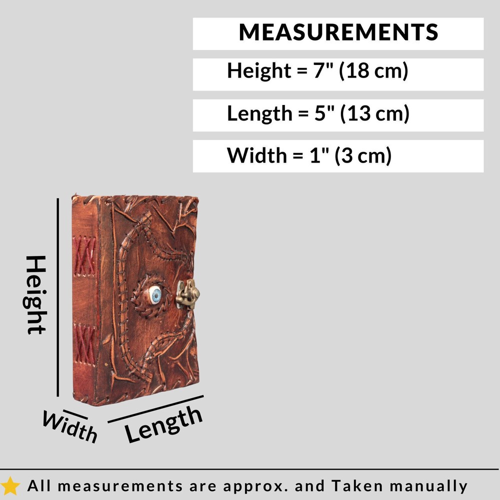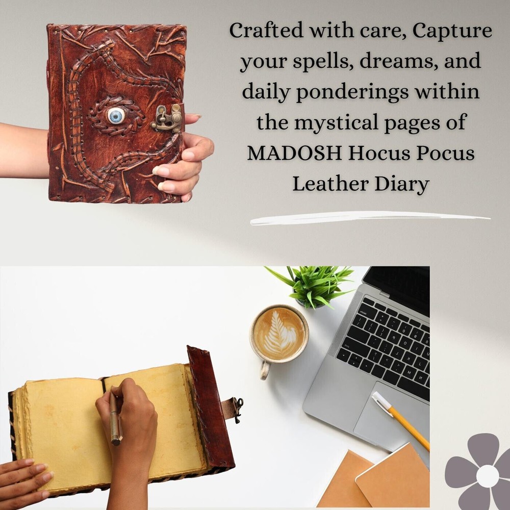 Welcome To MADOSH (Brand: Madosh- Mad Over ShoppingTM) Step into a world where magic and mysticism intertwine with our Mystical Whispers Leather Diary. The enchanting Hocus Pocus theme, combined with the protective power of the Evil Eye, creates a unique and captivating canvas for your thoughts and dreams. Perfect for those who embrace the mystical arts, this diary is a versatile companion for journaling, spellcasting, or simply capturing the magic of your daily life. The Evil Eye emblem, a symbol of spiritual protection, adds an extra layer of enchantment to this diary. ORDER YOURS TODAY AND LET THE MAGIC UNFOLD! SIZE: Height: 7” (18 cm) | Length: 5” (13 cm) | Width: 1” (3 cm) SPECIFICATIONS: Genuine Leather Handmade Clasp closure Hocus pocus with evil eye Country of origin: India Pages: 200 NOTE: 100% Genuine leather diary. Color may slightly vary from pictures. Paper used in diary are 100% recycled cotton acid free paper.