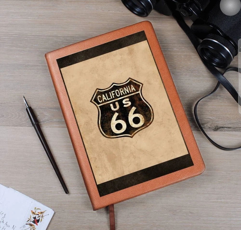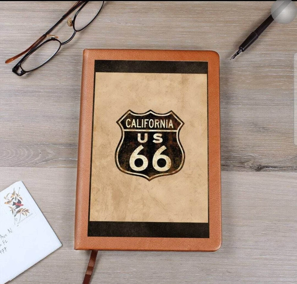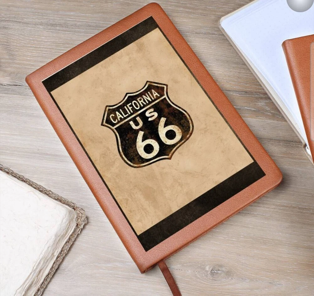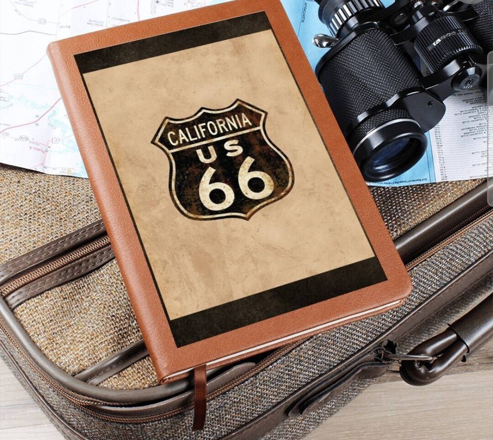 Crafted from the finest leather, this vintage custom journal emulates the spirit of the historic Route 66. Featuring an antique paper background and adorned with the iconic Route 66 highway symbol, including the distinctive California state road sign at the top, this journal exudes a sense of adventure and nostalgia. The dark brown and tan letters add an antique aesthetic, complementing the overall tones of browns and tan. It's the perfect piece for capturing your memories and experiences on the open road. What better way to quiet your racing mind than with a clean slate? The Graphic Leather Journal is the perfect accessory for personal reminders, goal setting, or just getting organized. This vegan leather notebook allows you to write on the go thanks to its lightweight design. Plus, swapping between your important pages is easy thanks to the ribbon bookmark and elastic closure band. The unique front is professionally printed with vibrant colors - making your design last as long as your to-do list! Your journal will be custom made upon order and feature a professionally printed design. This present makes for a truly unique and sentimental gift that will be treasured! Product specifications: Vegan leather cover W 5.8" x L 8.5" x ⅝” (14.73cm x 21.59cm x 1.6cm) 100 sheets / 200 lined pages Brown elastic closure band Ribbon bookmark Weight: 11.33 ounces Each order is lovingly packaged and shipped with care! Powered by ExportYourStore.com