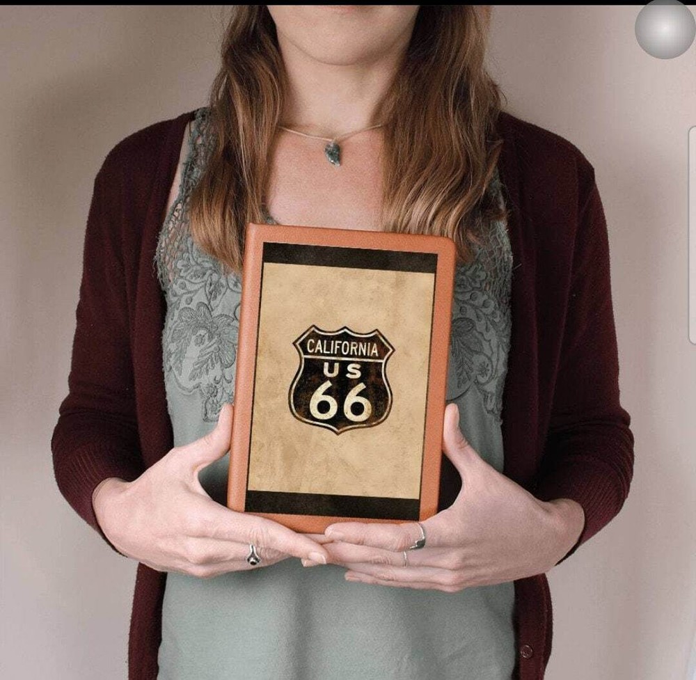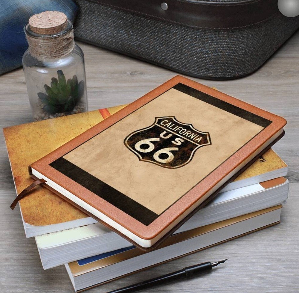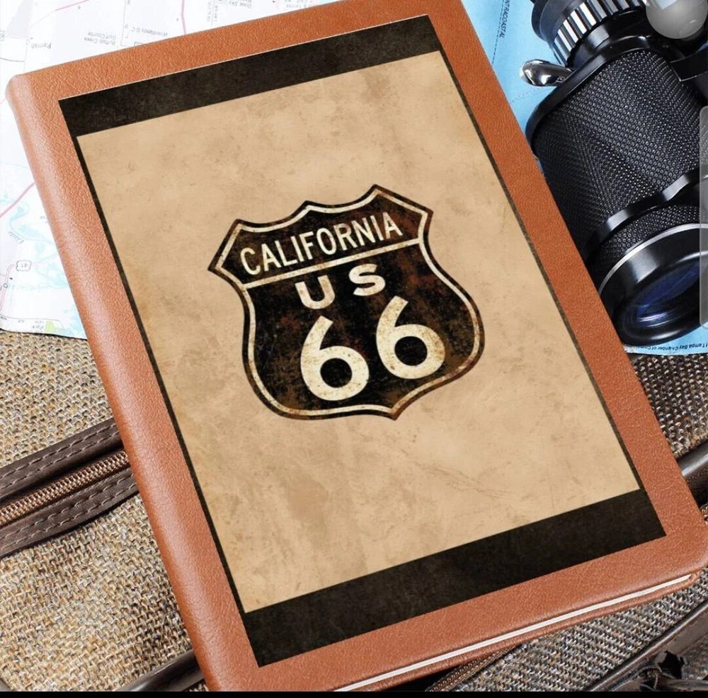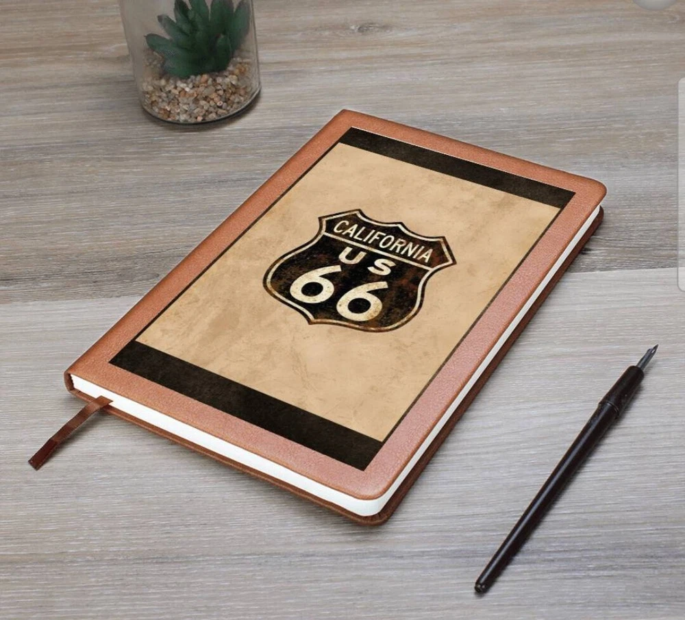 Crafted from the finest leather, this vintage custom journal emulates the spirit of the historic Route 66. Featuring an antique paper background and adorned with the iconic Route 66 highway symbol, including the distinctive California state road sign at the top, this journal exudes a sense of adventure and nostalgia. The dark brown and tan letters add an antique aesthetic, complementing the overall tones of browns and tan. It's the perfect piece for capturing your memories and experiences on the open road. What better way to quiet your racing mind than with a clean slate? The Graphic Leather Journal is the perfect accessory for personal reminders, goal setting, or just getting organized. This vegan leather notebook allows you to write on the go thanks to its lightweight design. Plus, swapping between your important pages is easy thanks to the ribbon bookmark and elastic closure band. The unique front is professionally printed with vibrant colors - making your design last as long as your to-do list! Your journal will be custom made upon order and feature a professionally printed design. This present makes for a truly unique and sentimental gift that will be treasured! Product specifications: Vegan leather cover W 5.8" x L 8.5" x ⅝” (14.73cm x 21.59cm x 1.6cm) 100 sheets / 200 lined pages Brown elastic closure band Ribbon bookmark Weight: 11.33 ounces Each order is lovingly packaged and shipped with care! Powered by ExportYourStore.com