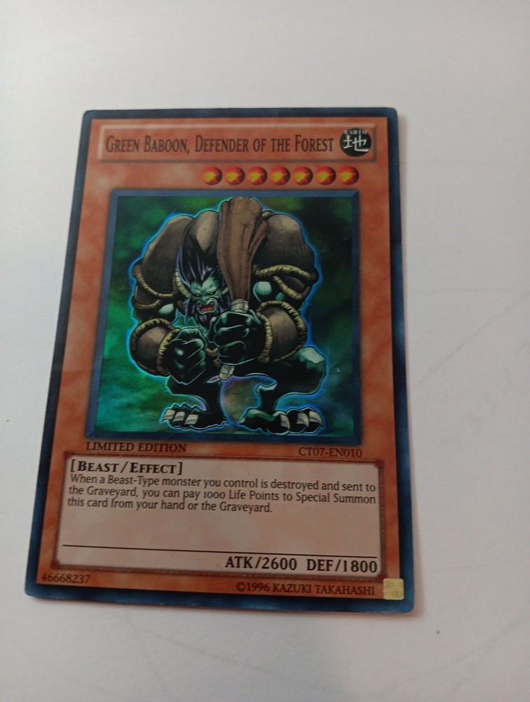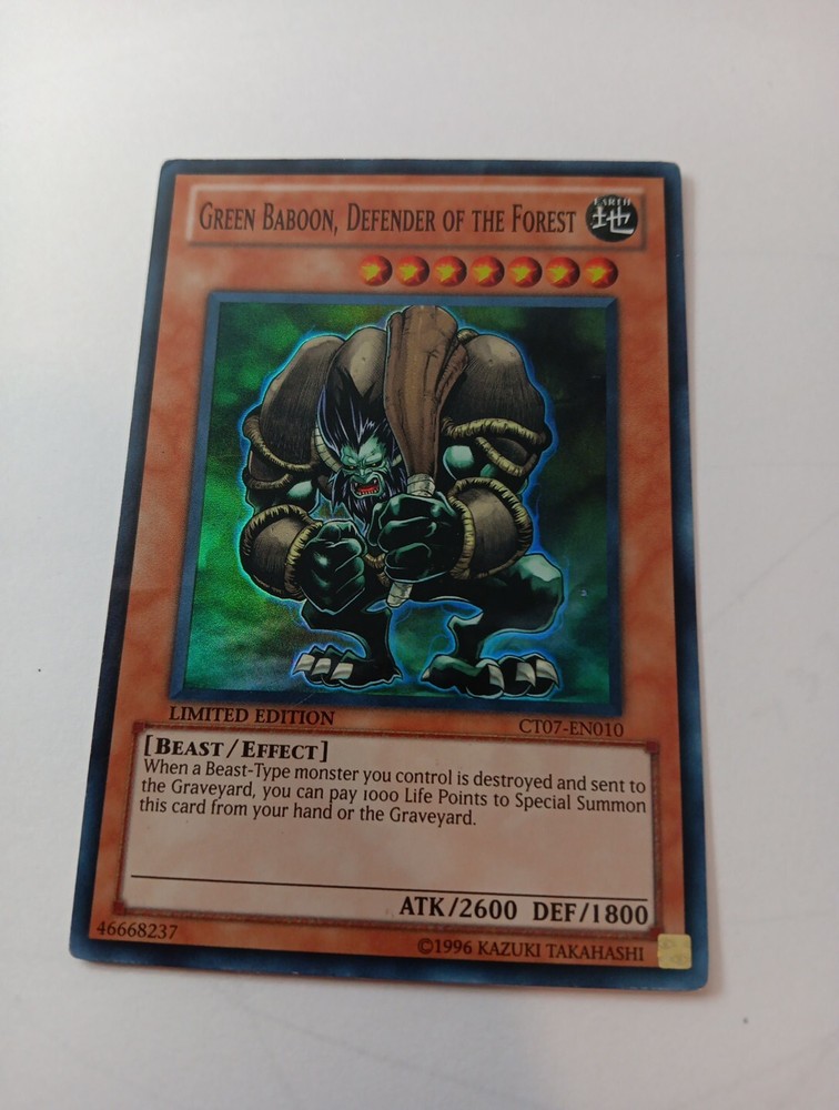 This limited edition Green Baboon, Defender of the Forest card is a must-have for any Yu-Gi-Oh! TCG collector. With a super rare rarity and effect card type, this card features a beast creature/monster type with 2600 attack/power and 1800 defense/toughness. The card is in English language and was manufactured by Konami in 2010 for the 2010 Collectors Tins set. The card's name is Green Baboon, Defender of the Forest and it has the card number CT07-EN010. It belongs to the Earth attribute/MTG:Color category and is a great addition to any collection. Don't miss out on the chance to own this unique card!