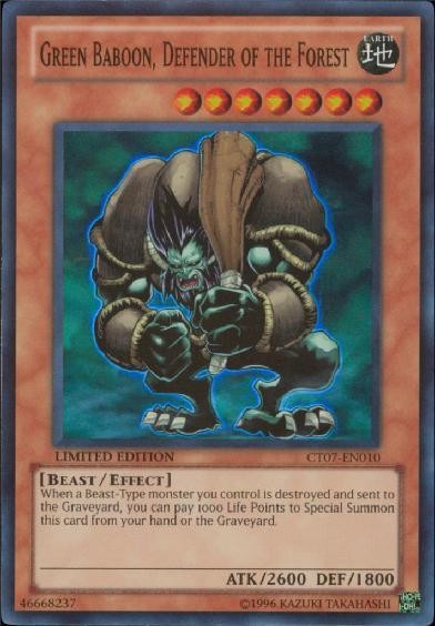 Green Baboon, Defender of the Forest - CT07-EN010 - Super Rare - Limited Edition Image is a stock photo of the card. You will receive the card in Moderately Played condition Condition: Moderately Played ATK/DEF : 2600/1800 Attribute : Earth Card Number : CT07-EN010 Card Rules : No rulings available for this card. Card Text : When a Beast-Type monster you control is destroyed and sent to the Graveyard, you can pay 1000 Life Points to Special Summon this card from your hand or Graveyard. Card Type : Effect Monster Edition : Limited Level : 7 Monster Type : Beast Name : Green Baboon, Defender of the Forest Passcode : 46668237 Rarity : Super Rare Set : 2014 Collectors Tin Be sure to visit our store for a wide selection of your favorite cards! We are running specials RIGHT NOW!! Shipping Options: ~Ships in a regular white envelope with a stamp for FREE! (THERE IS NO TRACKING INFORMATION AVAILABLE FOR THE ABOVE METHOD. SHIPPING TIME IS 4-10 BUSINESS DAYS) ~Ships in a TRACKEDbubble mailer for $5.99! ~Shipments are handled same or next business day. ~FREE SHIPPING for each additional card, so shop around our store!