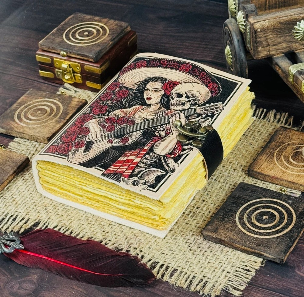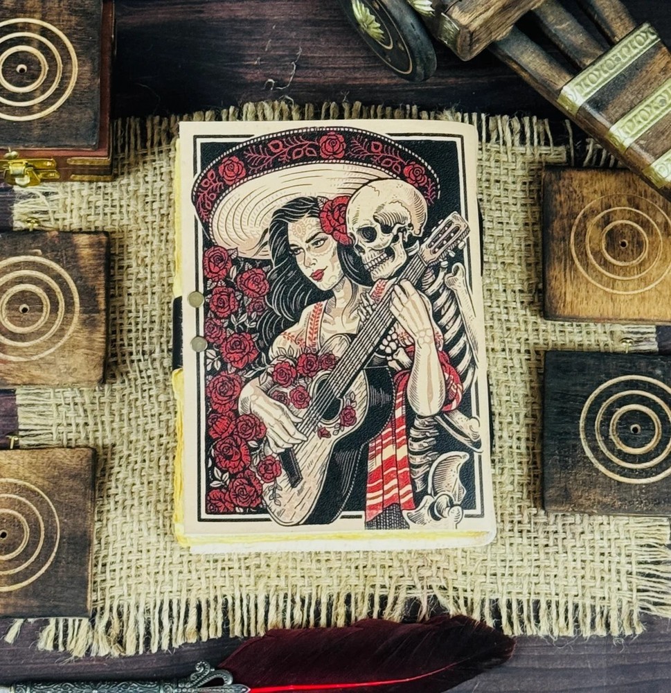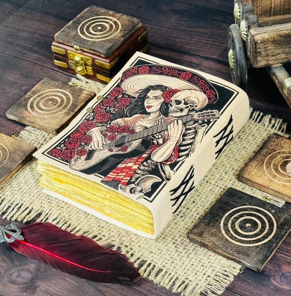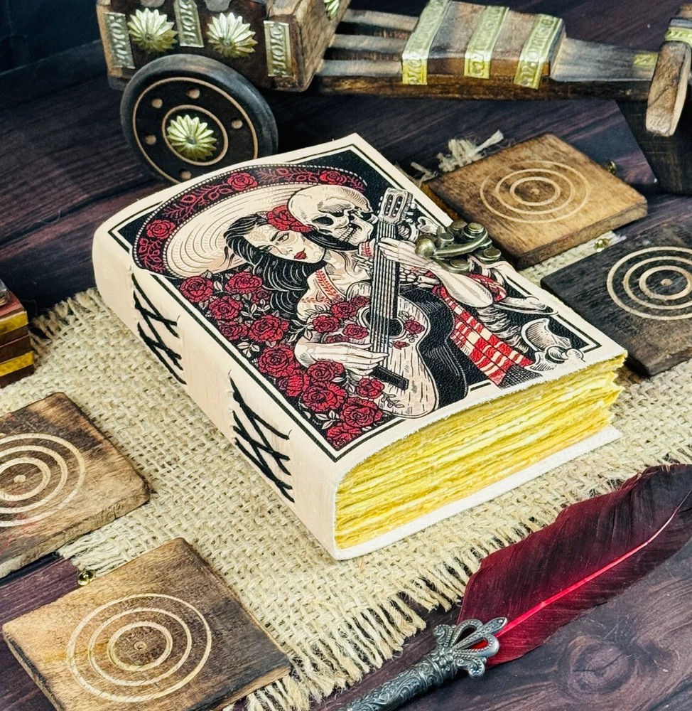 Premium Quality Leather: Our leather journals are crafted using top-grade, genuine leather that not only looks stunning but also ensures durability and longevity. UV Printing Technology: We employ state-of-the-art UV printing technology to adorn our leather journals with intricate designs, patterns, or personalization. This process offers vibrant colors and sharp details that won't fade or wear over time. Aesthetic Appeal : The UV printing adds a touch of elegance and sophistication to each leather journal, making it a stylish accessory that stands out from the crowd. Smooth and Acid-Free Pages: Our journals feature high-quality, acid-free paper that is a delight to write on. The smooth texture ensures a seamless writing experience without any ink bleed-through. Versatile Use: Whether you use it as a personal diary, sketchbook, travel journal, or a thoughtful gift, our UV print leather journals cater to a variety of needs and preferences. Great for Special Occasions: Commemorate milestones, anniversaries, or special events with a custom UV print leather journal that captures the essence of the moment. Perfect Gift Choice: Our UV print leather journals make thoughtful and cherished gifts for friends, family, colleagues, or anyone who appreciates the art of writing and appreciates beautiful craftsmanship. Environmental Consciousness: We prioritize sustainability in our materials and production processes, ensuring our journals are eco-friendly and responsible. Timeless Keepsake: As a combination of premium materials, cutting-edge printing, and timeless design, our UV print leather journals become cherished keepsakes that preserve memories for generations. Experience the unmatched elegance and craftsmanship of our UV print leather journals, and elevate your writing and gifting experience to a whole new level. Nautical design, The lovers Leather Journal, Intricate Sugar skull cover, Tarot card enthusiasts, Eco-friendly pages, 200 deckle edge pages, Recycled cotton, Luxurious writing experience, Sustainable writing experience, Handmade craftsmanship, Handcrafted journal, Unique work of perfection, C-Lock security, Style and privacy, Customized experience, Comfortable writing experience